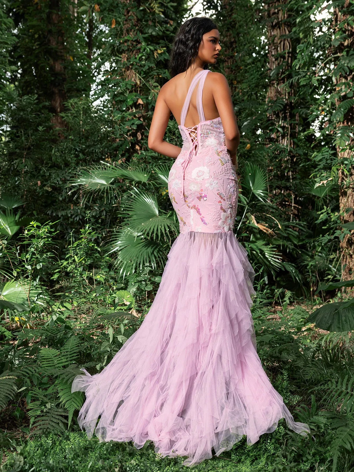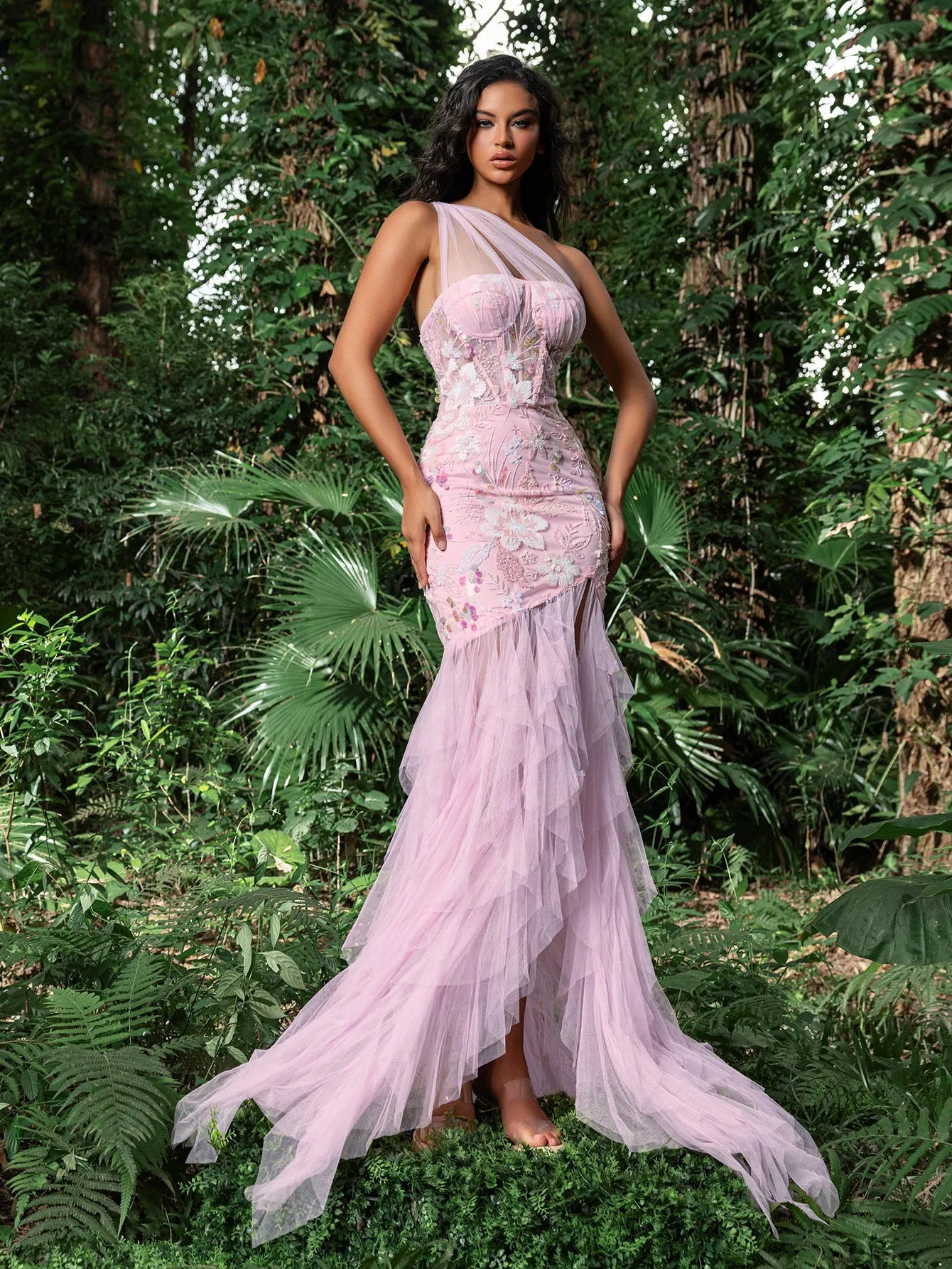 Step into a world of elegance with this enchanting one-shoulder gown. This breathtaking dress features a unique lace-up back design and delicate one-shoulder tulle drape, creating a sophisticated and graceful look. The fitted bodice is adorned with intricate floral appliqués and beadwork, adding a touch of sparkle and charm. The gown flows into a dramatic mermaid silhouette with a cascading tulle train and a thigh-high slit for added allure. Perfect for making a grand entrance at weddings, evening galas, and special occasions, this gown ensures you stand out with elegance and poise.