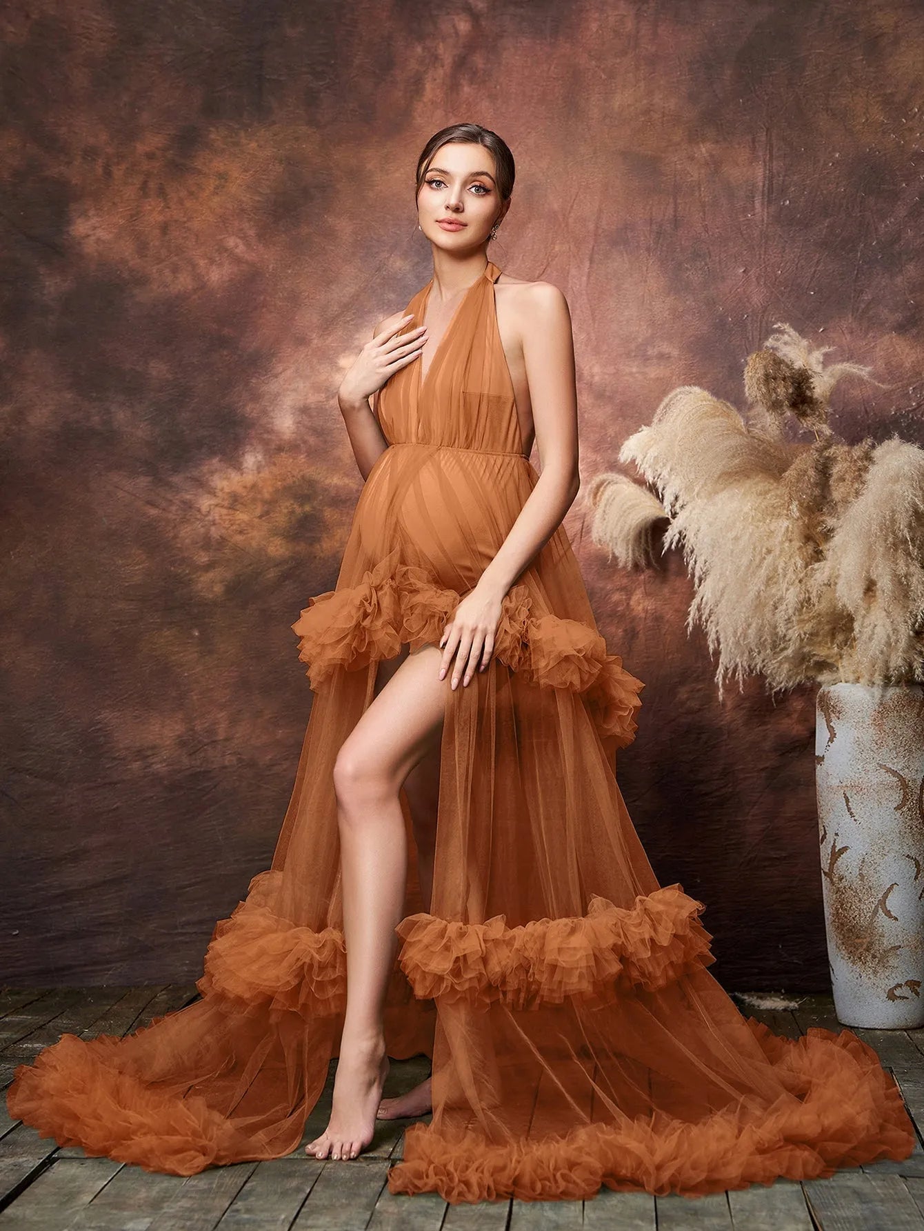 Make an unforgettable statement with our ethereal maternity gown, designed for the modern mother-to-be. This gown features a daring halter neckline that accentuates the shoulders and back, cascading into a flowing, sheer skirt adorned with romantic ruffles. The delicate mesh fabric gently caresses your curves, offering both comfort and a captivating silhouette that flatters your baby bump.