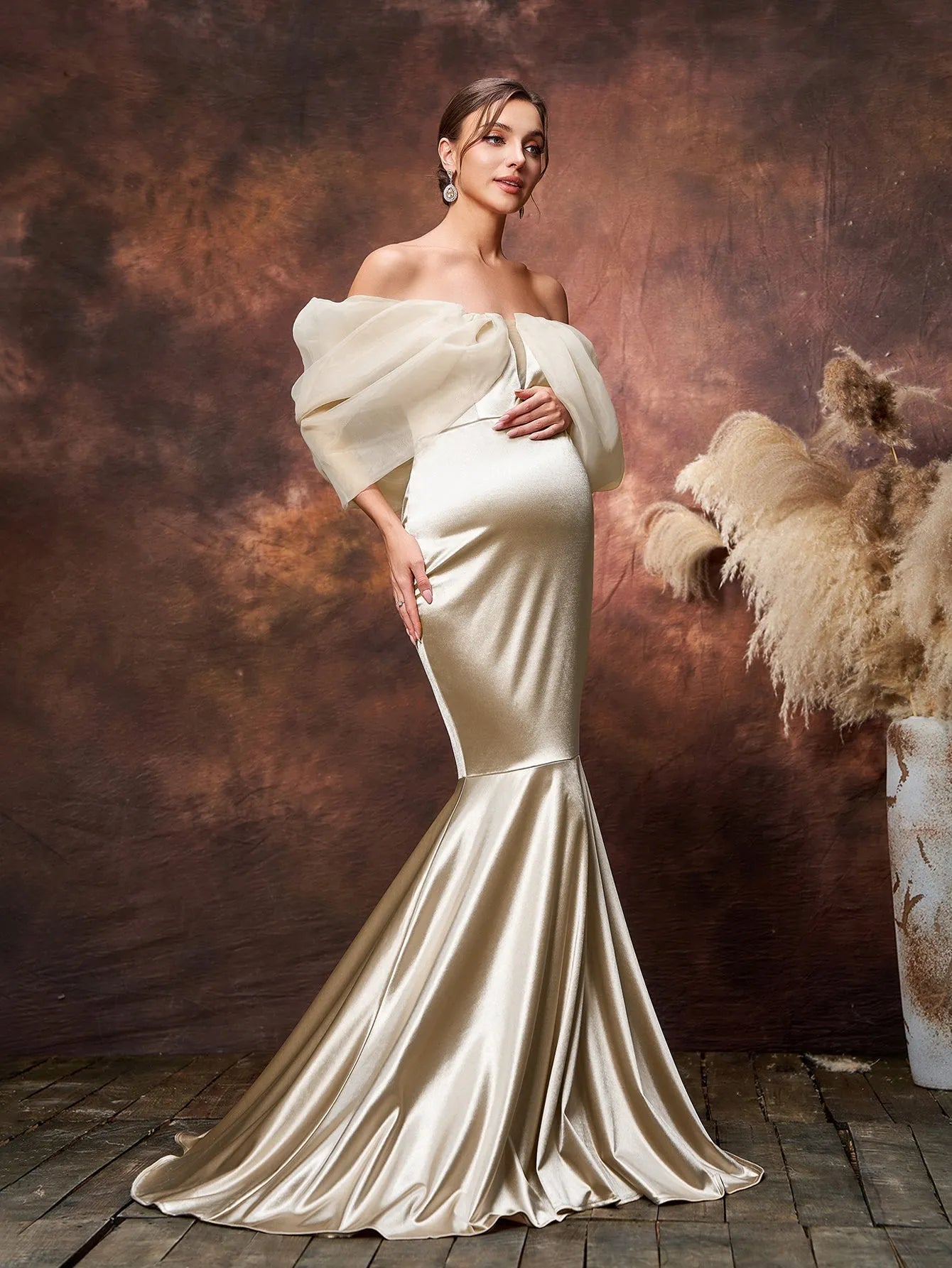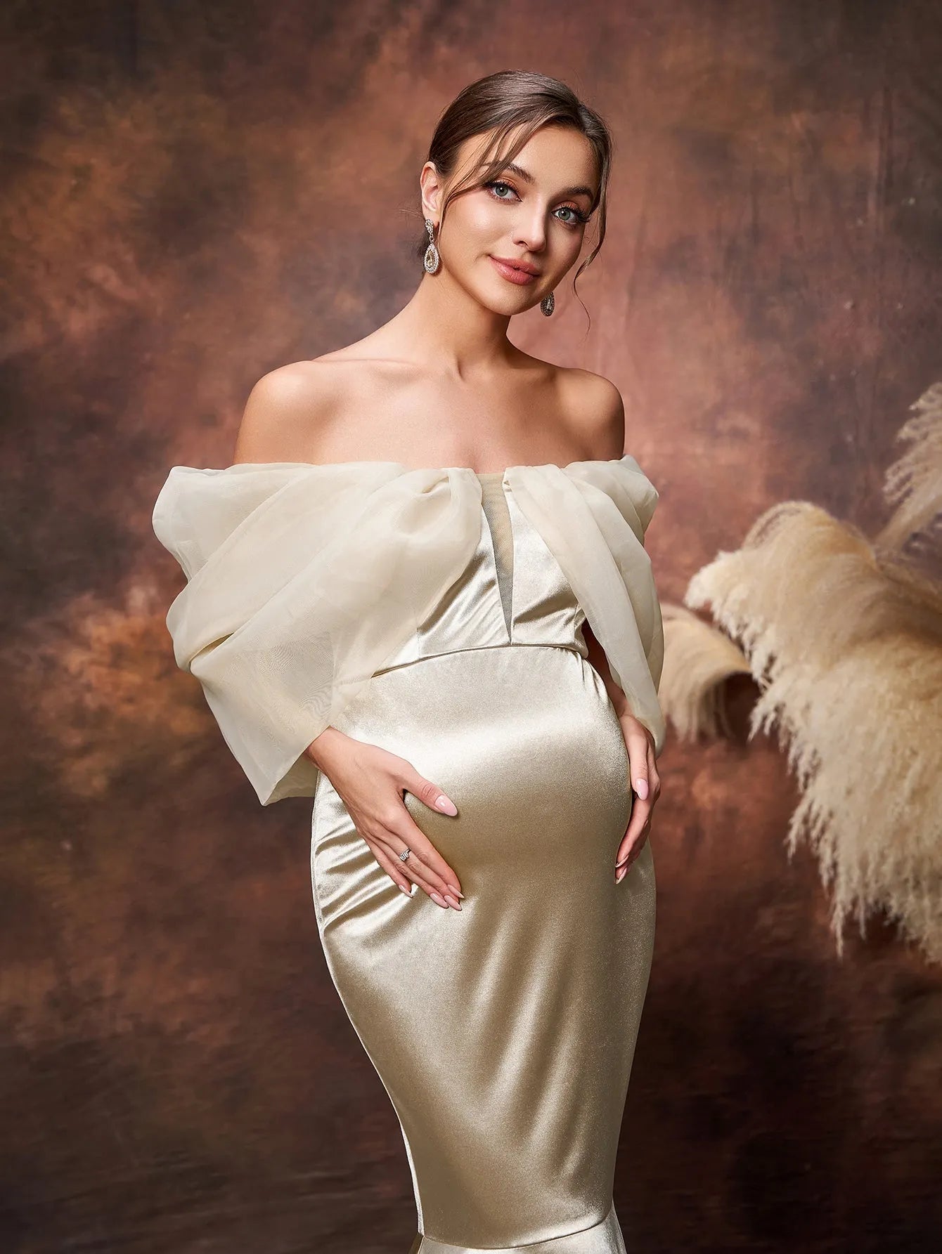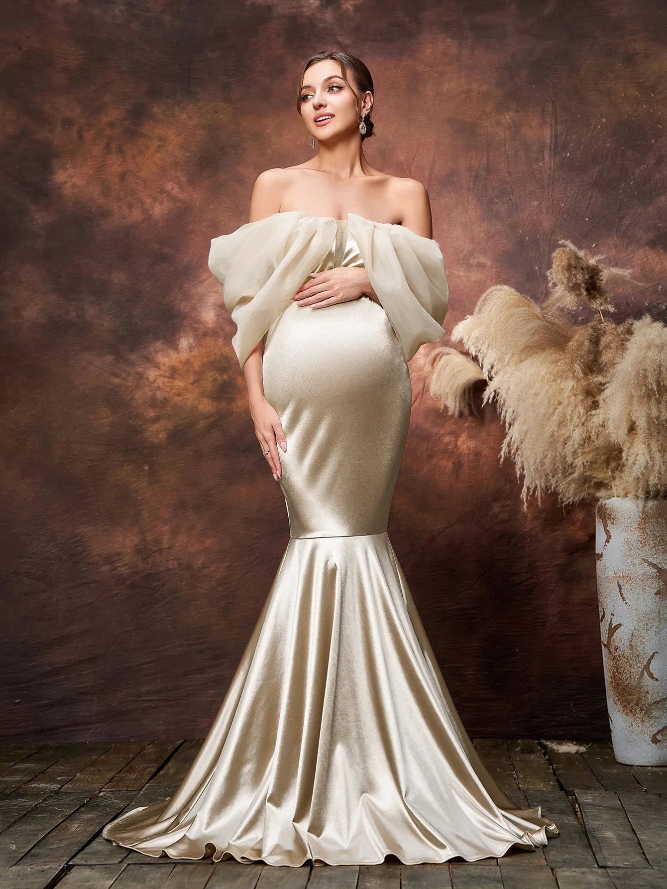 Elevate your elegance with our glamorous maternity gown, crafted to make you feel like a true queen during this special time. This gown showcases a stunning off-shoulder design, featuring voluminous organza sleeves that drape gracefully over your arms, adding a dramatic yet refined touch. The bodice is sleek and smooth, perfectly hugging your figure before flaring out into a luxurious mermaid silhouette that cascades to the floor. Ideal for making a grand entrance at your maternity photo shoots, baby showers, or any elegant event, this dress will leave a lasting impression.