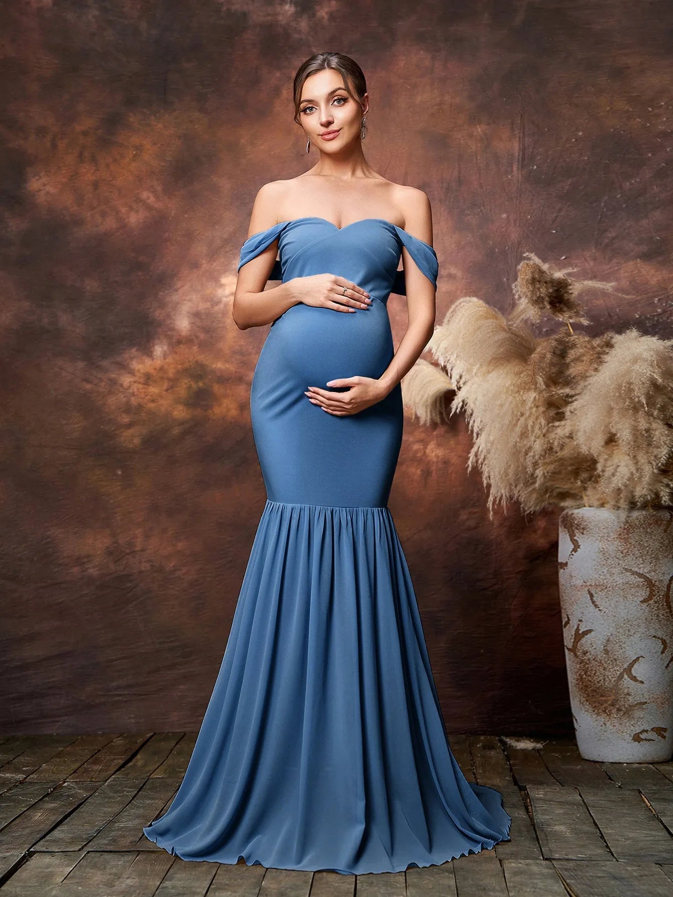 Celebrate your pregnancy in timeless elegance with this stunning maternity gown. The dress features a sophisticated off-the-shoulder neckline that beautifully frames your shoulders and collarbone, complemented by a form-fitting bodice that accentuates your baby bump. The sleek mermaid silhouette flows into a graceful, floor-length chiffon skirt, adding a touch of drama with its subtle train. Crafted from soft, stretchy knit fabric, this gown ensures comfort without compromising on style.