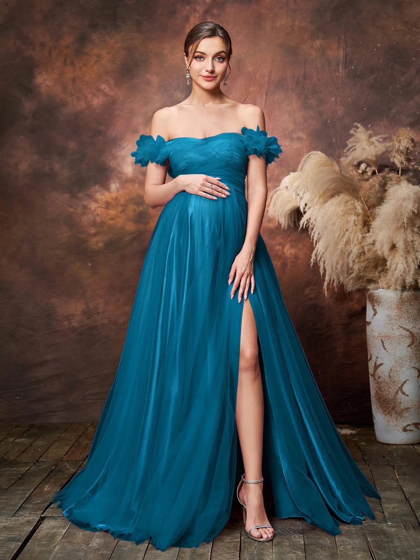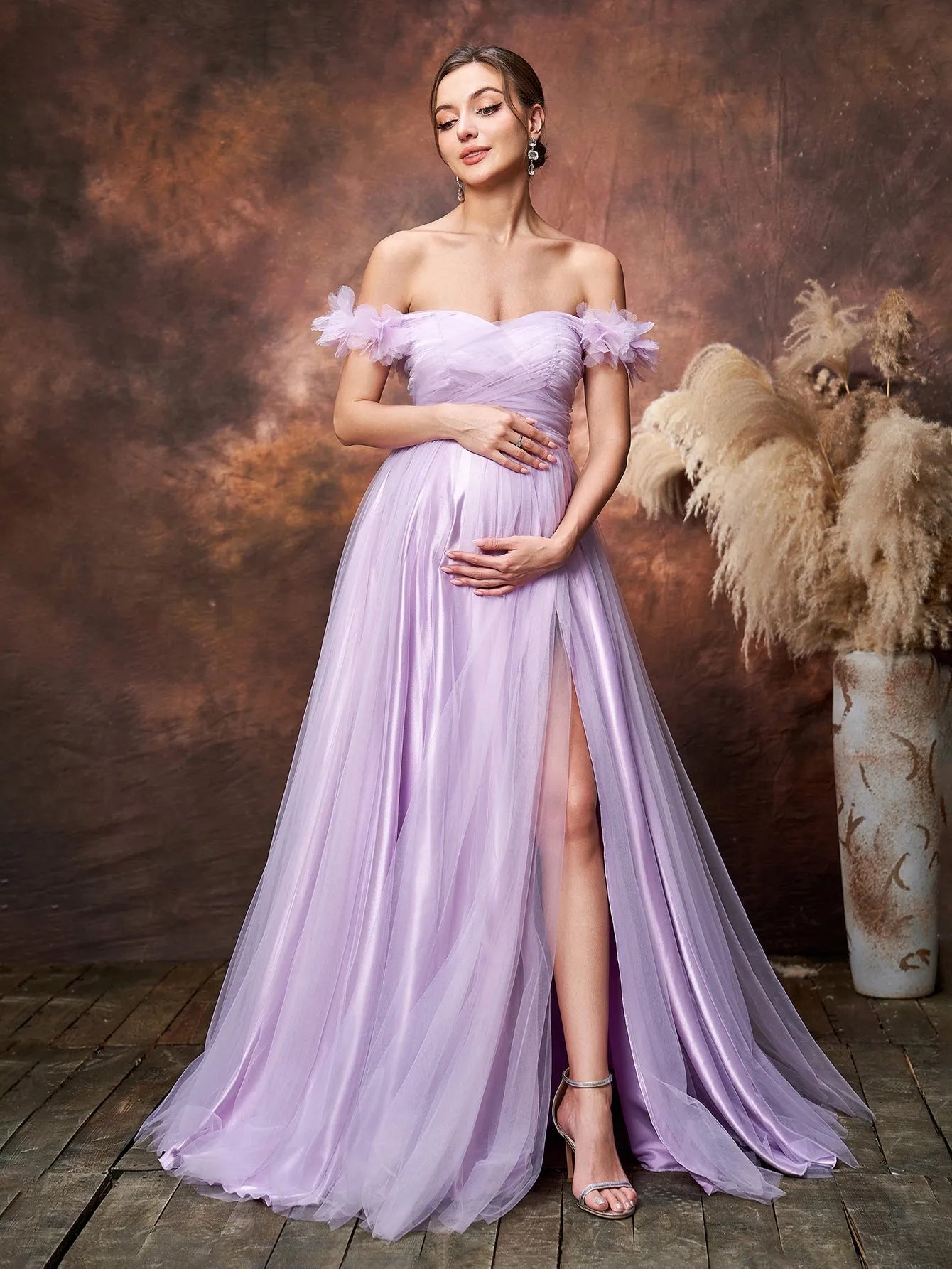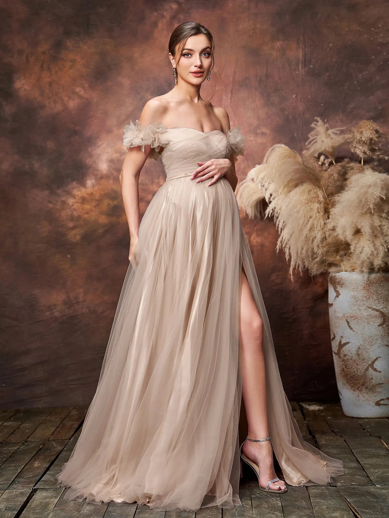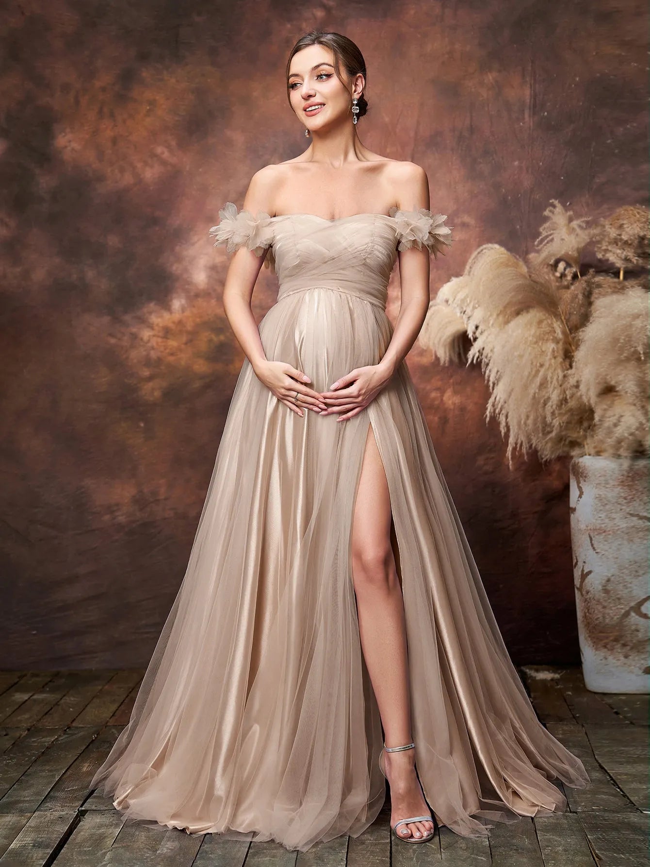 Make a breathtaking entrance with our exquisite maternity gown, designed to celebrate your beauty during this special time. The gown features an off-shoulder neckline adorned with delicate floral appliqués and a figure-flattering empire waist that gracefully drapes over your bump, ensuring comfort and elegance. The soft tulle fabric creates a dreamy silhouette, enhanced by the flowing skirt, which gently sways with every step.