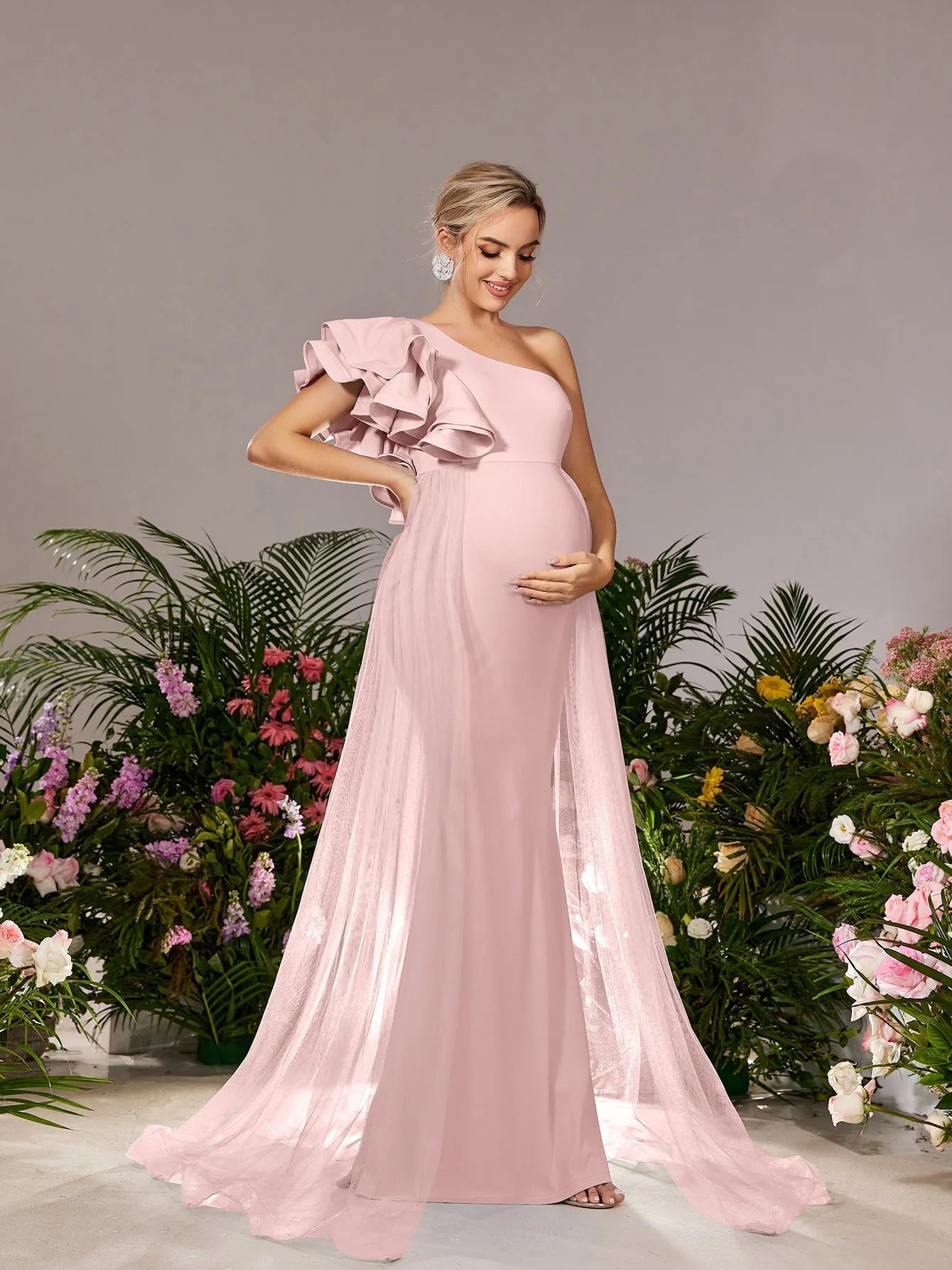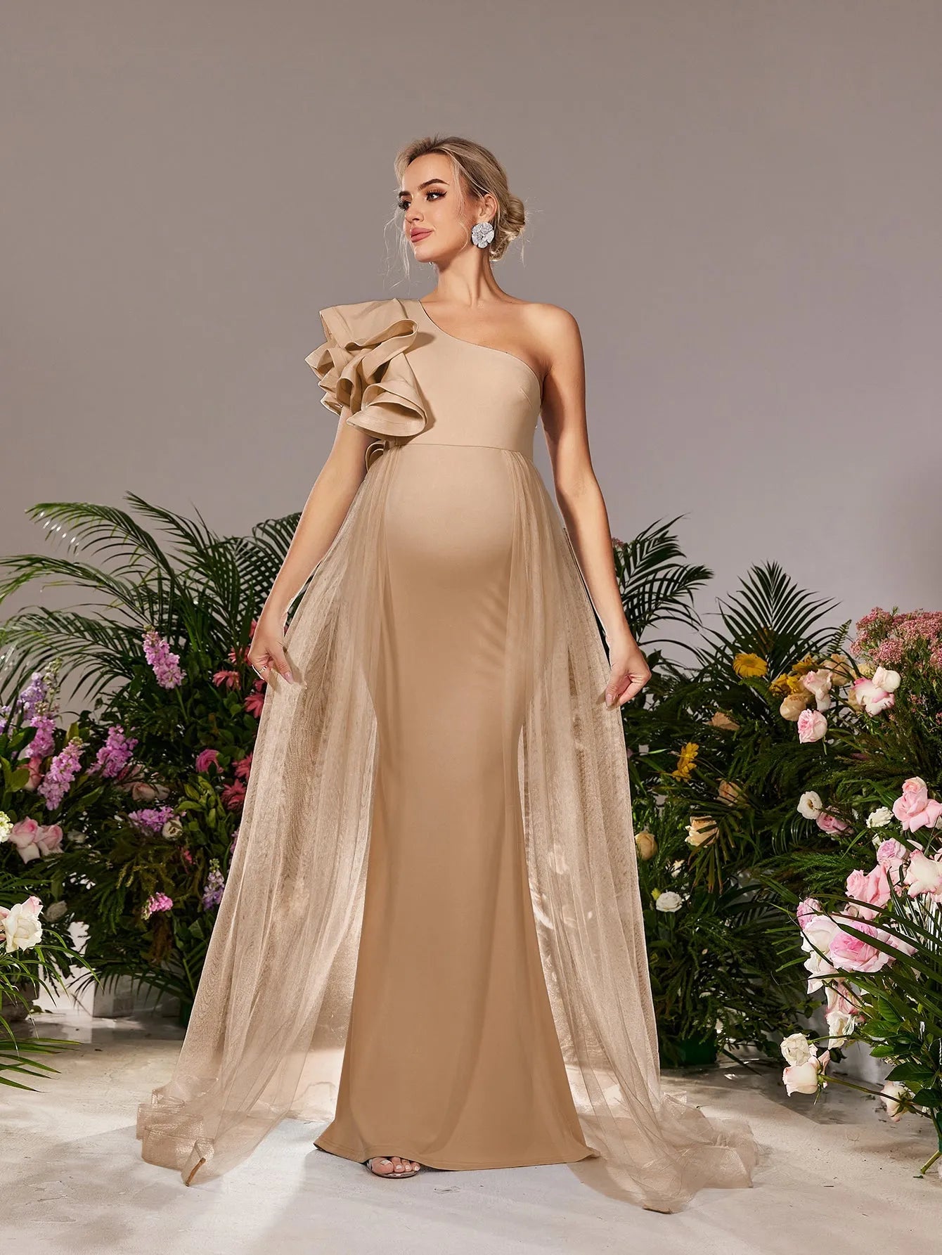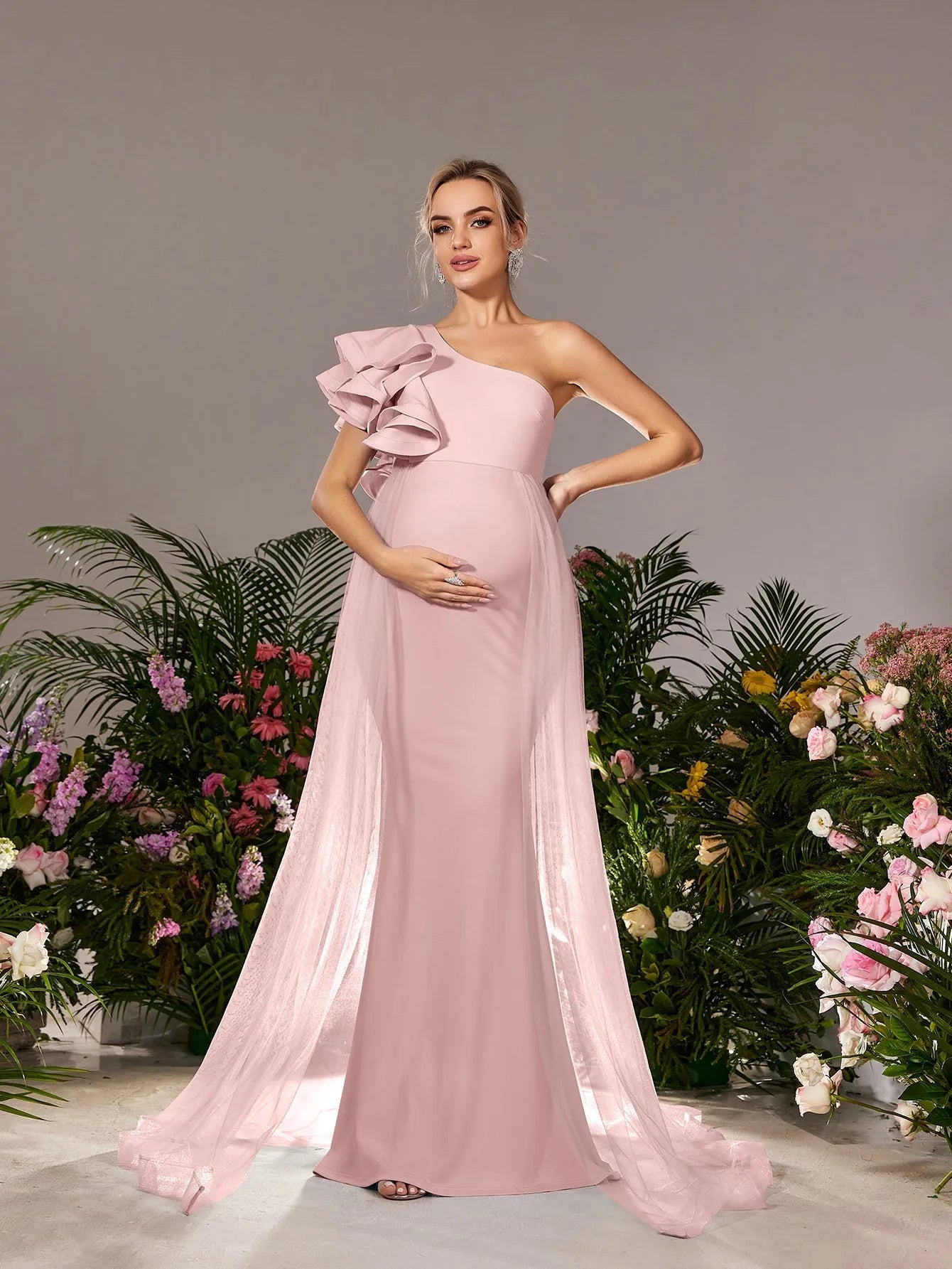 Make a breathtaking entrance with our exquisite maternity gown, designed to celebrate your beauty during this special time. The gown features a one-shoulder neckline adorned with a dramatic ruffle, adding a touch of elegance and flair. The figure-flattering empire waist gracefully drapes over your bump, ensuring both comfort and sophistication. The smooth knit fabric, combined with airy mesh details that cascade from the shoulder, creates a dreamy silhouette that flows into a subtle train.