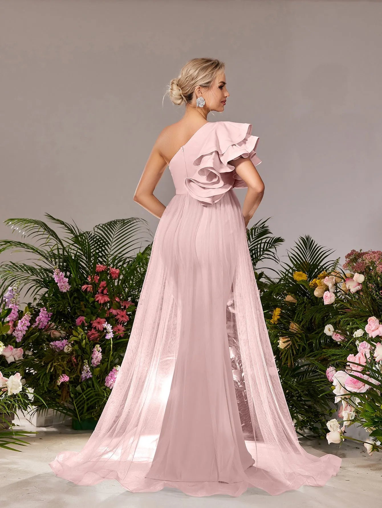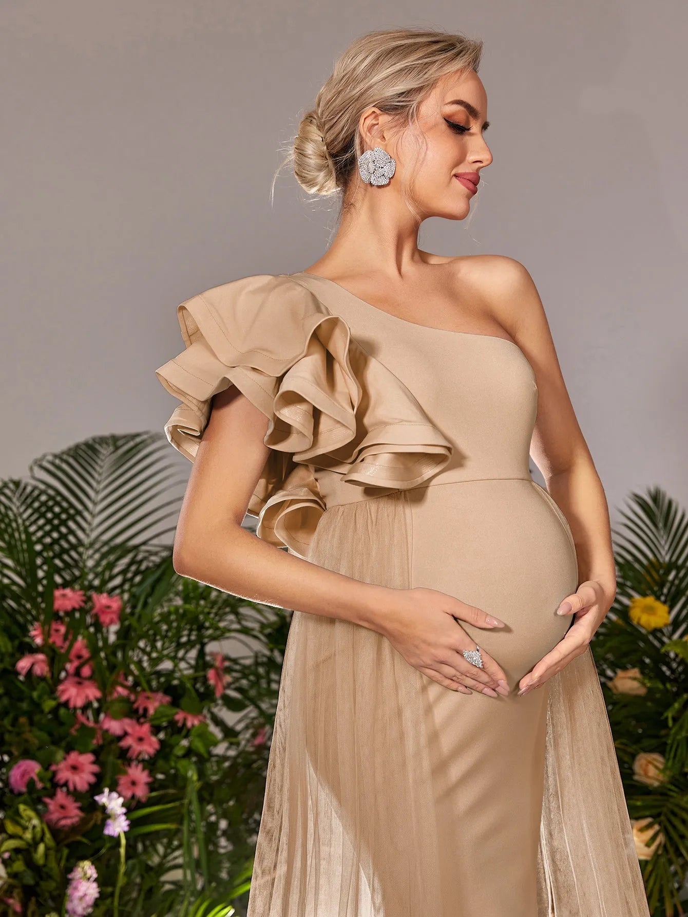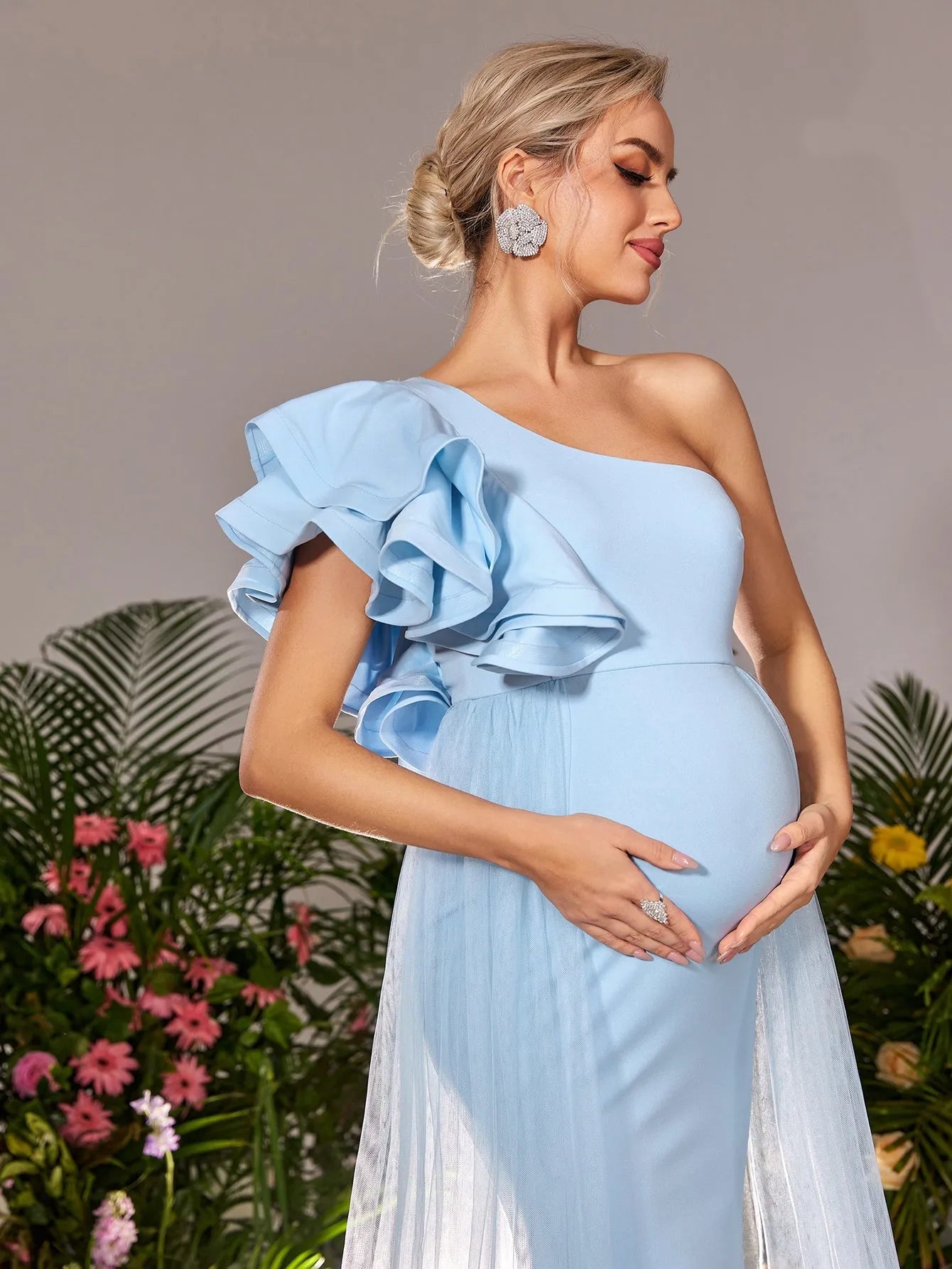 Make a breathtaking entrance with our exquisite maternity gown, designed to celebrate your beauty during this special time. The gown features a one-shoulder neckline adorned with a dramatic ruffle, adding a touch of elegance and flair. The figure-flattering empire waist gracefully drapes over your bump, ensuring both comfort and sophistication. The smooth knit fabric, combined with airy mesh details that cascade from the shoulder, creates a dreamy silhouette that flows into a subtle train.