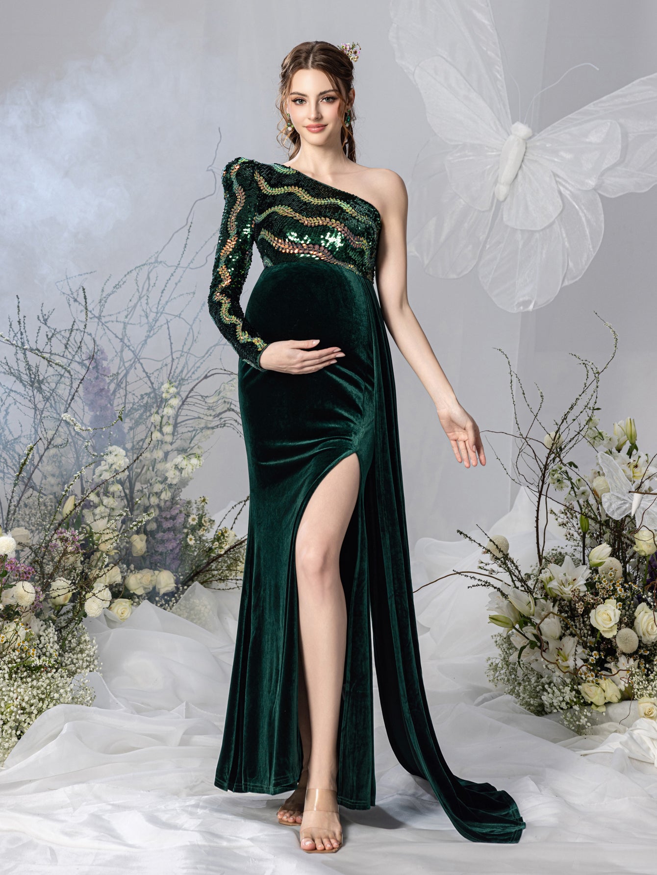 Embrace your elegance in our stunning maternity gown, crafted to highlight your beauty during this precious period. The gown boasts a one-shoulder neckline and a flattering silhouette that gracefully accommodates your growing bump, ensuring both comfort and sophistication. The rich velvet fabric creates a luxurious feel, accentuated by intricate beaded embellishments along the shoulder, which cascade down the gown.