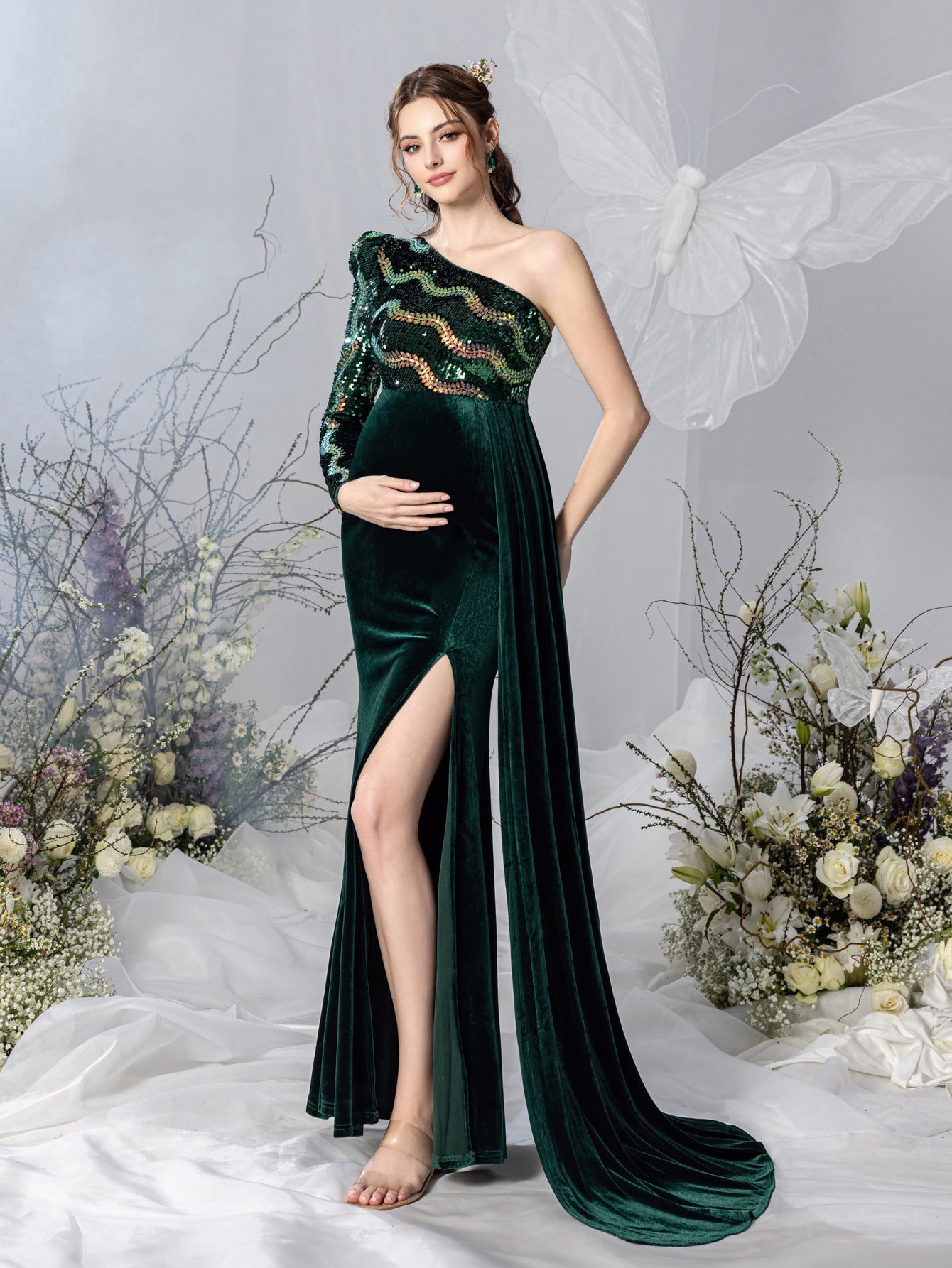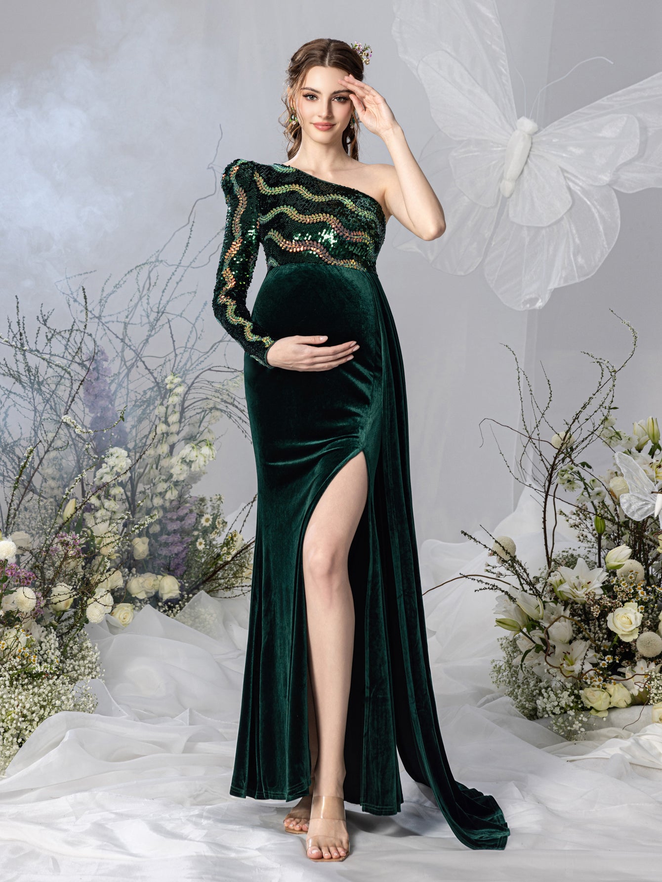 Maternity One Shoulder Split Mermaid Hem Contrast Sequin Velvet Evening Dress