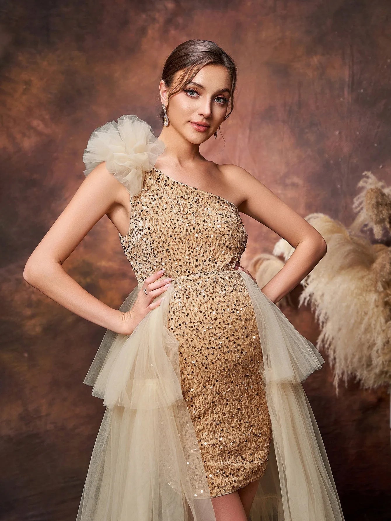 Step into the spotlight with our stunning maternity gown, exquisitely crafted to enhance your radiance during this special chapter of your life. This gown features a one-shoulder neckline adorned with a floral tulle accent, adding a touch of sophistication and elegance. The body-hugging silhouette beautifully embraces your curves, while the sparkling sequin bodice exudes glamour. The gown transitions into a layered tulle skirt that cascades into a soft, flowing train, ensuring you make a grand entrance.