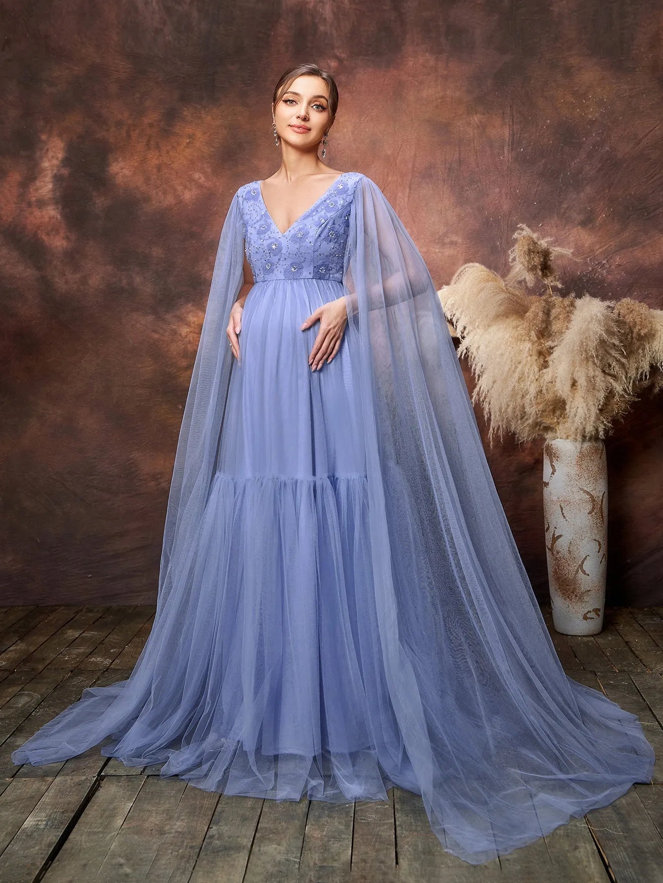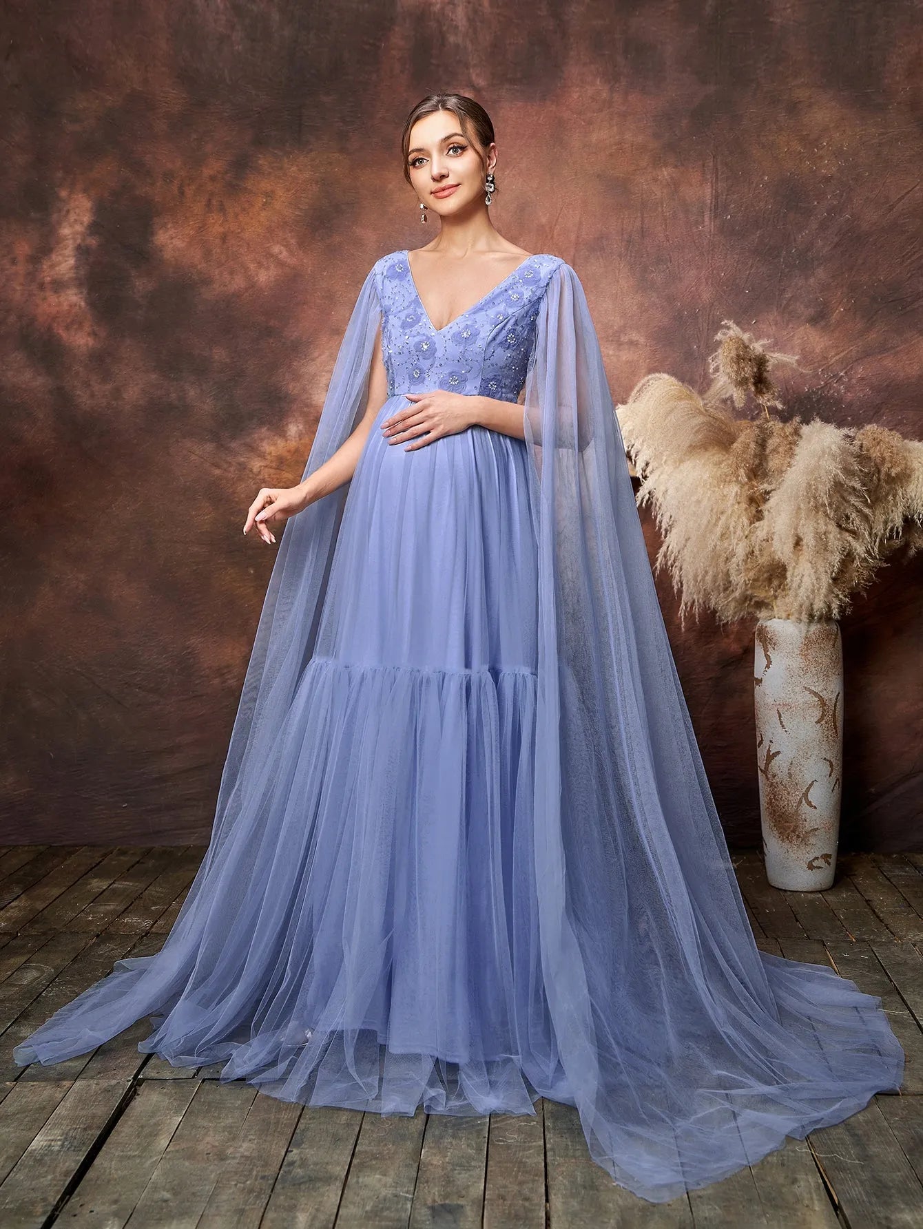 Celebrate elegance and maternal grace with this enchanting maternity gown, designed for the modern mother-to-be who cherishes both style and comfort. This exquisite piece features delicate floral appliqué embellishments on the bodice, adding a touch of sophistication and charm. The deep V-neckline complements the gentle empire waist, creating a flattering silhouette that celebrates the beauty of pregnancy. Flowing gracefully from the waist, a soft tulle skirt extends into a gentle train, accompanied by ethereal cape sleeves that add a whimsical and dramatic effect.