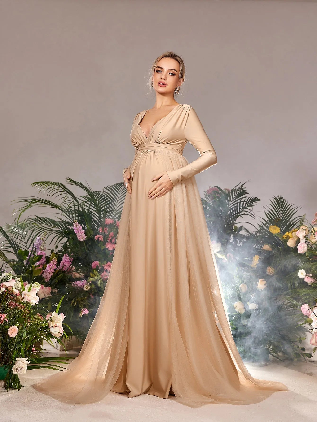 Step into elegance with our stunning maternity gown, designed to make you feel radiant during your special moments. This gown features a deep V-neckline that highlights your décolletage, complemented by long fitted sleeves for a touch of sophistication. The soft and stretchy knit fabric ensures a comfortable fit while gracefully flowing into an empire waist that drapes effortlessly over your bump. The airy mesh overlay adds a dreamy effect, culminating in a subtle, elegant train that enhances the gown’s silhouette.