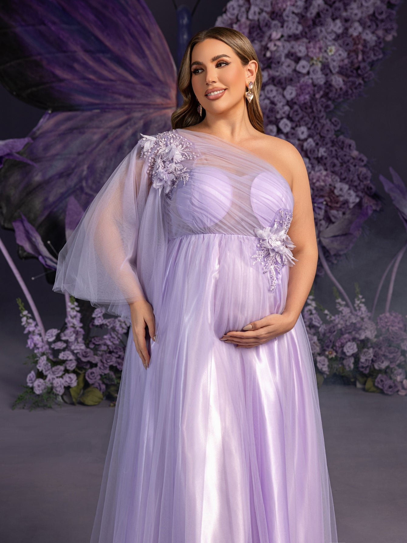 Make a breathtaking entrance with our exquisite maternity gown, designed to celebrate your beauty during this special time. This gown features a delicate one-shoulder neckline adorned with floral appliques that adds a touch of elegance and sophistication. The empire waist design gracefully drapes over your bump, ensuring both comfort and a flattering silhouette. The soft, flowing tulle creates a dreamy, ethereal look, enhanced by the floral details along the bodice and shoulder.