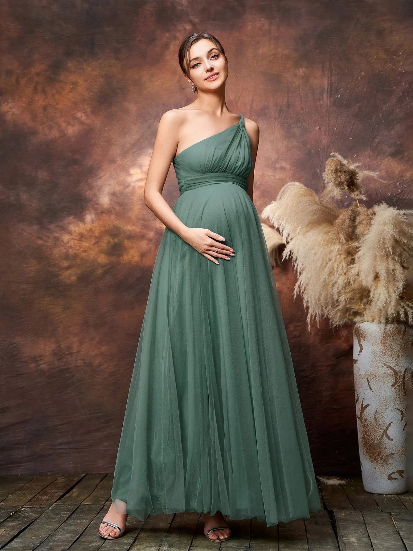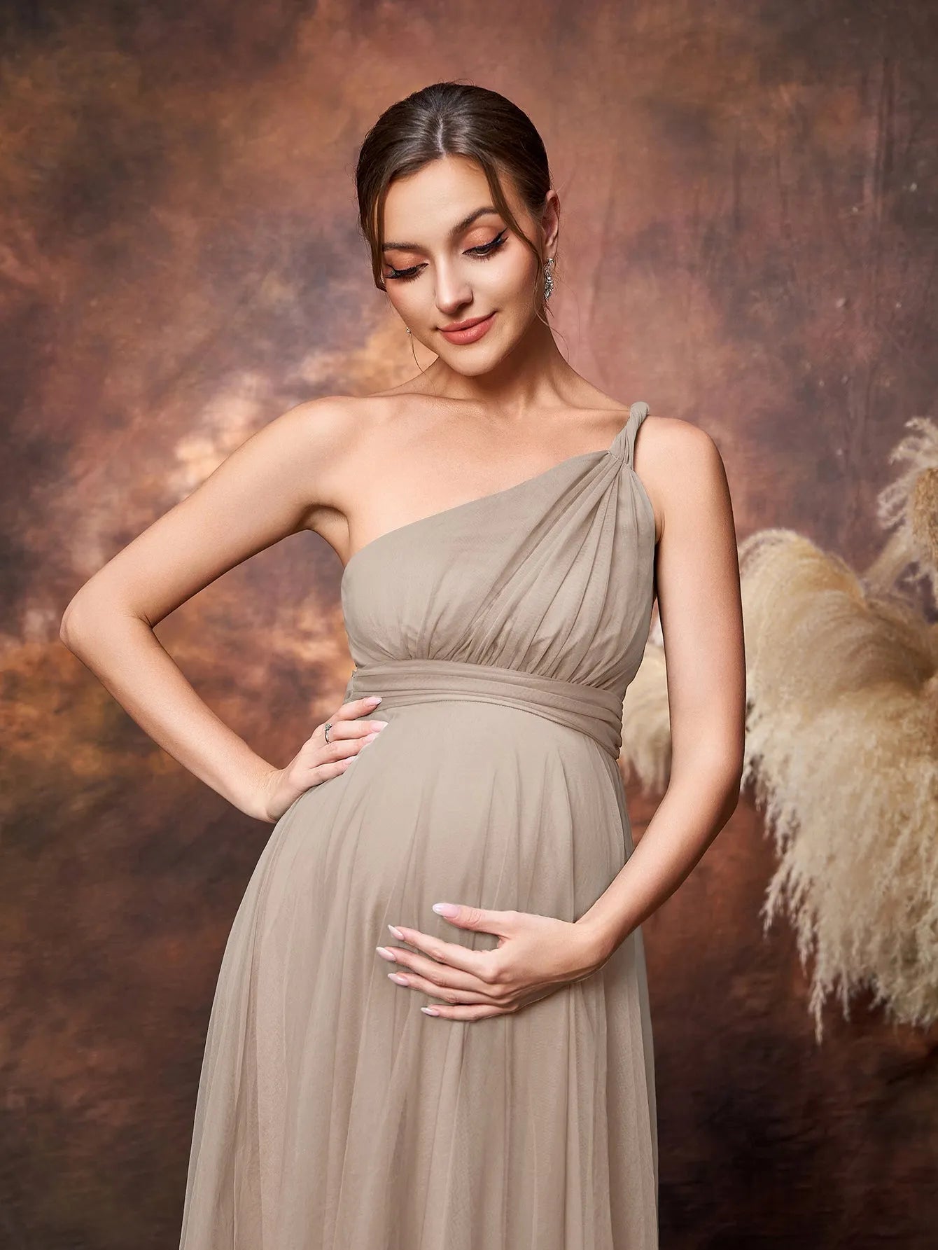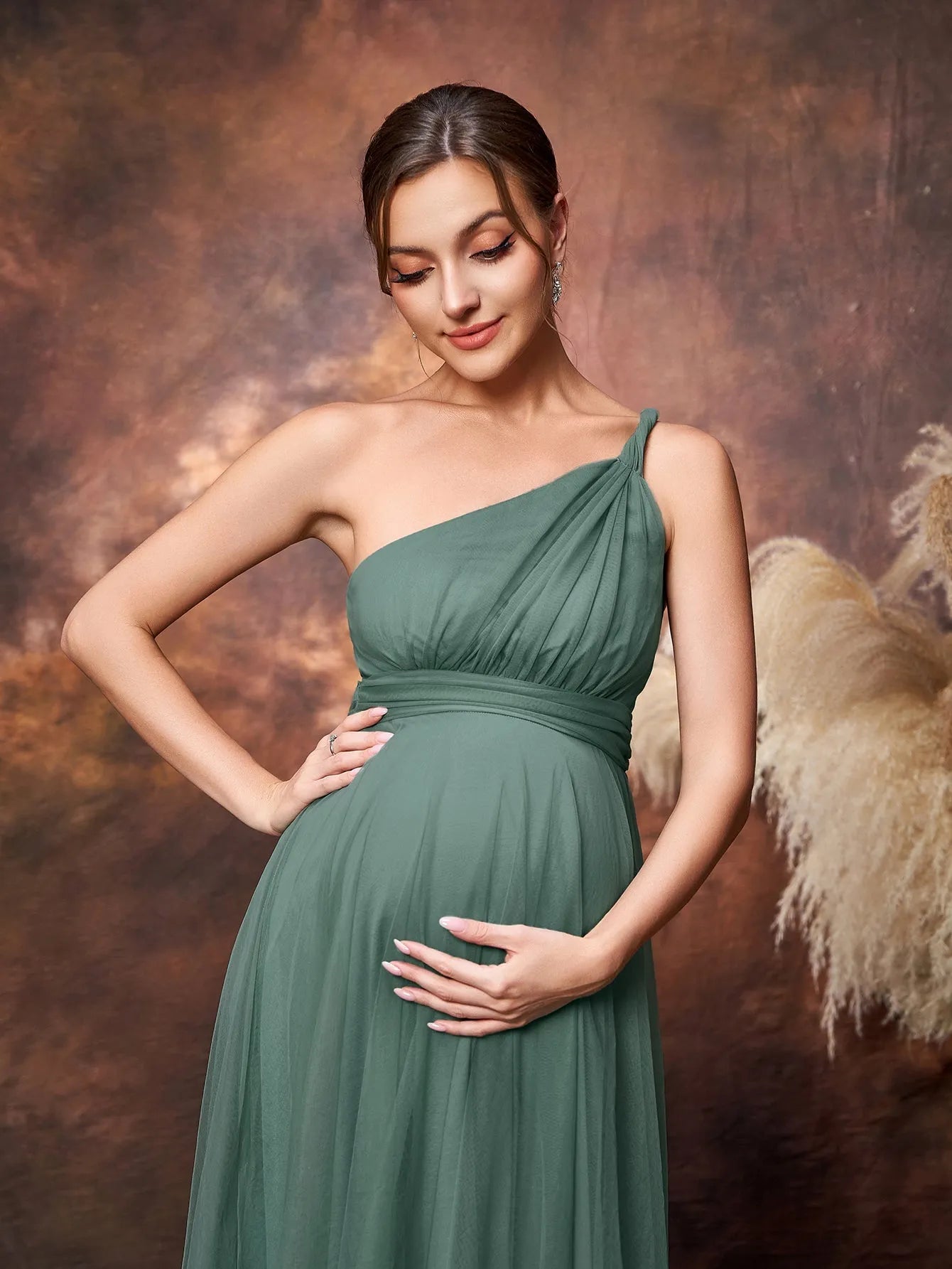 Radiate elegance with our stunning maternity gown, designed to make you feel like royalty during this special time. This gown features a chic one-shoulder design, offering a modern twist on classic maternity wear. The soft tulle skirt flows gracefully to the floor, creating a breathtaking silhouette that flatters your growing bump. The empire waistline is gently ruched, enhancing your natural curves with elegance, while the single shoulder strap adds a touch of contemporary style. This dress is perfect for maternity photo shoots, baby showers, or any event where you want to shine.