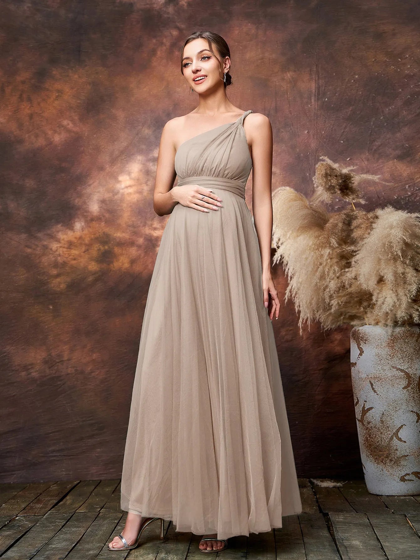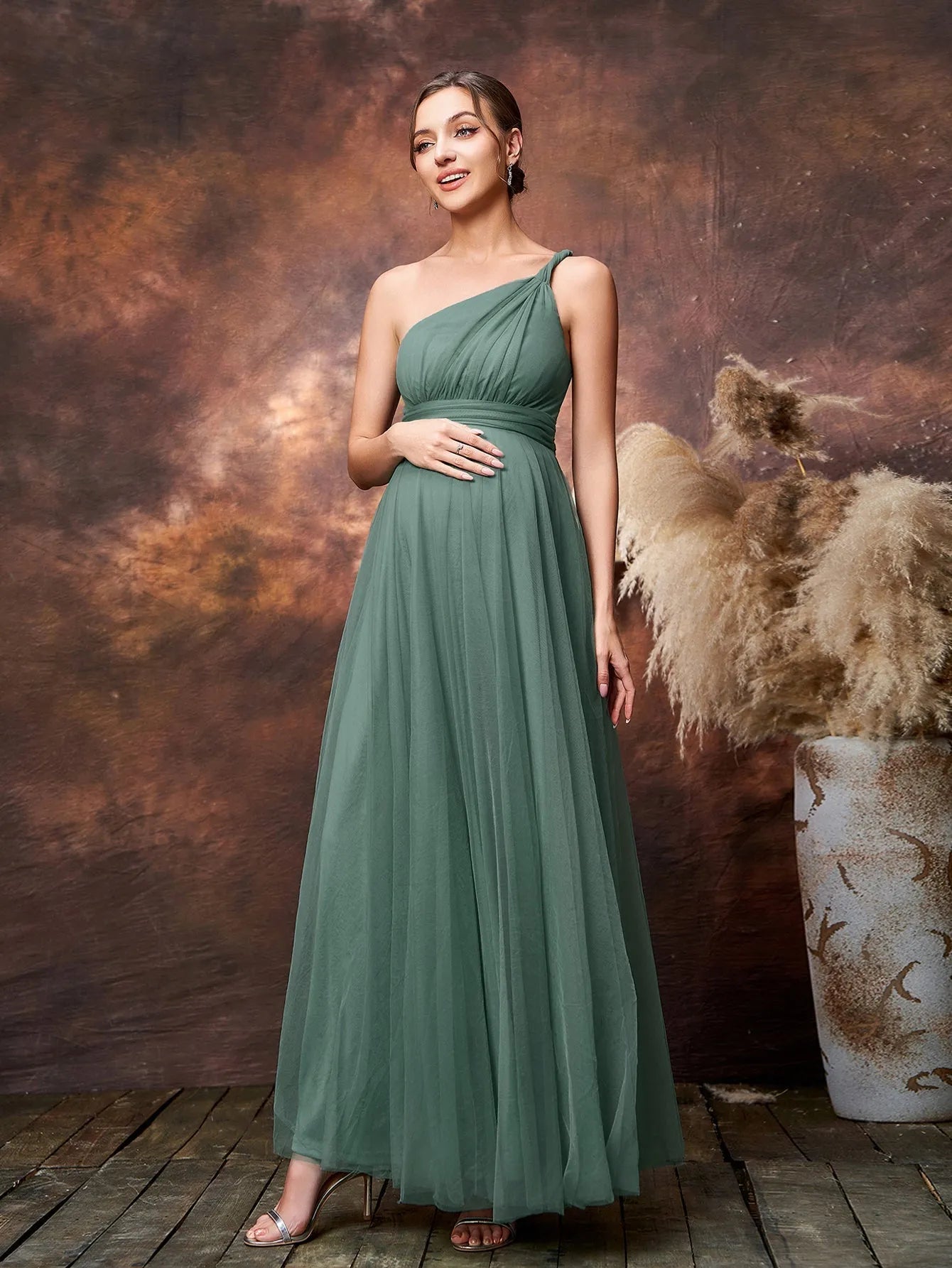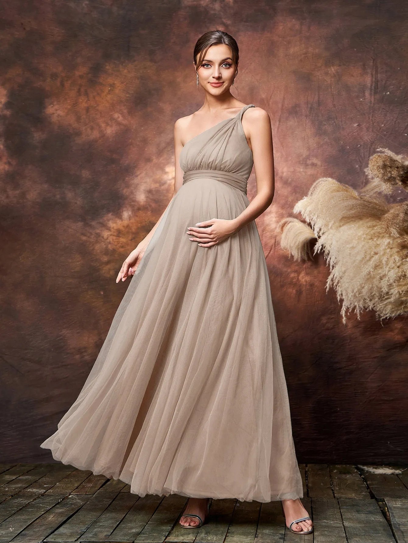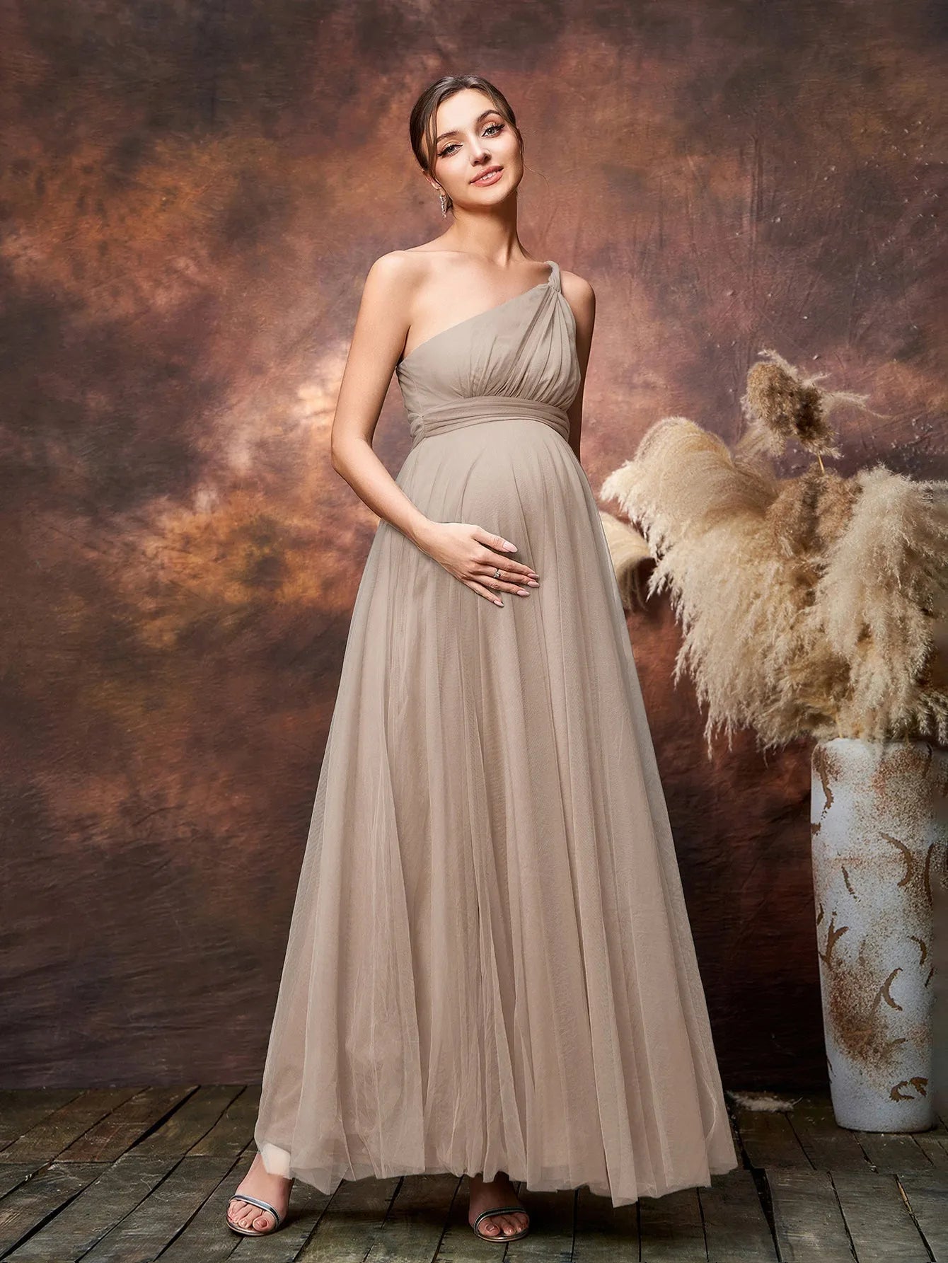 Radiate elegance with our stunning maternity gown, designed to make you feel like royalty during this special time. This gown features a chic one-shoulder design, offering a modern twist on classic maternity wear. The soft tulle skirt flows gracefully to the floor, creating a breathtaking silhouette that flatters your growing bump. The empire waistline is gently ruched, enhancing your natural curves with elegance, while the single shoulder strap adds a touch of contemporary style. This dress is perfect for maternity photo shoots, baby showers, or any event where you want to shine.