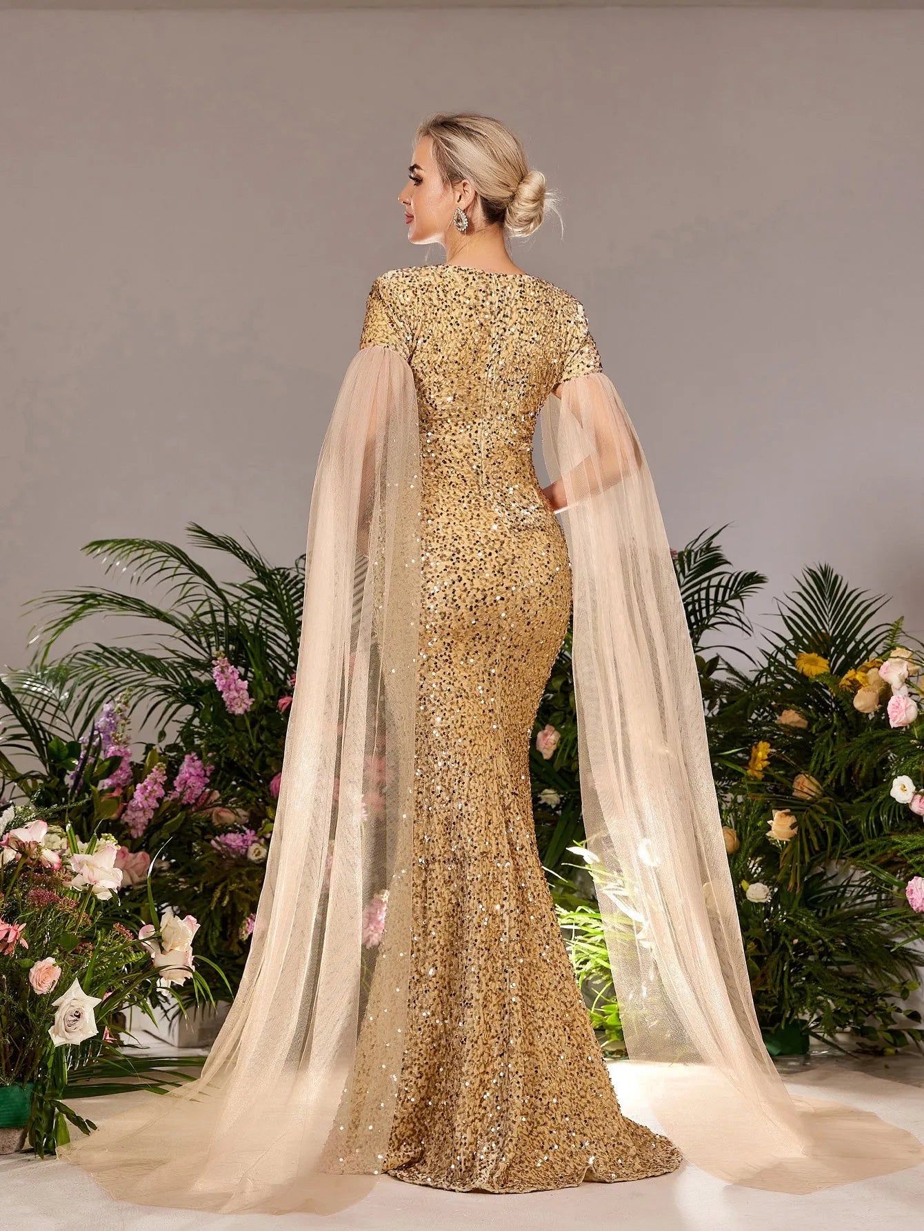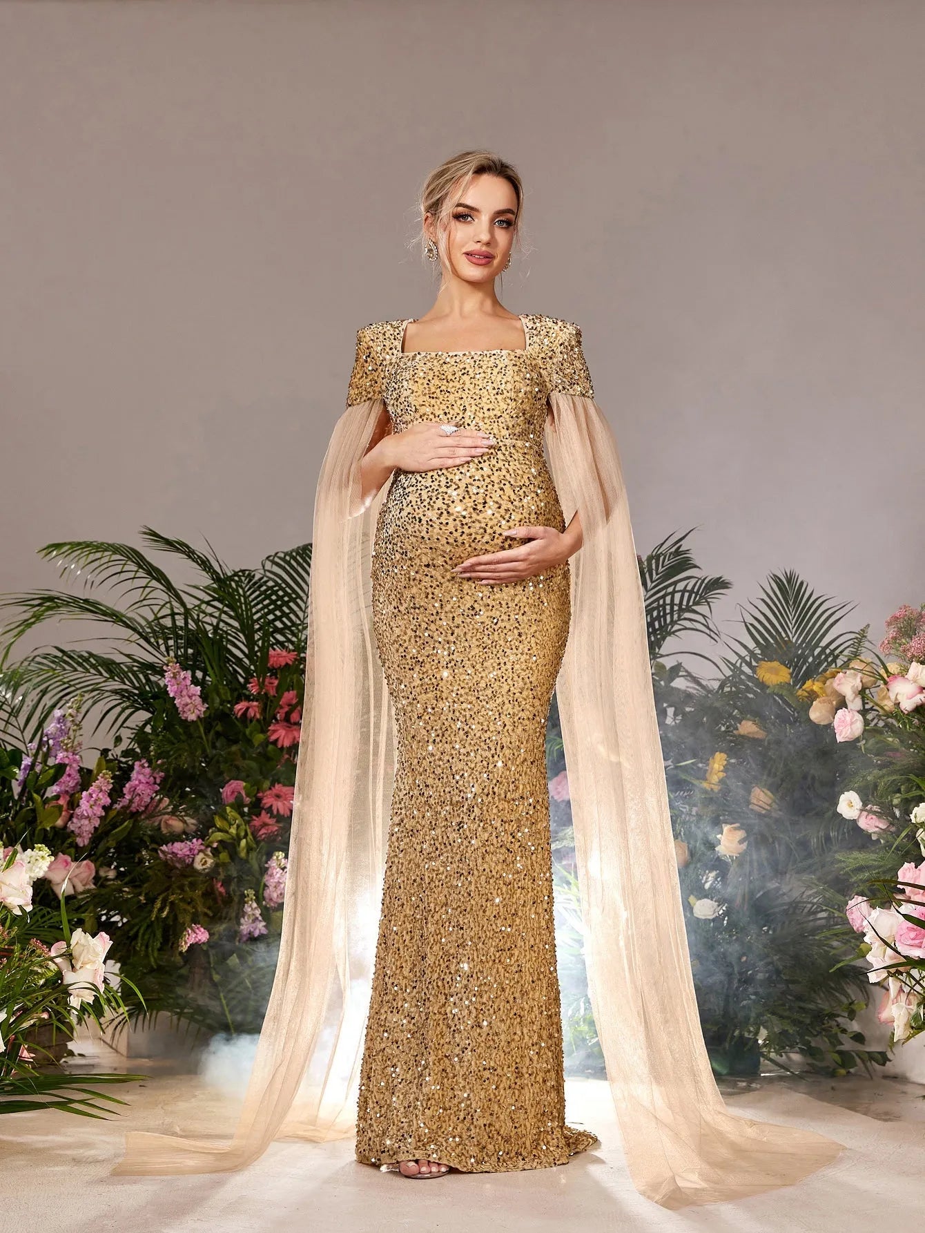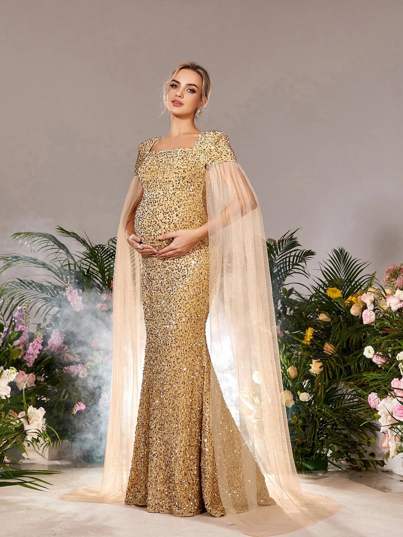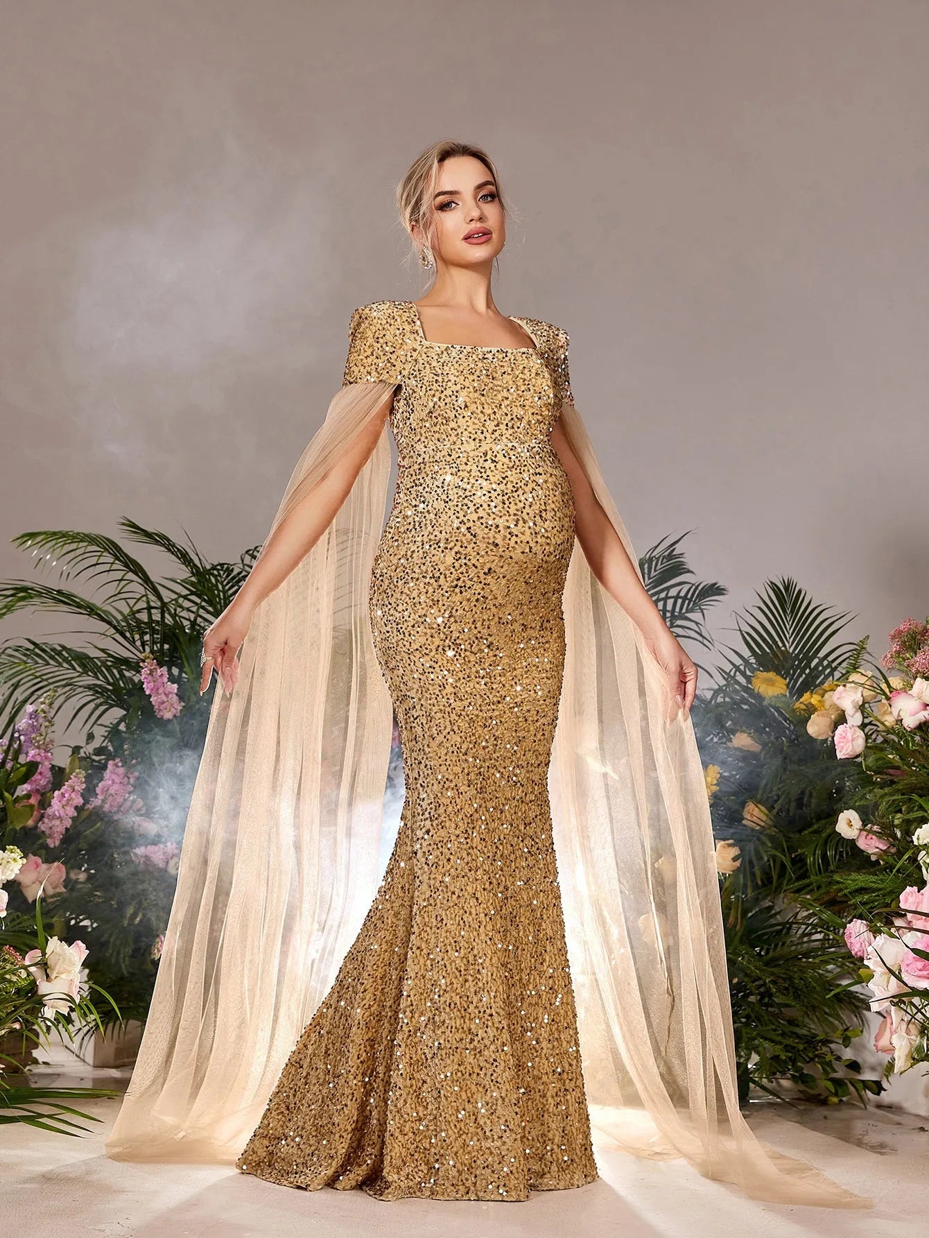 Elevate your maternity style with our show-stopping gown, designed to make a dazzling impression. This stunning dress features a square neckline and an empire waist that beautifully complements your growing bump. Crafted from luxurious sequin fabric, this gown catches the light from every angle, ensuring you shine all night. The airy mesh cape sleeves add a touch of drama, creating a sophisticated silhouette that exudes elegance.