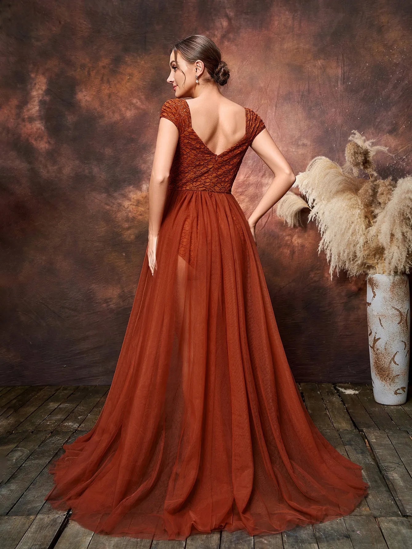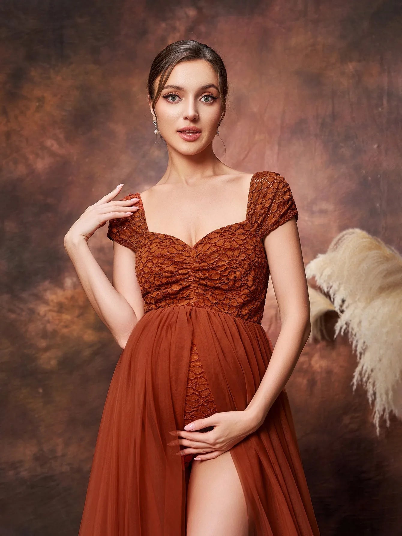 Embrace the beauty of motherhood with our stunning maternity gown, crafted to celebrate your radiant glow. This gown features a flattering sweetheart neckline with delicate cap sleeves that provide a touch of elegance. The fitted bodice, adorned with intricate lace detailing, flows gracefully into a voluminous tulle skirt, creating a romantic silhouette. The soft, airy tulle fabric offers a comfortable fit while ensuring a breathtaking presence.