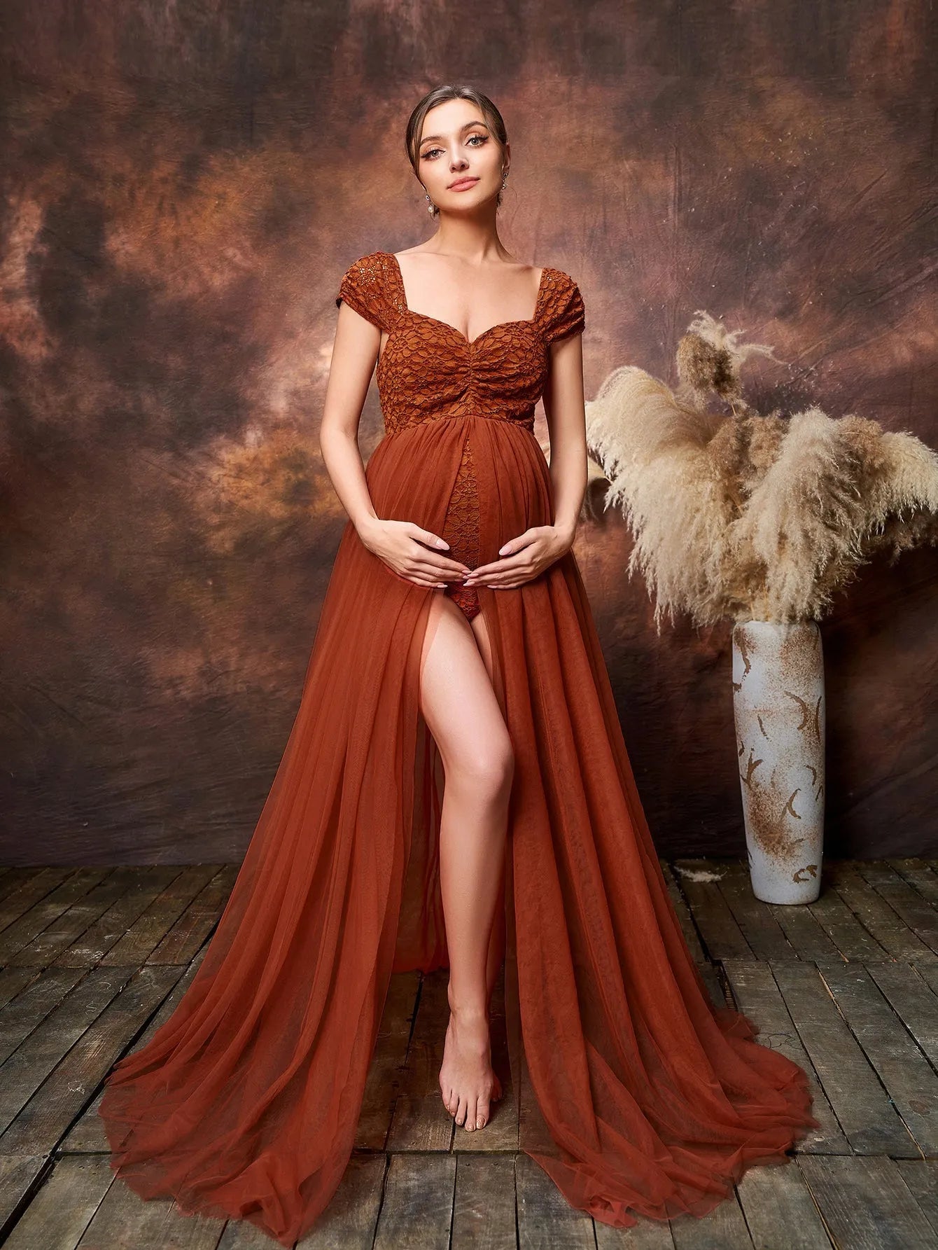 This gown combines classic design with modern comfort, making it an ideal choice for capturing precious memories during your pregnancy journey. Let your beauty shine in this exquisite maternity dress, designed to make you feel as stunning as you look.
