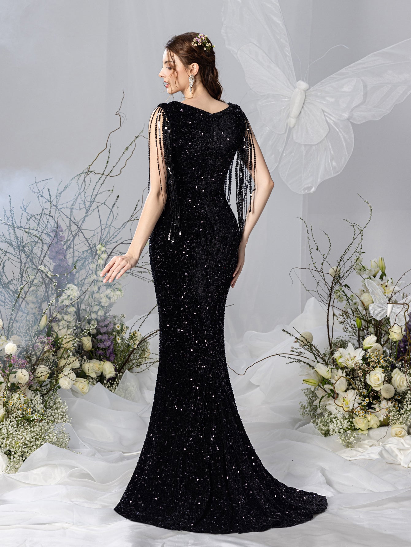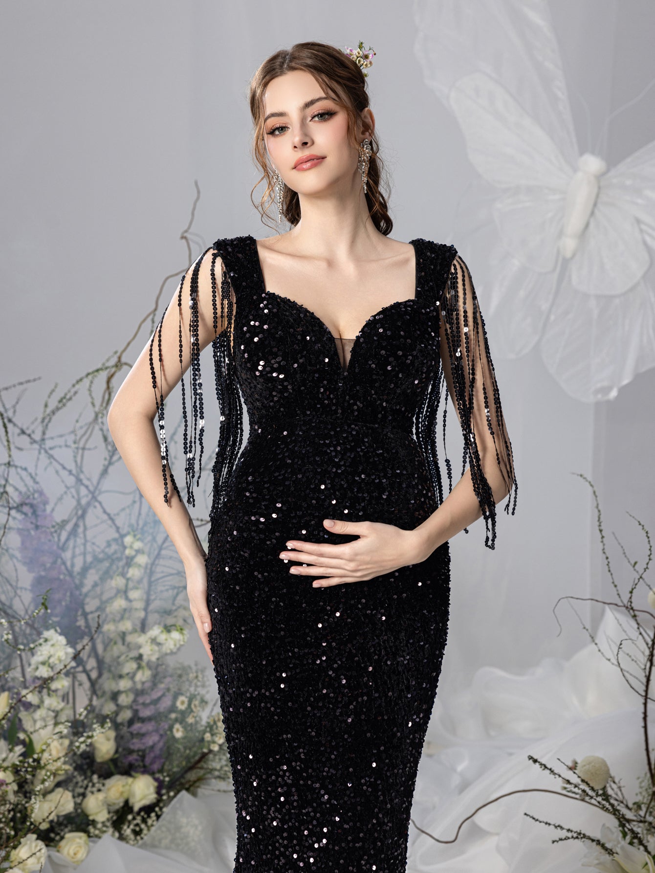 Make a striking entrance with our glamorous maternity gown, crafted to showcase your beauty and confidence during this extraordinary time. The gown features a sweetheart neckline and a form-fitting silhouette that elegantly drapes over your bump. The shimmering black sequin fabric adds a touch of luxury, while the fringe details on the sleeves provide a sophisticated, vintage-inspired flair.