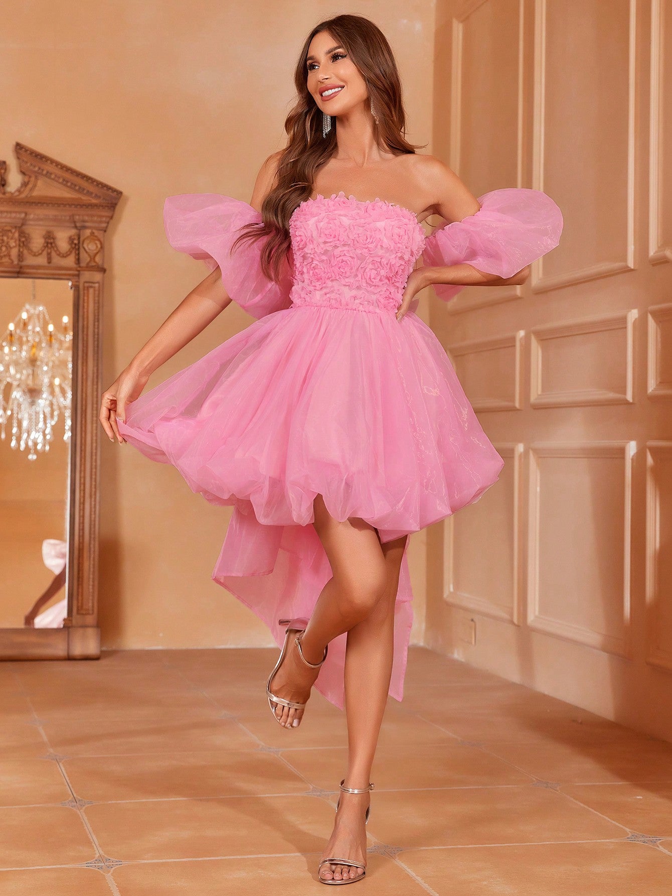 Midi Applique Detail Off Shoulder Tulle Dress with Puff Sleeves – Luxury Evening Wear for Weddings, Parties & Special Occasions