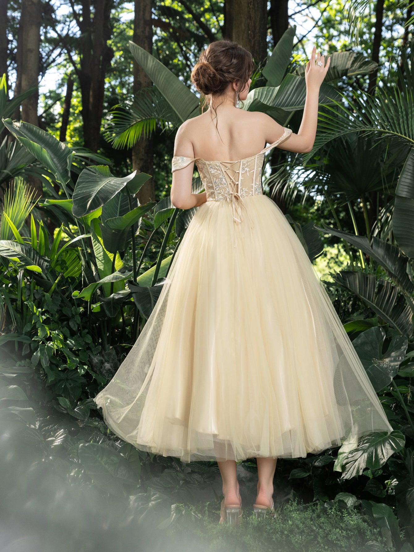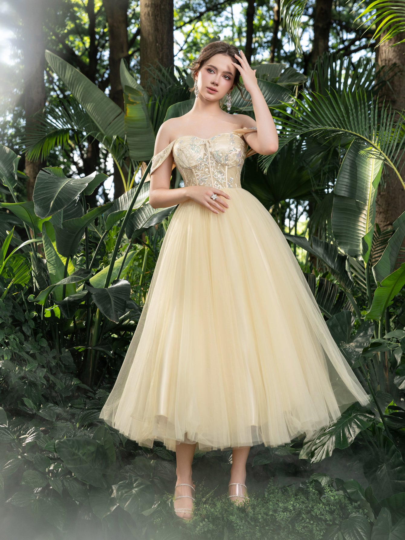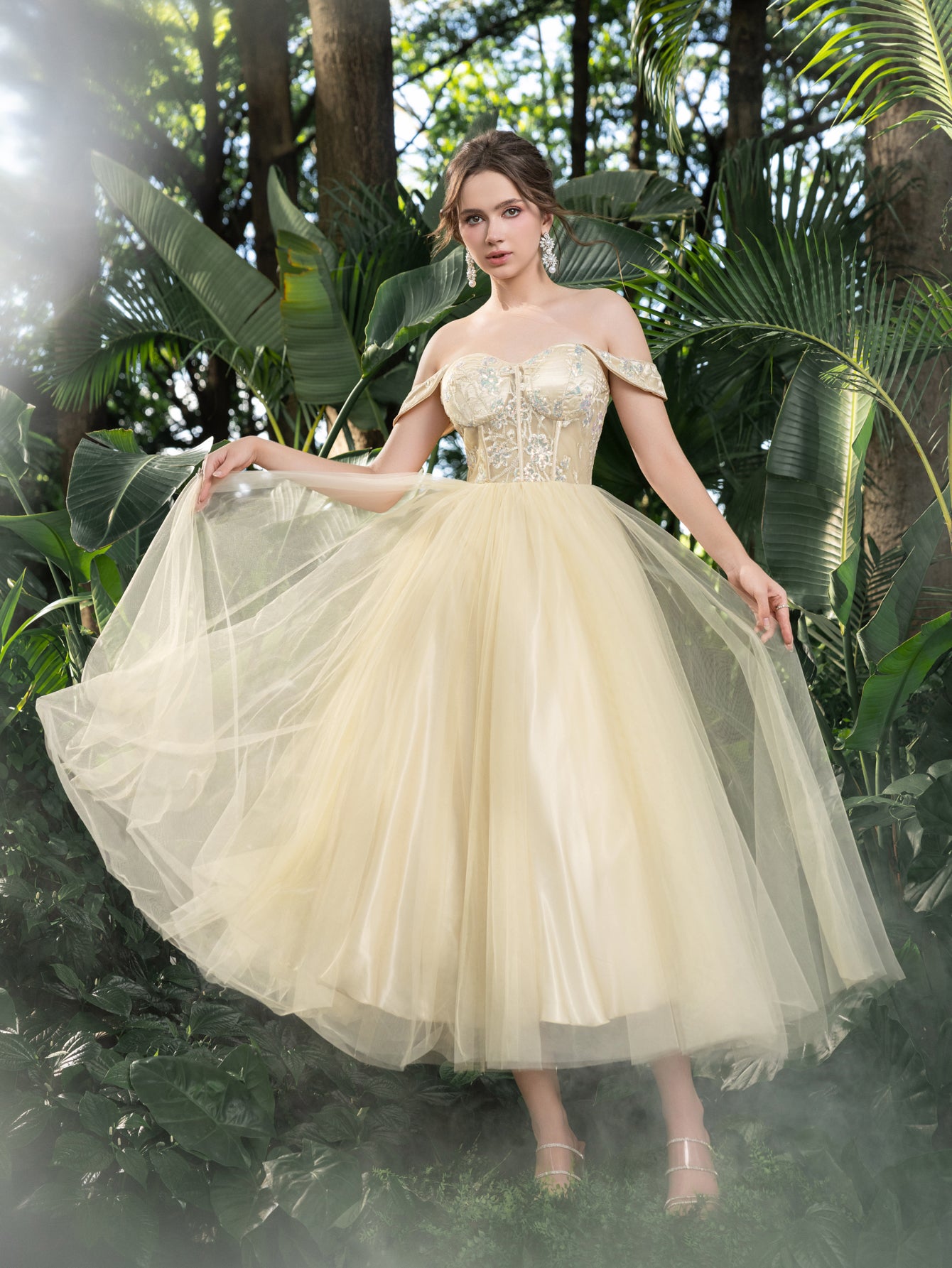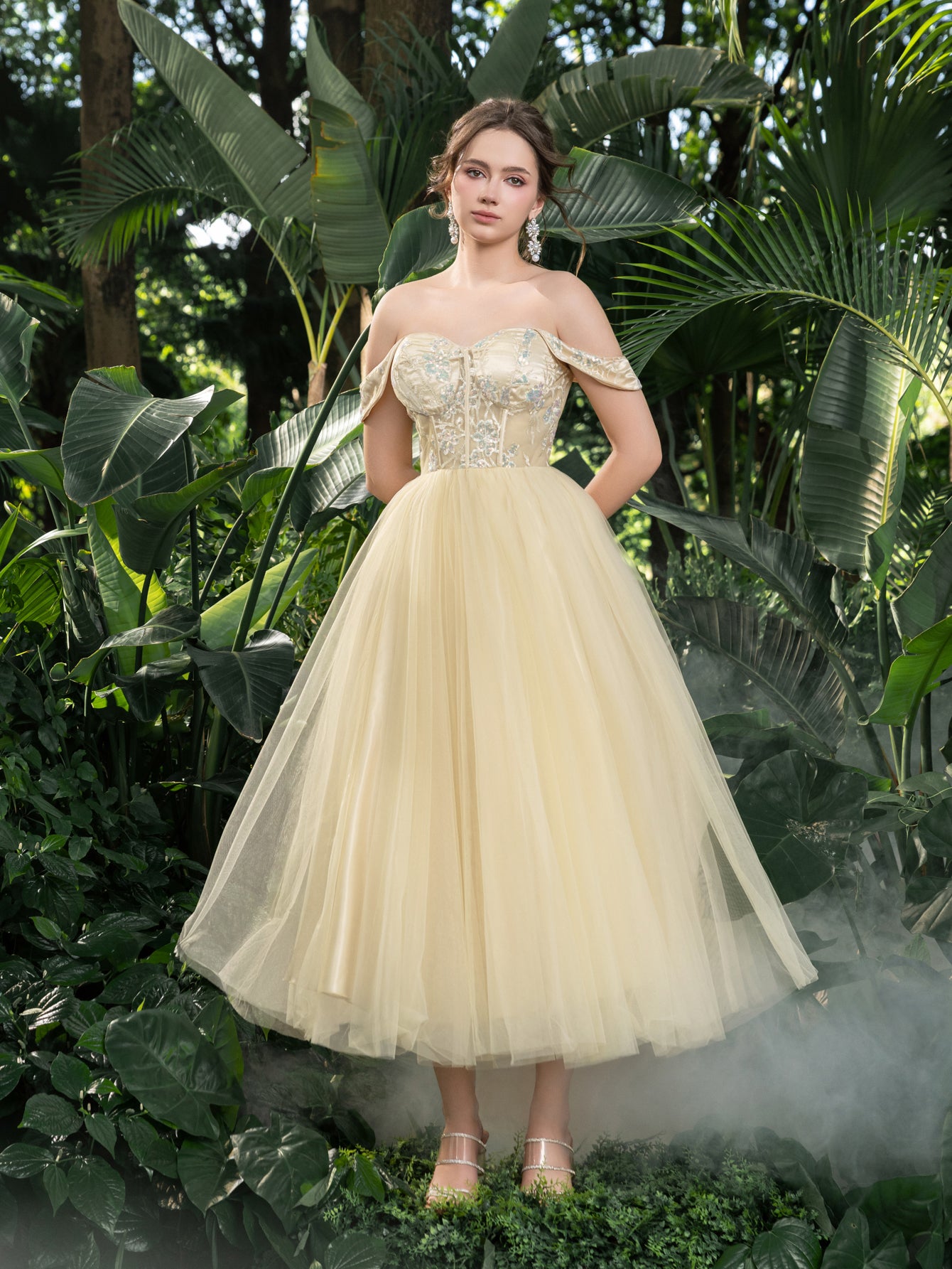 Midi Luxurious Off-Shoulder Gown with Intricate Sequin & Tiered Tulle Skirt – Elegant Dress for Opera Galas, Palace Receptions & VIP Dinners