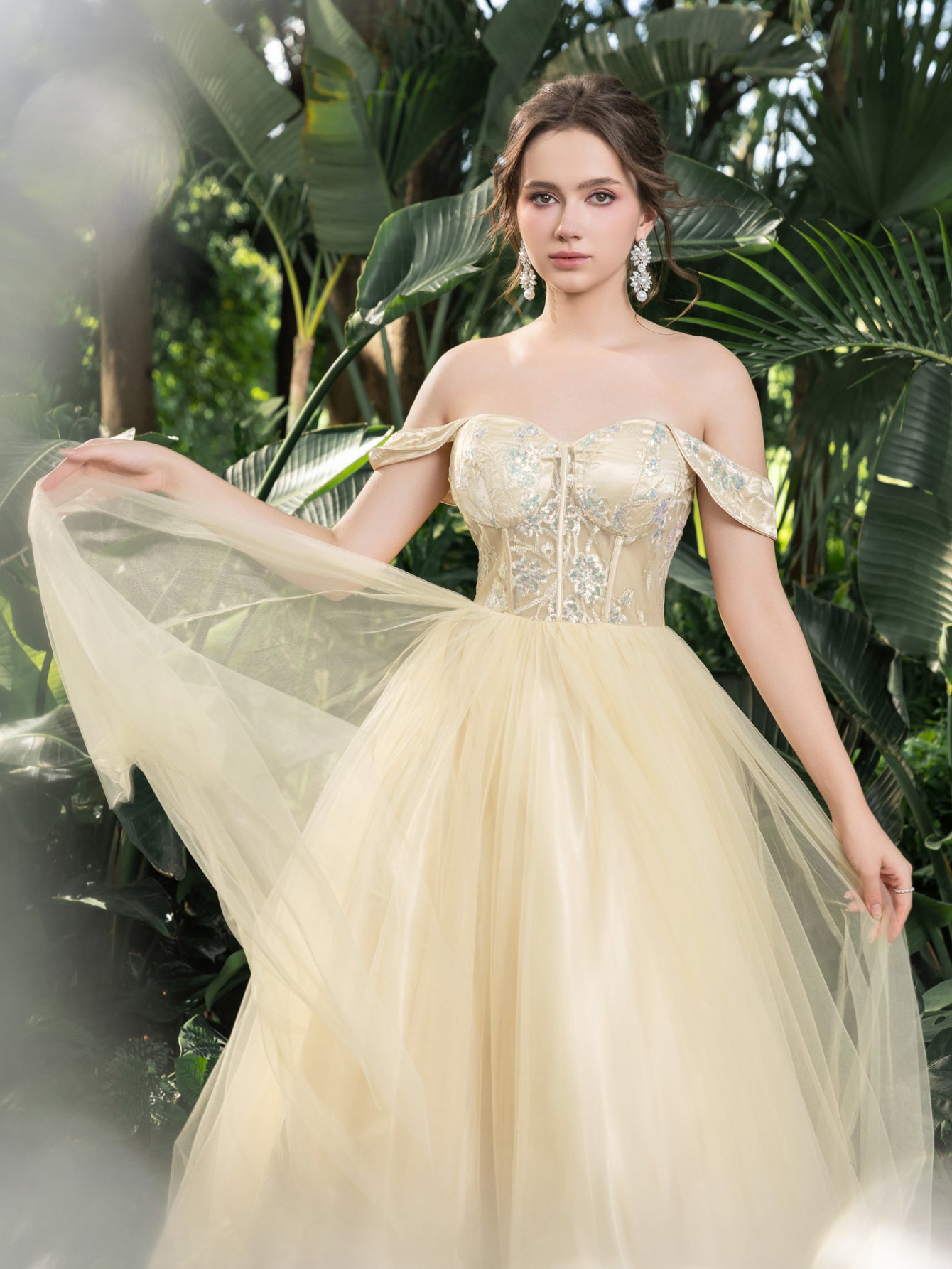 ✨ Regal Opulence Redefined: This off-shoulder gown captivates with floral sequin cascading from the neckline to the bodice, paired with a multi-tiered tulle skirt. The structured off-shoulder neckline frames collarbones elegantly, while the cinched waist creates a timeless hourglass silhouette, blending regal sophistication with modern allure.