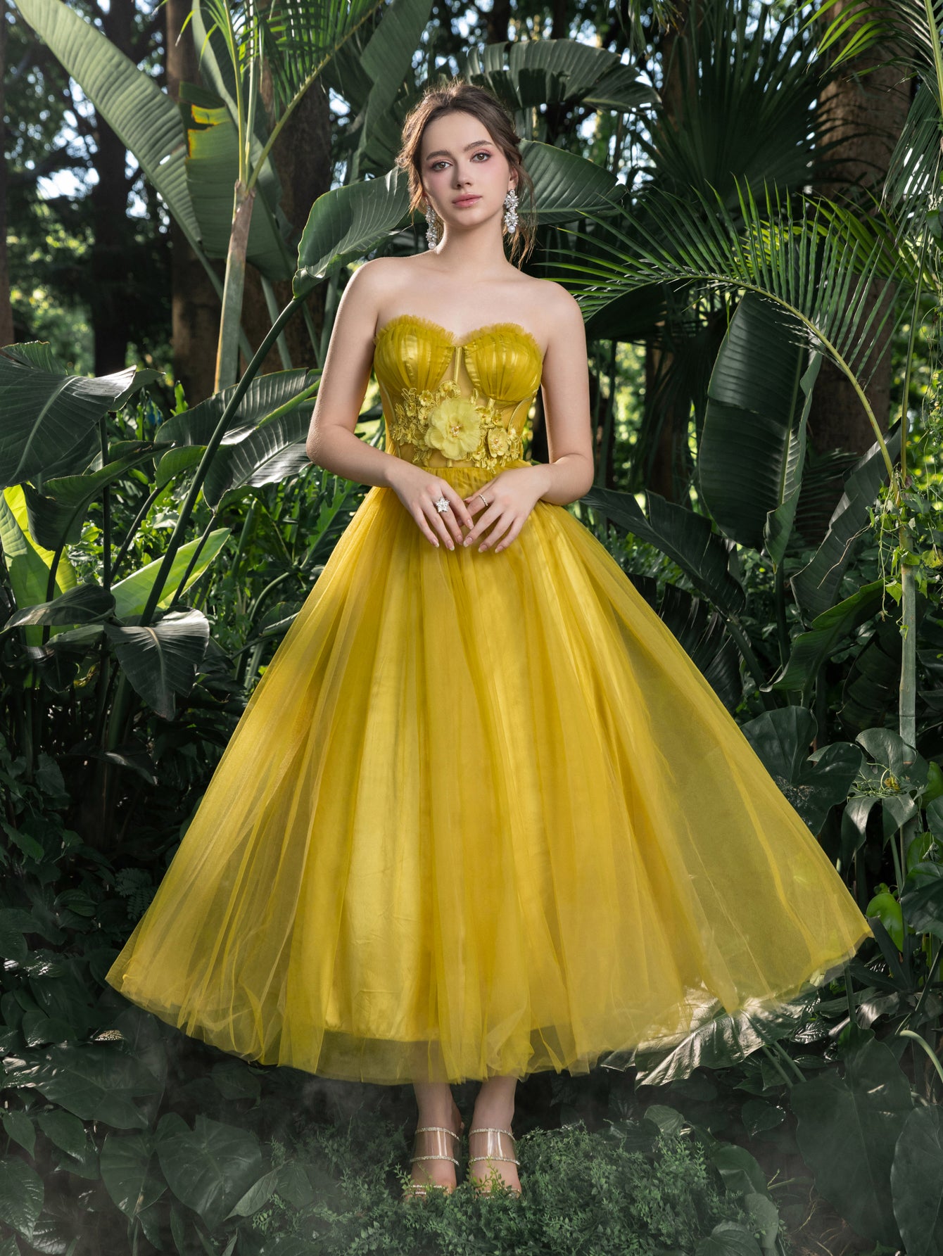 Midi Strapless Tulle Ball Gown with Floral Embellishments – Dramatic Sweetheart Neckline for Garden Weddings, Charity Balls