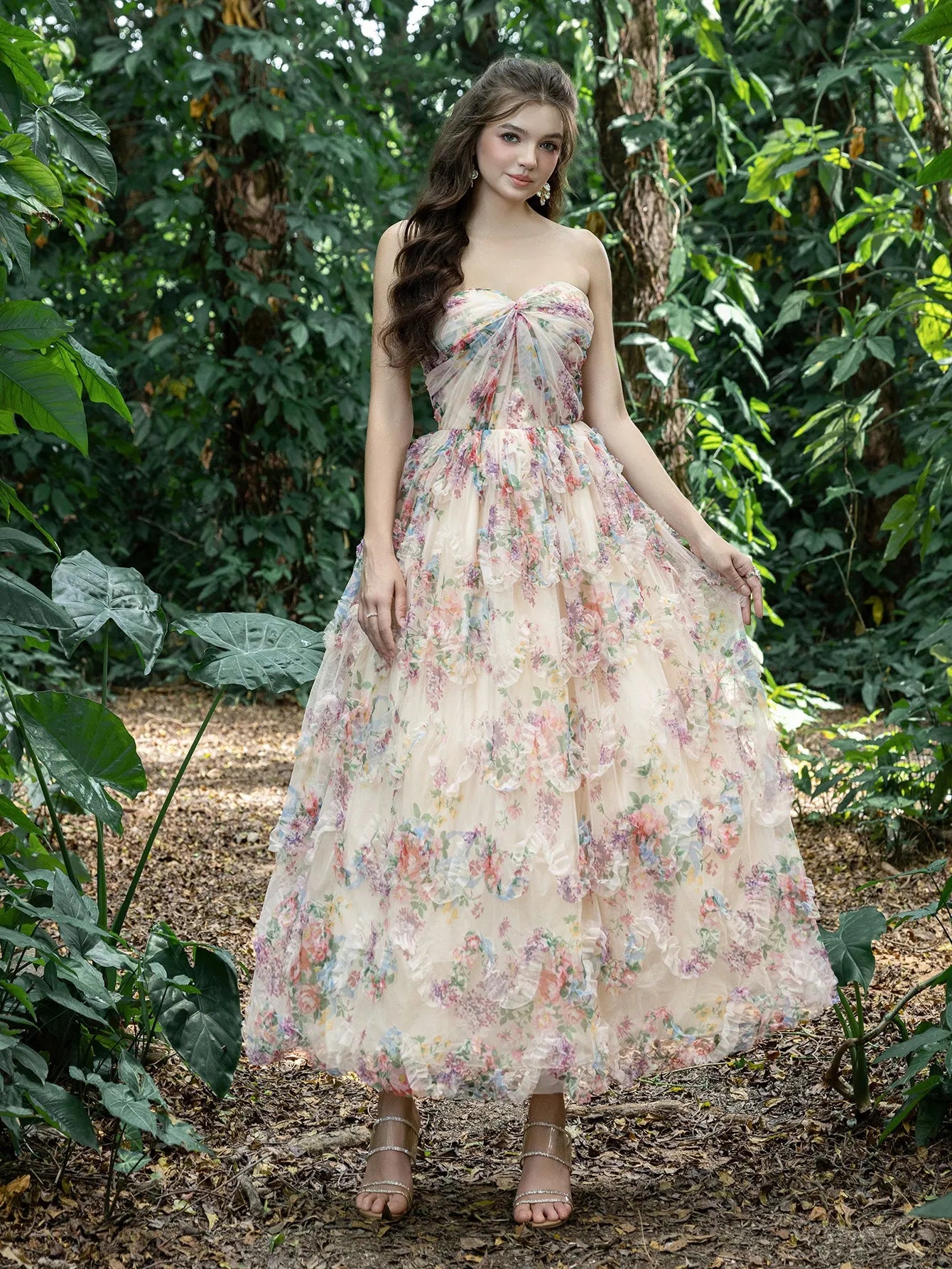 Step into an enchanted garden with this whimsical floral evening gown, crafted for those who love romance and charm. Featuring a soft, pastel floral print, this dress is adorned with layers of delicate ruffle trims, creating a dynamic, textured look that cascades gracefully to a tea-length hem. The strapless sweetheart neckline is complemented by a lace-up back, adding a touch of timeless allure. The fitted bodice accentuates the figure, while the voluminous skirt brings a fairytale quality to the ensemble.