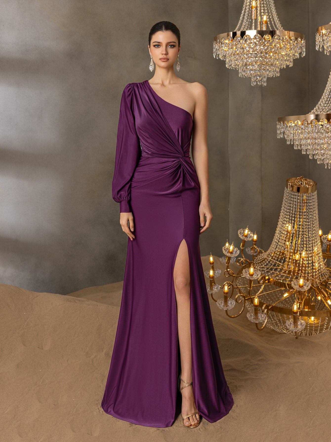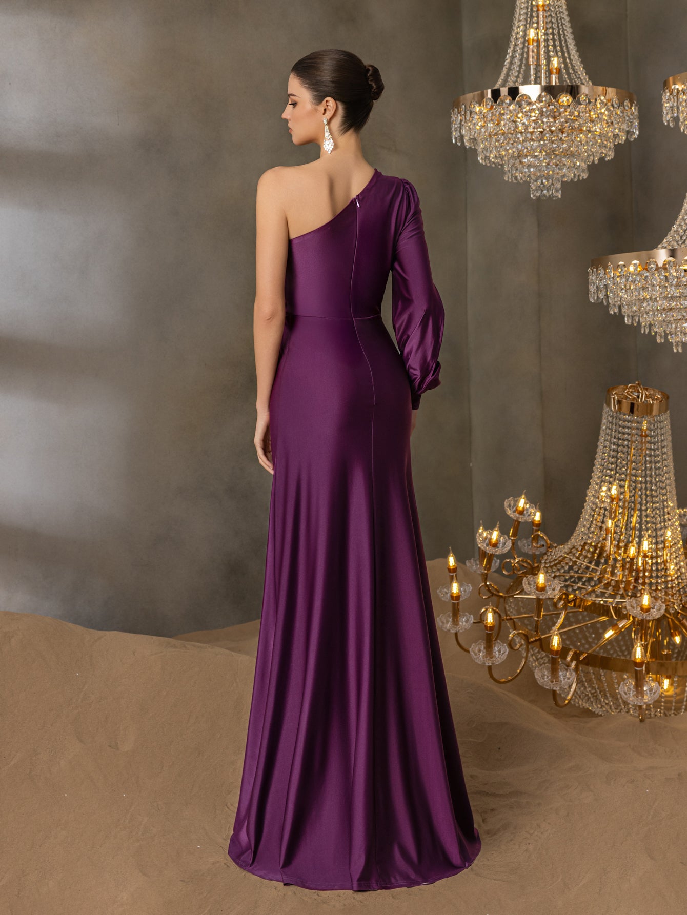 Discover a blend of classic allure and modern sophistication with this gown, perfect for the woman who adorns herself in confidence and elegance. The one-shoulder design creates an asymmetrical neckline that is both intriguing and graceful, leading to a long, voluminous sleeve that adds a dramatic flair. The bodice is skillfully ruched to flatter the figure, while the smooth, fitted skirt extends into a full-length hem with a daring thigh-high slit that promises a display of refined allure with every step. The sweep of fabric trailing from the shoulder down the back adds a captivating element of movement, ensuring that your exit is as stunning as your entrance. This gown is perfect for an elegant evening event, a black-tie wedding, or any special occasion where making a memorable impression is a must.