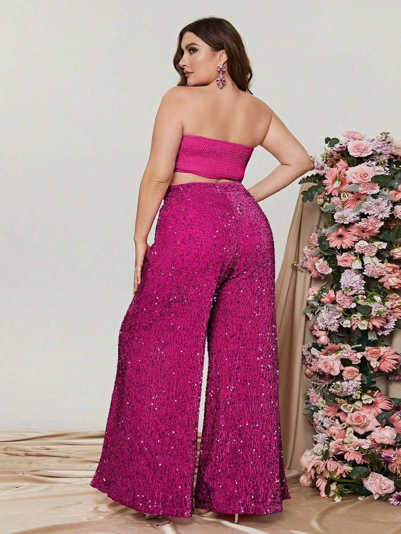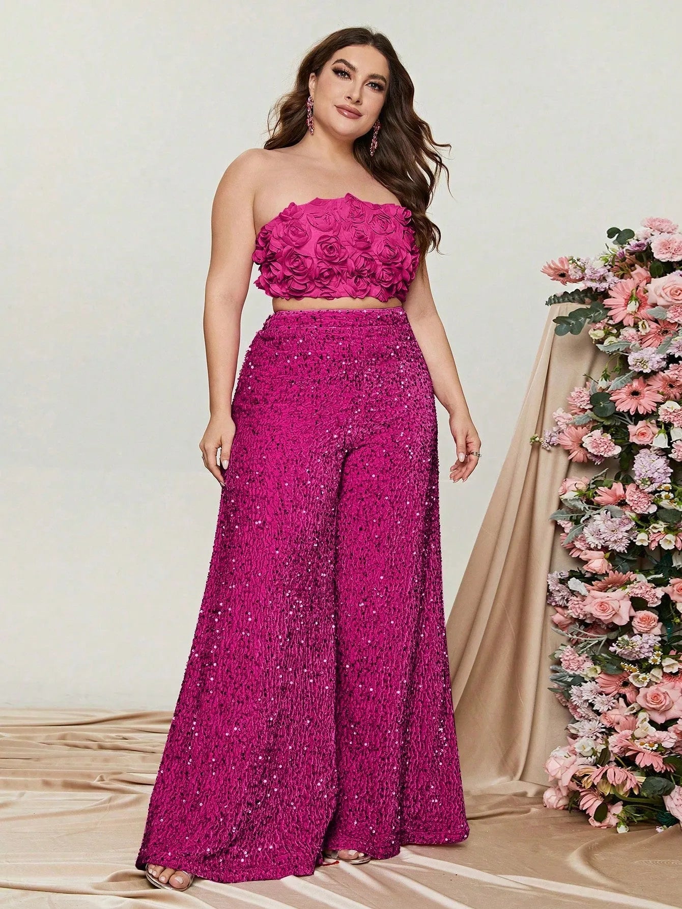 Step into the spotlight with this eye-catching 3D flowers tube top and sequin wide-leg pants set. The top features intricate floral appliqué that adds texture and dimension, while the high-waisted sequin pants shimmer with every move. Designed to flatter your curves, this ensemble is perfect for making a bold statement at parties, evening events, or celebrations. The wide-leg pants offer both comfort and style, while the strapless design of the top keeps the look modern and chic.
