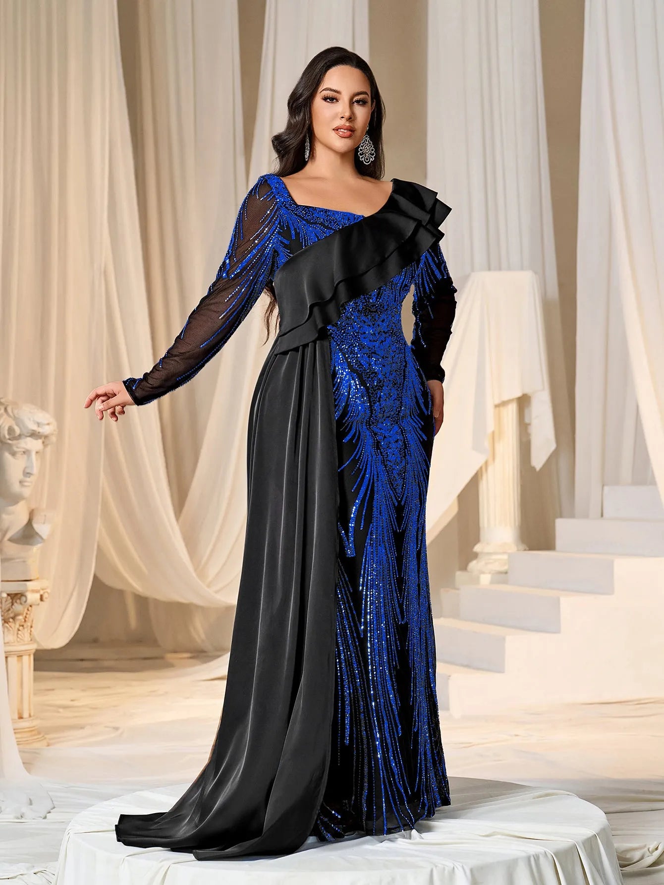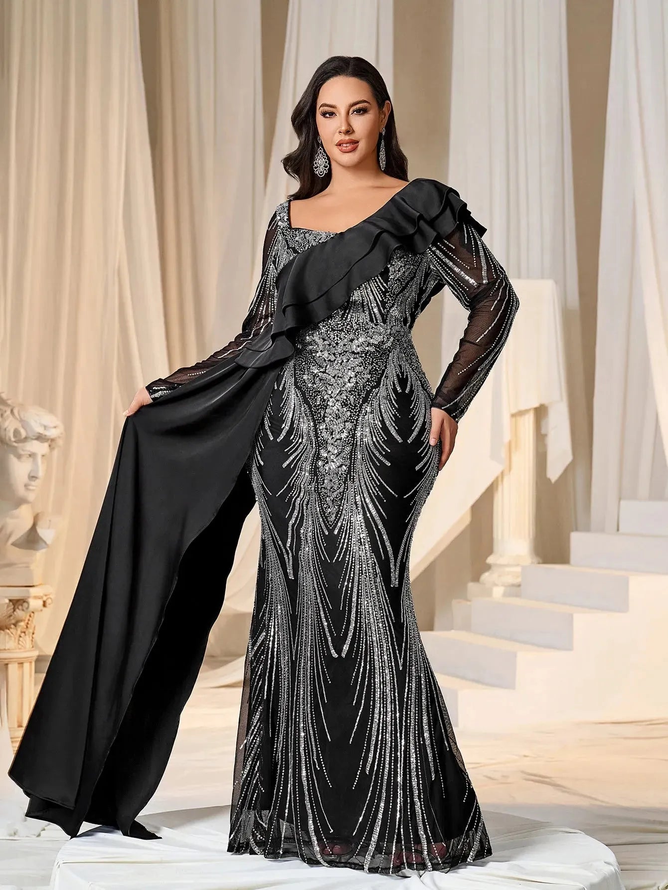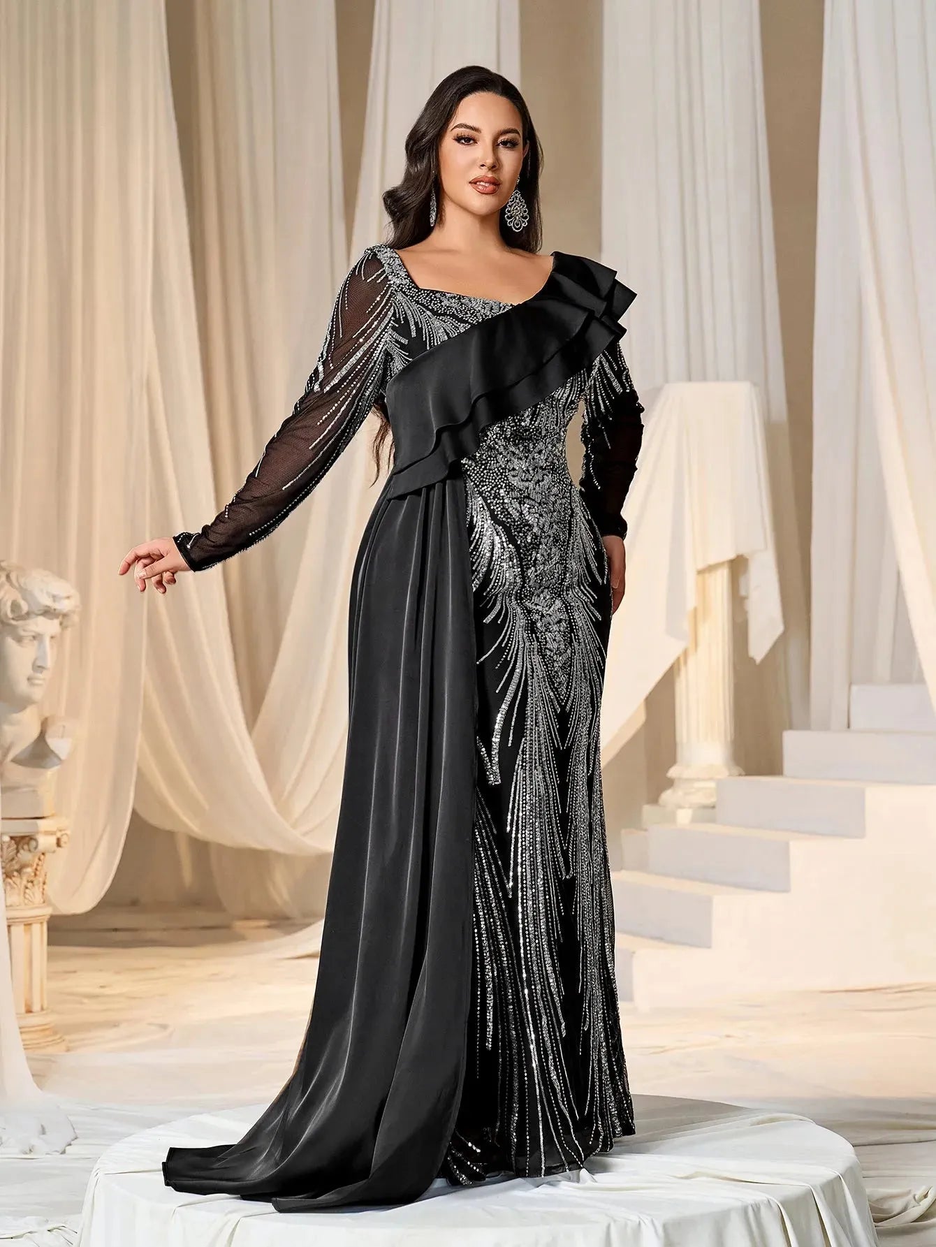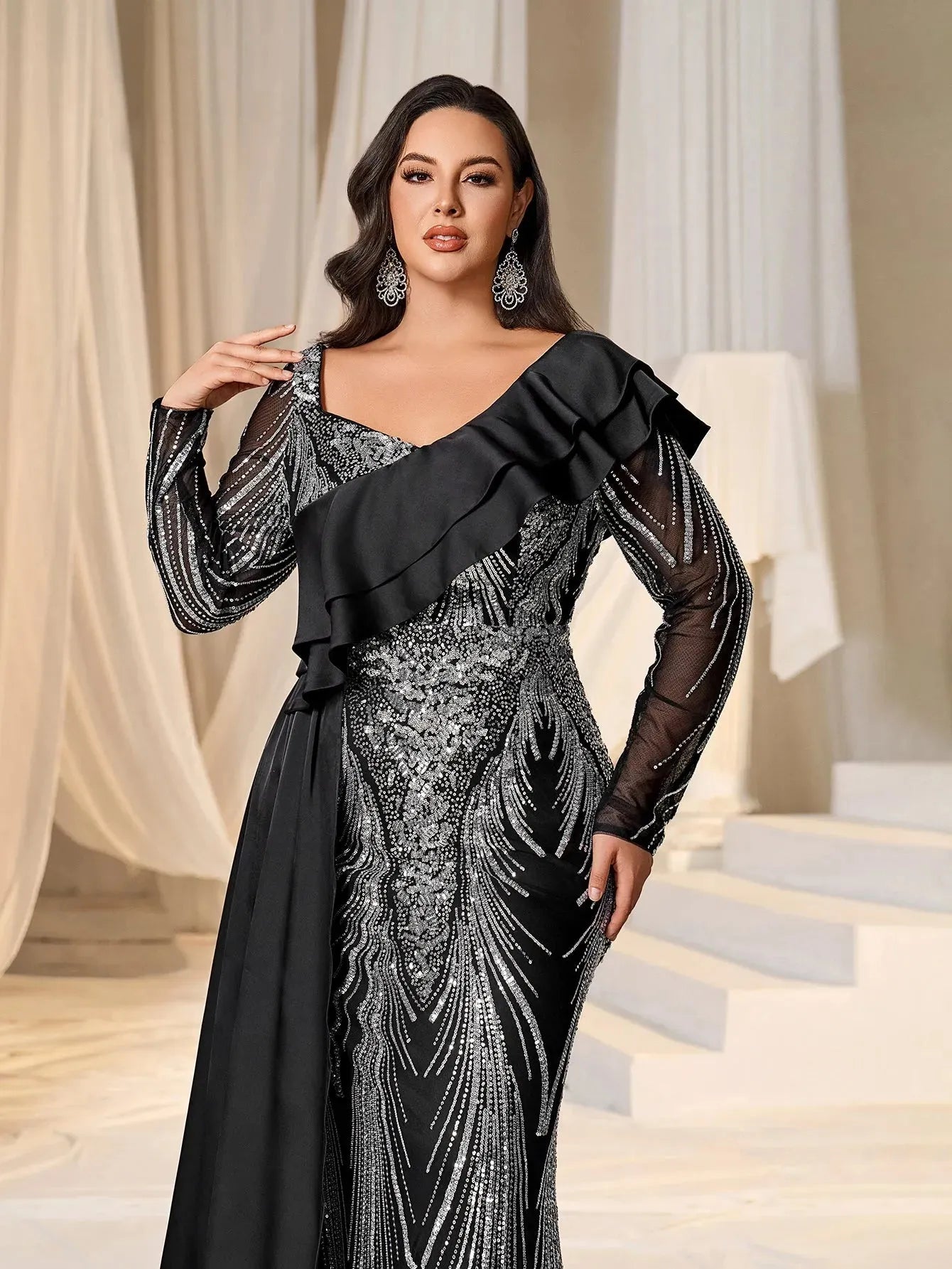 Make a bold statement with our glamorous evening gown, adorned with stunning sequins. The intricate sequin detailing creates a dazzling effect, perfect for capturing attention at any event. The gown features a unique one-shoulder ruffled detail that adds a touch of drama and sophistication. The long sleeves provide a chic and elegant look, while the fitted silhouette enhances your curves beautifully.