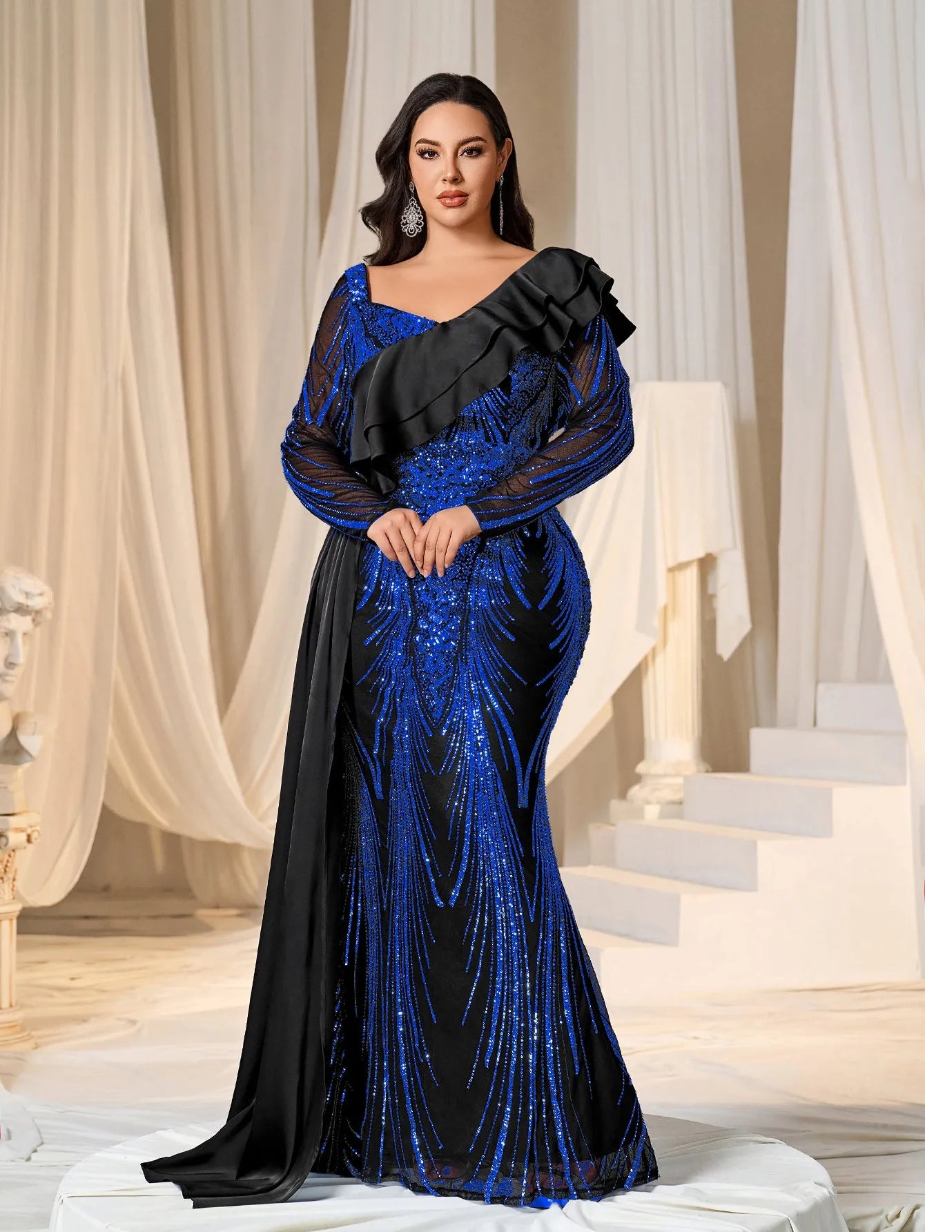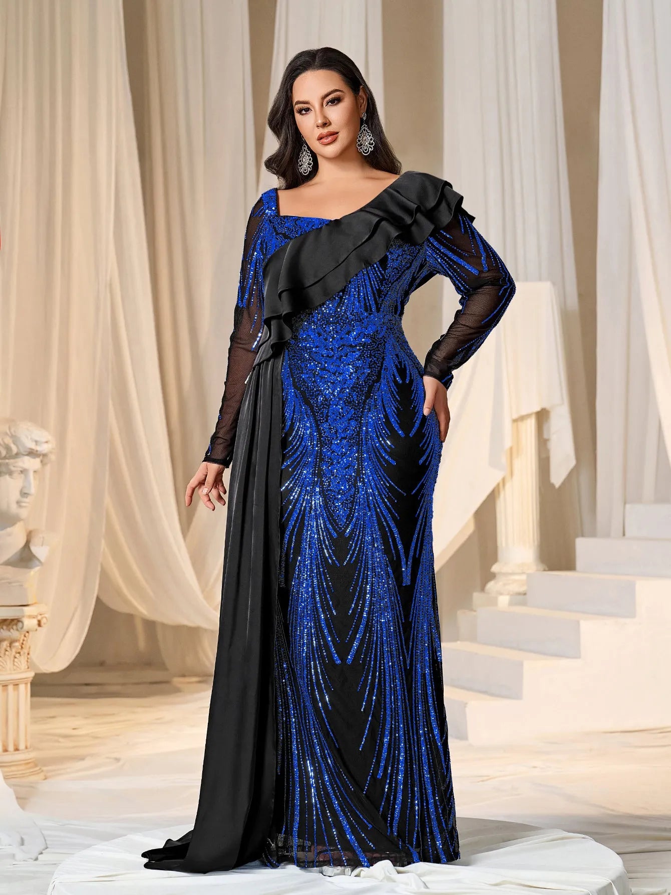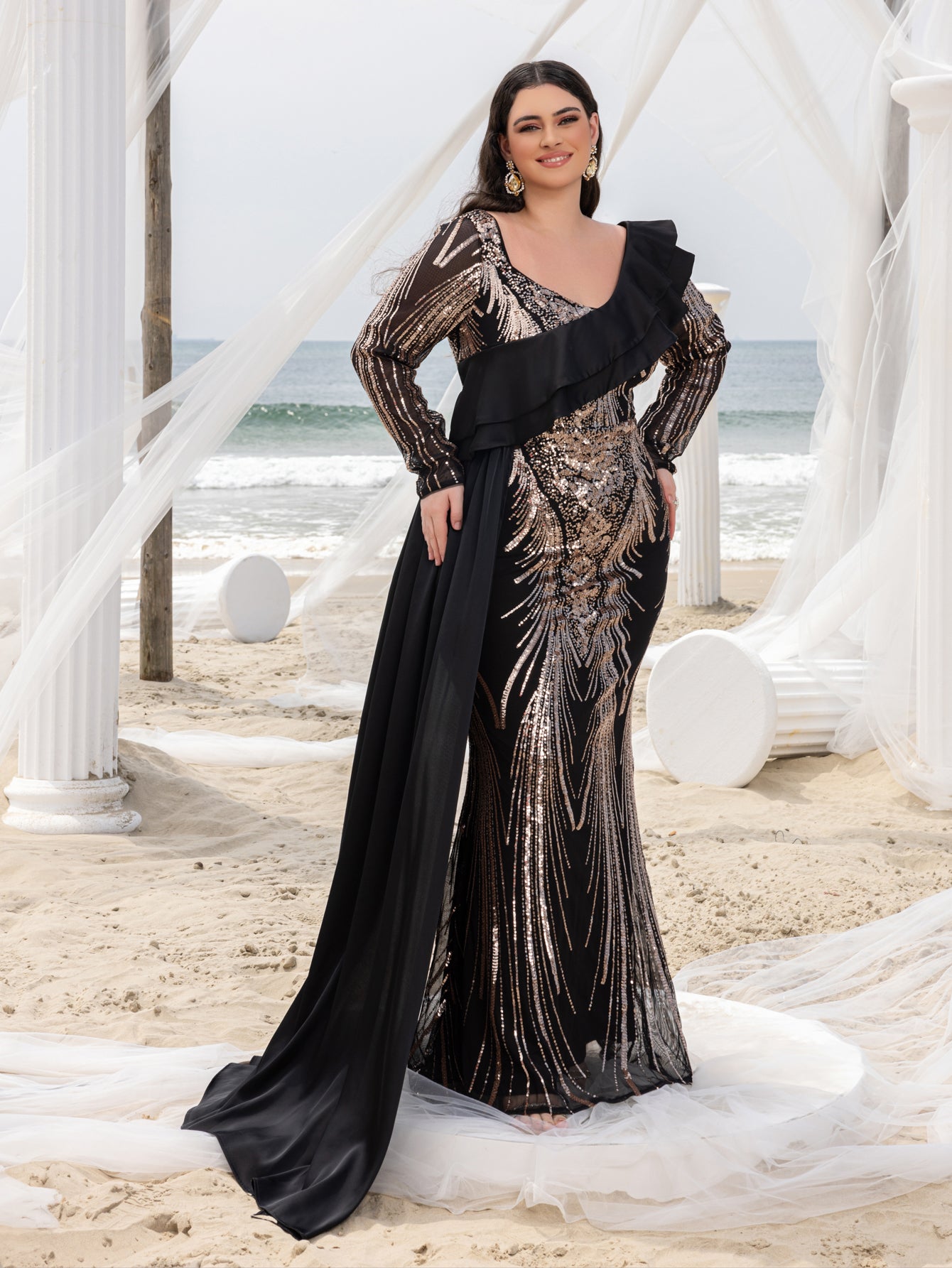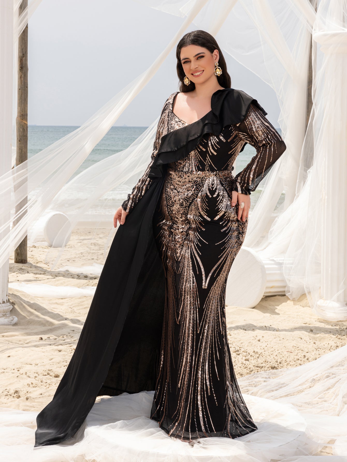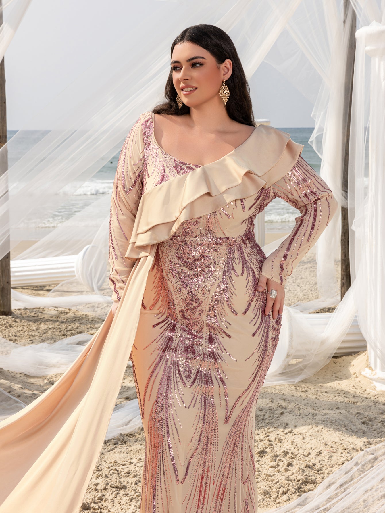 Make a bold statement with our glamorous evening gown, adorned with stunning sequins. The intricate sequin detailing creates a dazzling effect, perfect for capturing attention at any event. The gown features a unique one-shoulder ruffled detail that adds a touch of drama and sophistication. The long sleeves provide a chic and elegant look, while the fitted silhouette enhances your curves beautifully.