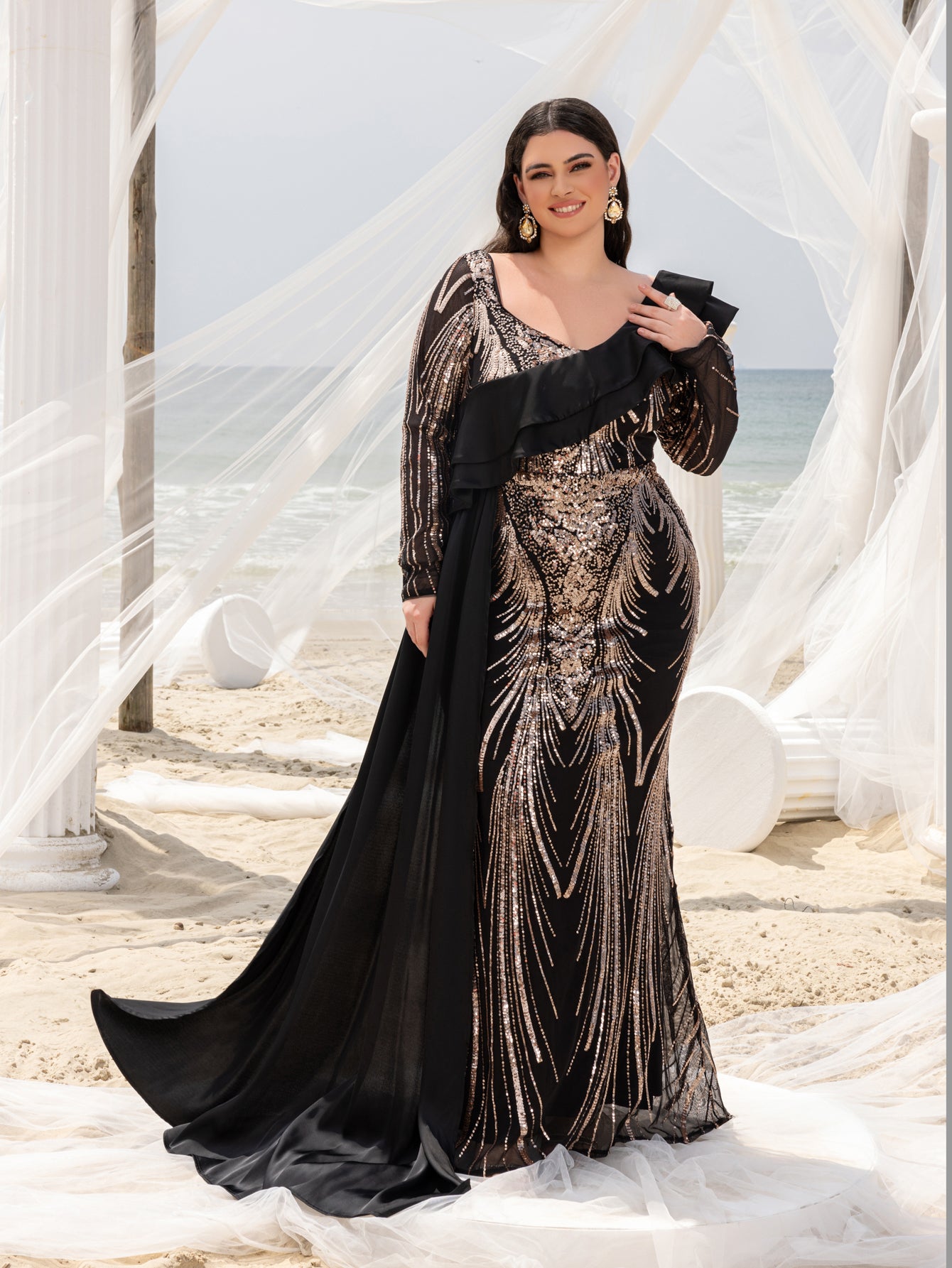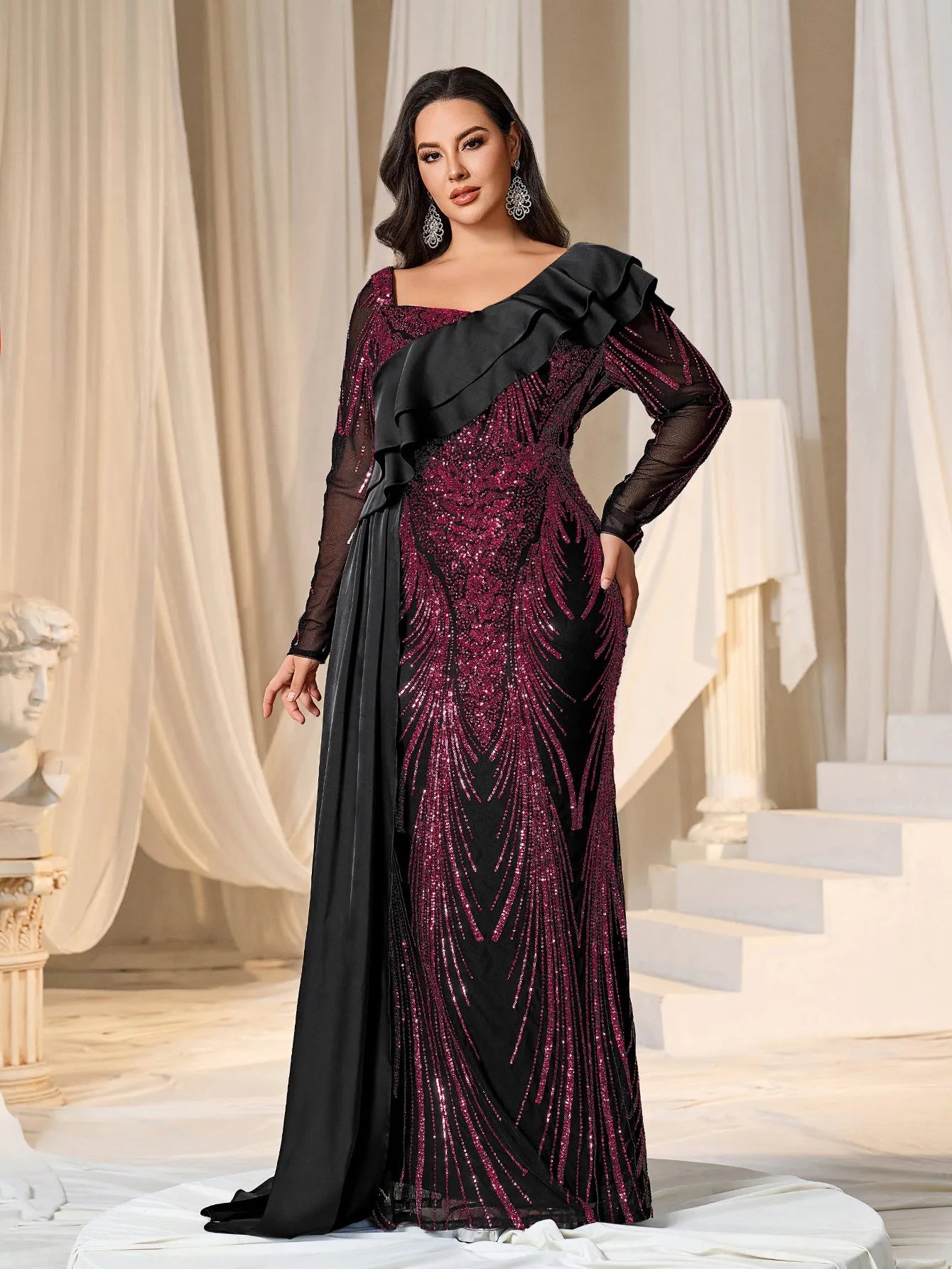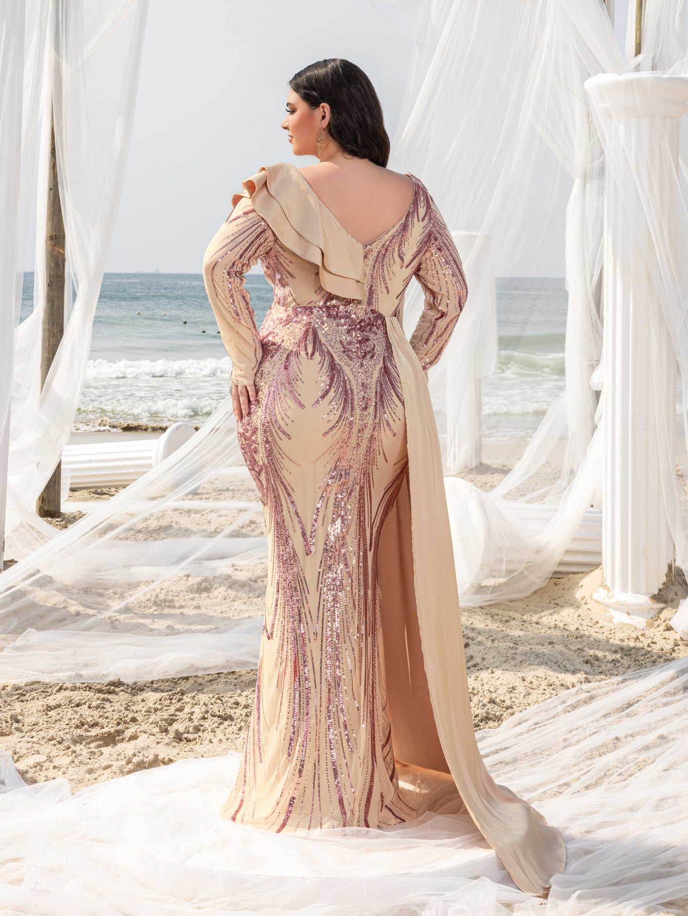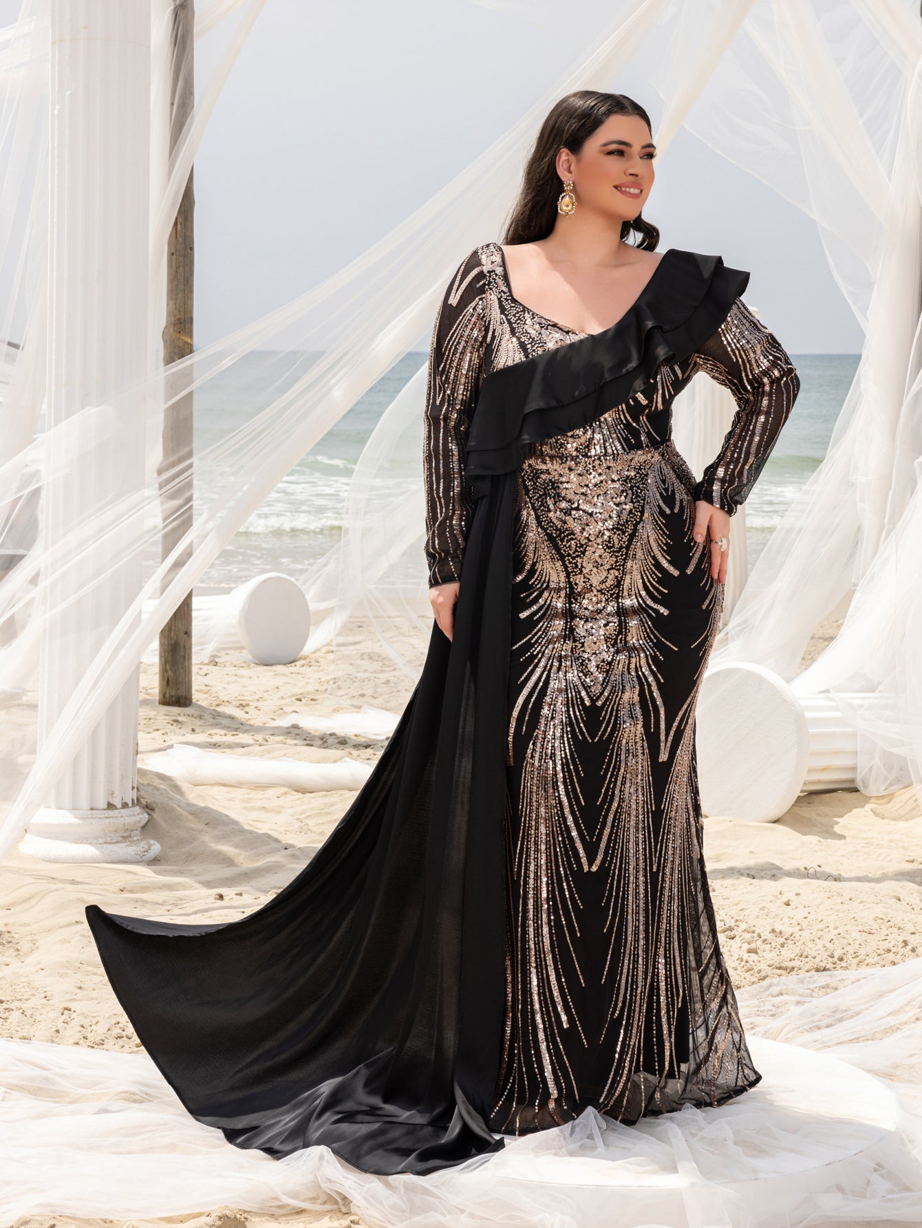 Make a bold statement with our glamorous evening gown, adorned with stunning sequins. The intricate sequin detailing creates a dazzling effect, perfect for capturing attention at any event. The gown features a unique one-shoulder ruffled detail that adds a touch of drama and sophistication. The long sleeves provide a chic and elegant look, while the fitted silhouette enhances your curves beautifully.