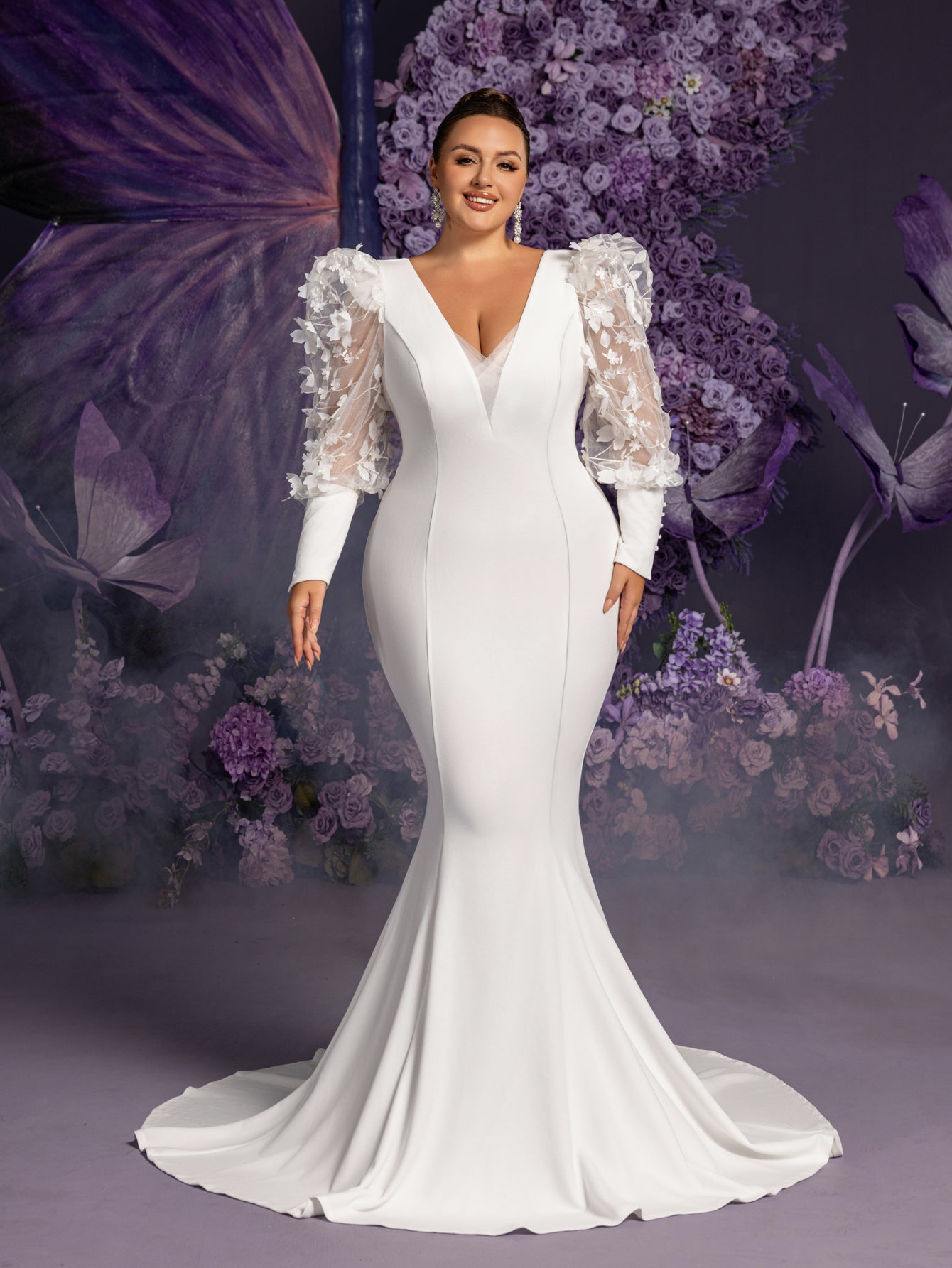 Plus Backless Applique Bishop Sleeves Mermaid Hem Evening Dress Wedding Dress
