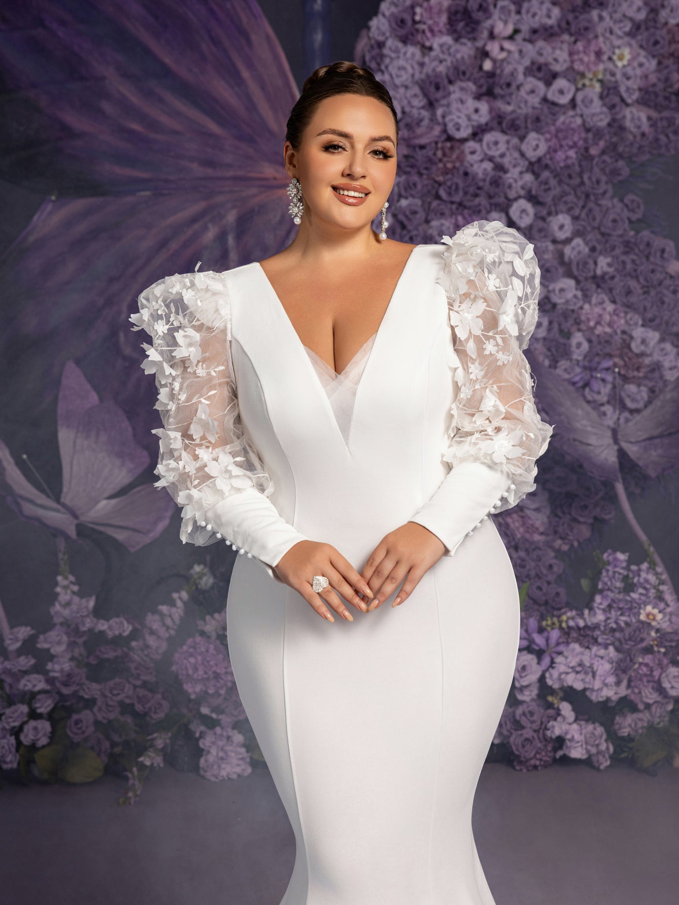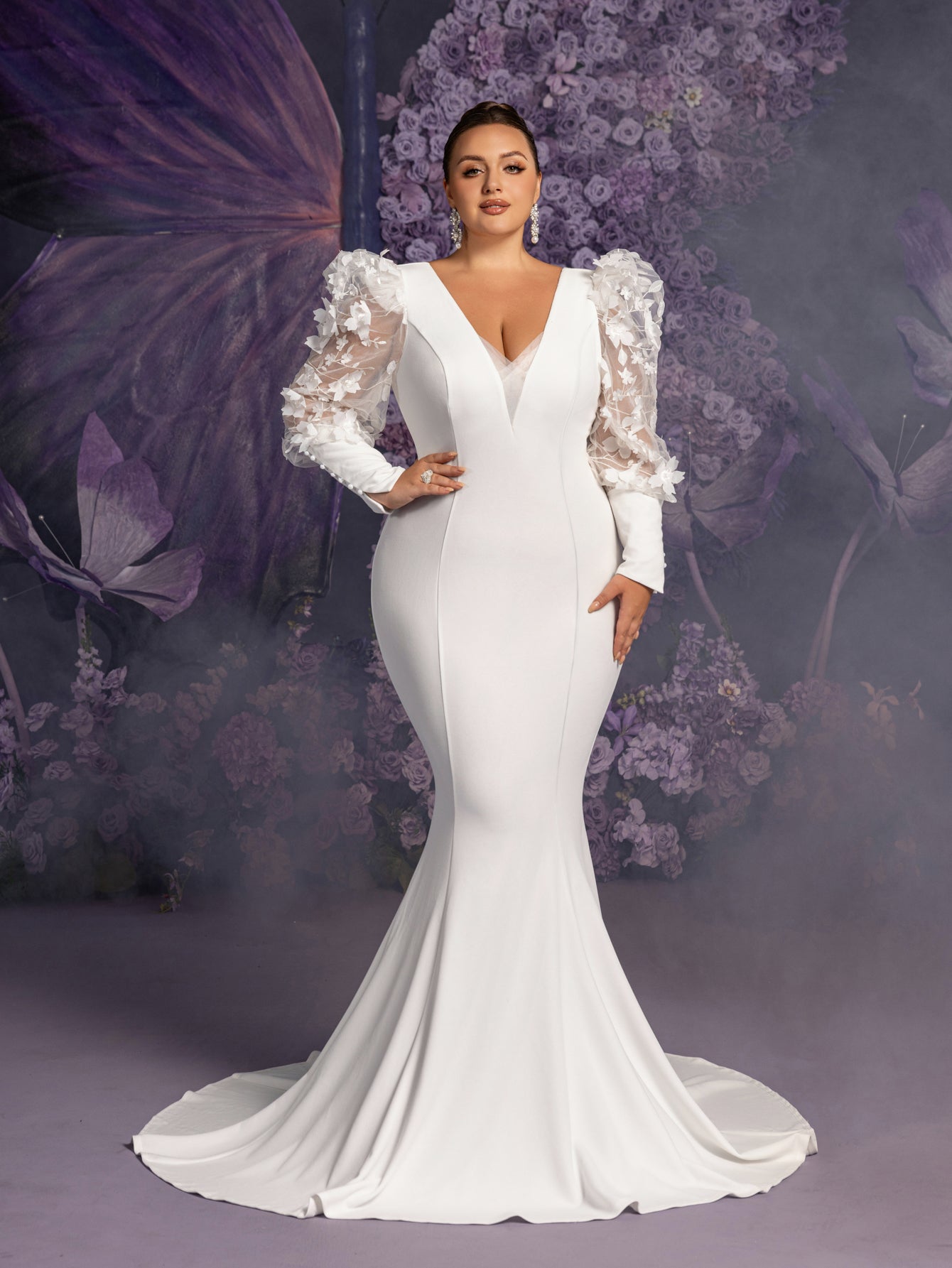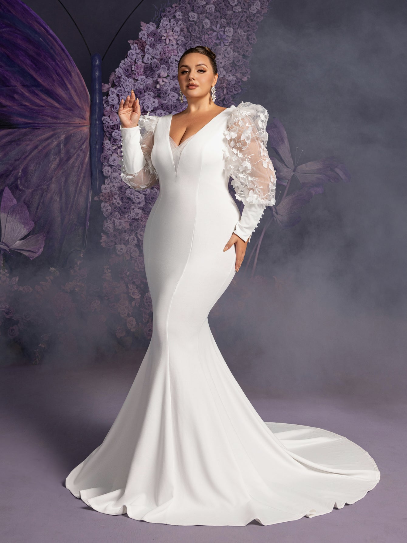 Elegant and sophisticated, this wedding gown is a masterpiece of design and craftsmanship. The gown features a deep V-neckline that accentuates the neckline while offering a touch of allure. The sleeves are adorned with intricate floral appliqués, adding a delicate and romantic touch to the overall design. The fitted silhouette of the gown flares out into a stunning mermaid train, creating a dramatic and graceful effect.