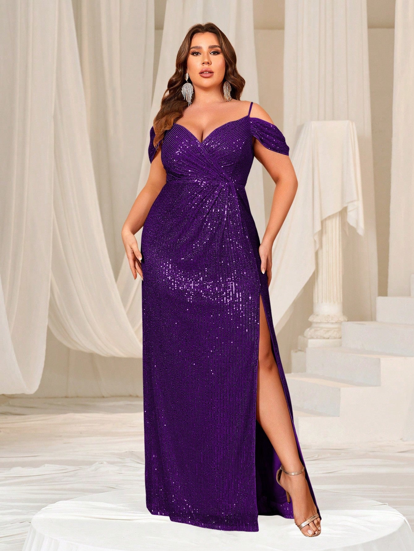 Step into elegance and shine with this breathtaking Plus Cold Shoulder Wrap Hem Sequin Cami Dress. Crafted to dazzle, this gown is embellished with shimmering sequins that gracefully catch the light. The cold shoulder detail adds a modern, sultry touch, while the wrap hem gives a flattering and curve-enhancing silhouette. A thigh-high slit elevates the allure of this gown, making it perfect for glamorous occasions. With a floor-length design and a soft gold hue, this dress ensures you’ll be the center of attention at any special event.