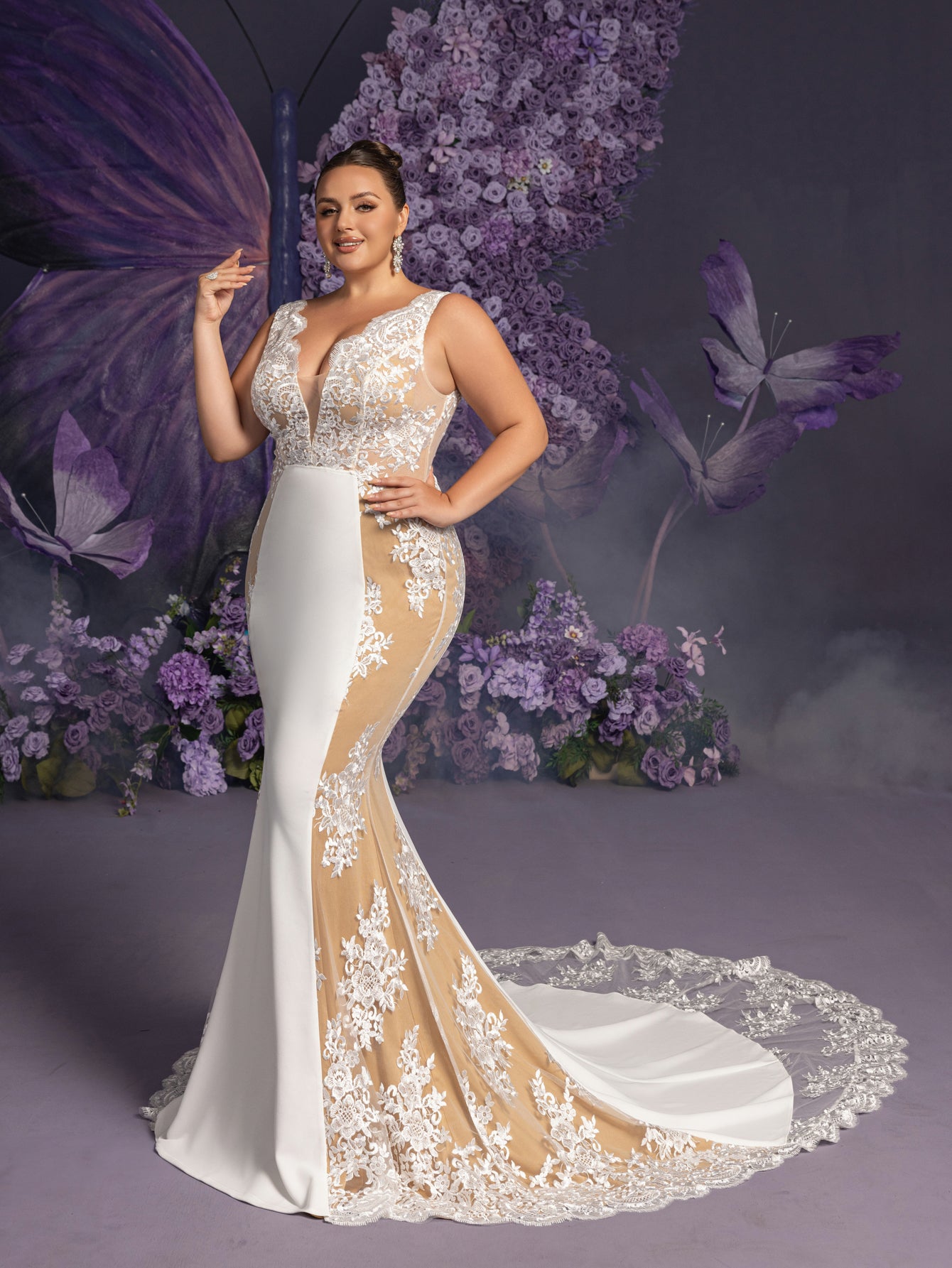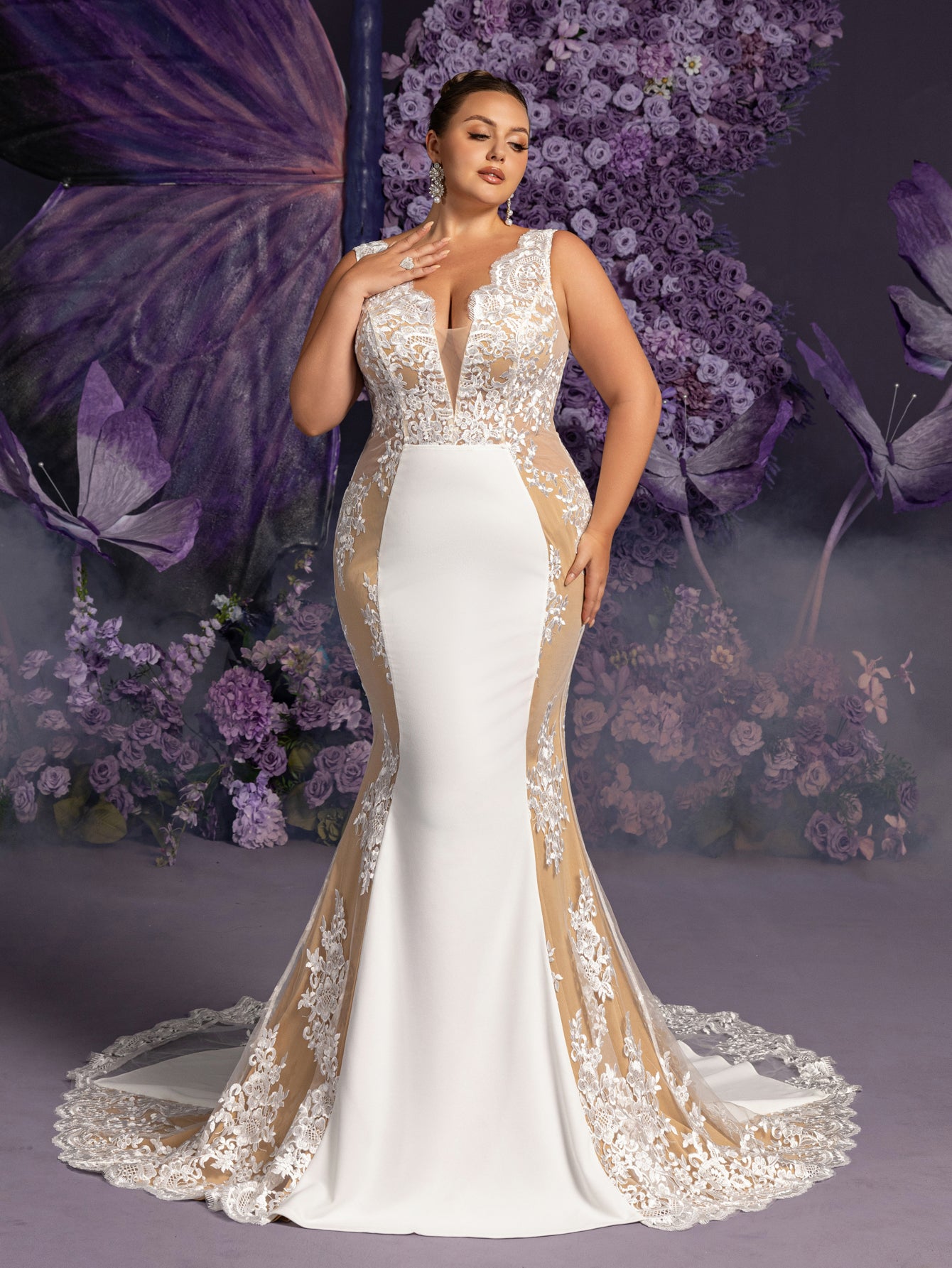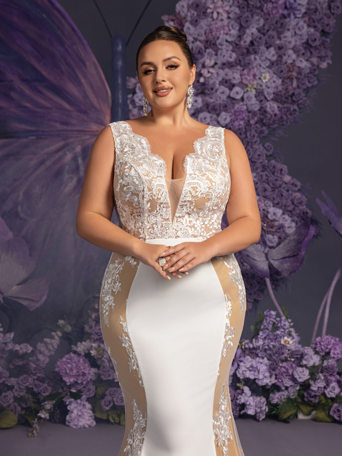 Plus Elegant Backless Contrast Lace Mermaid Hem Maxi Wedding Dress