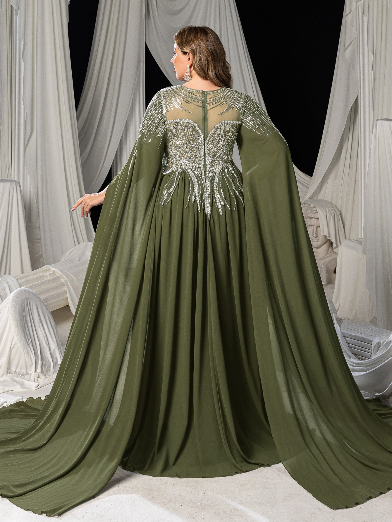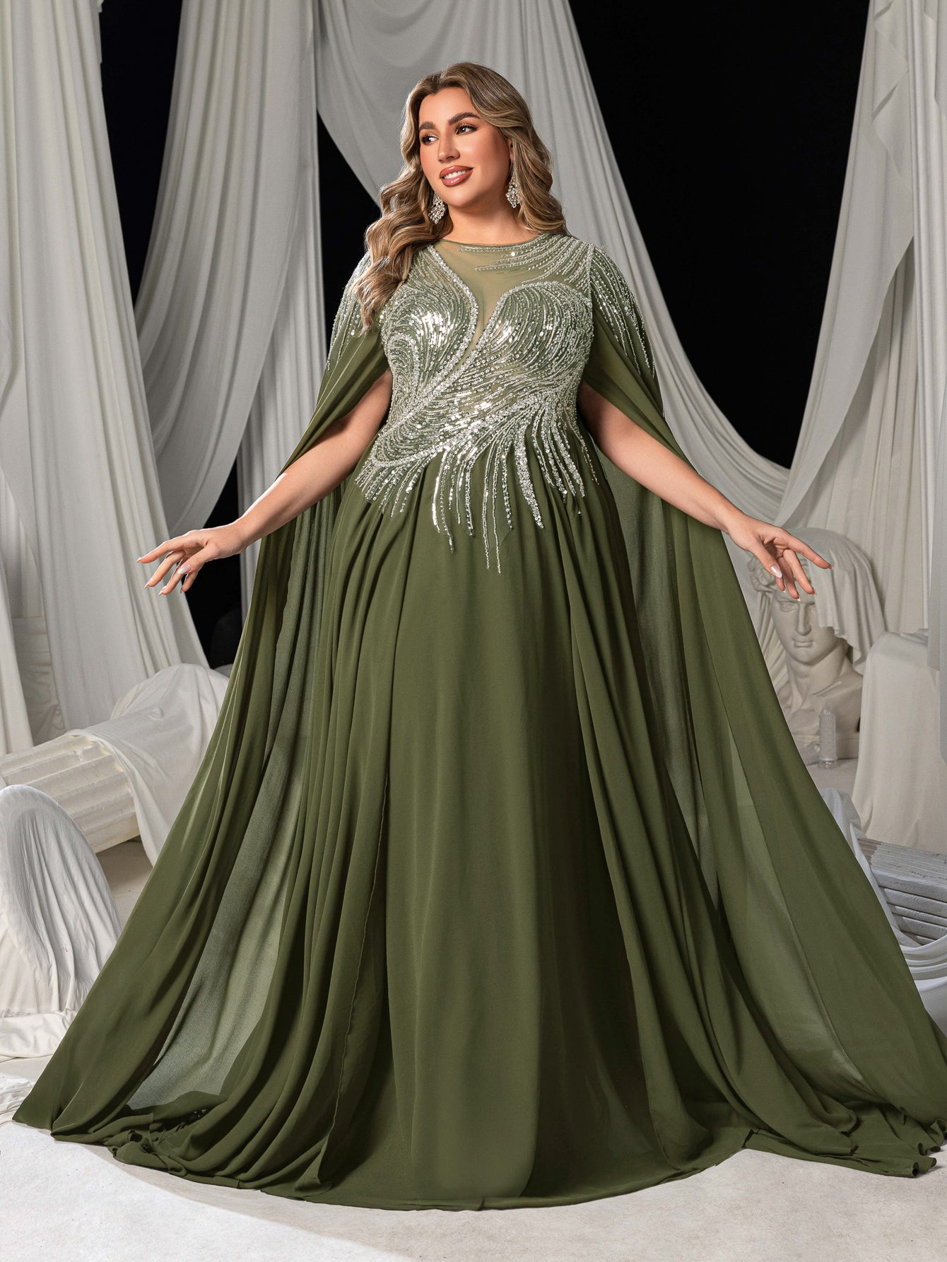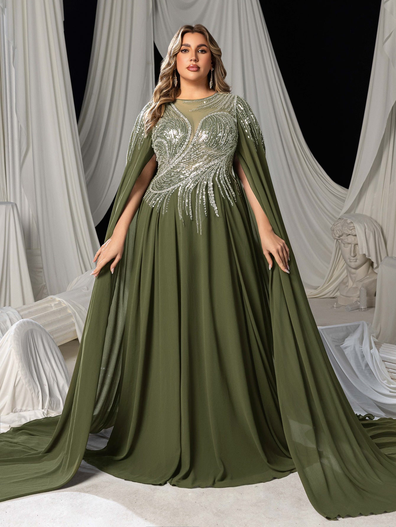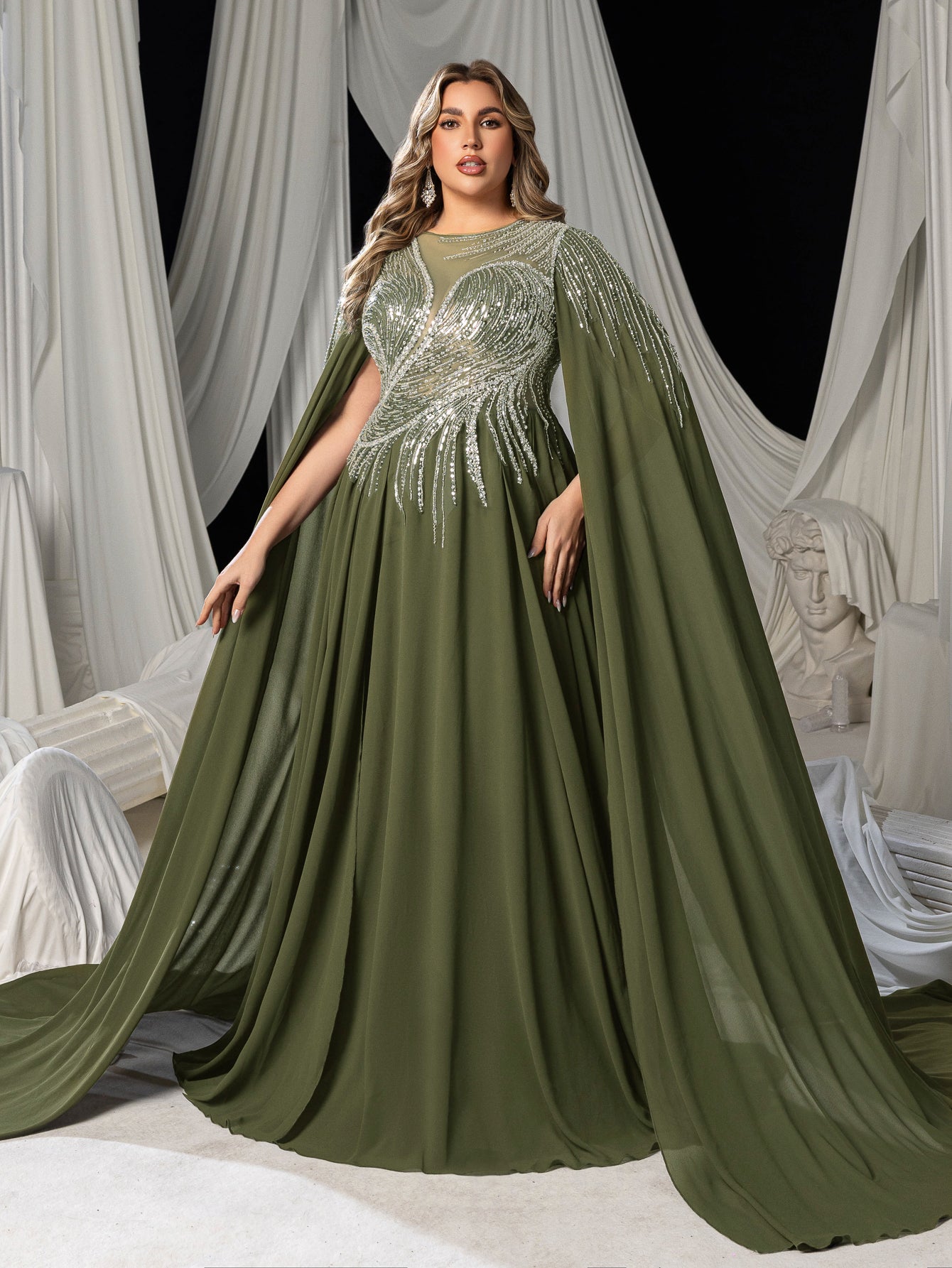 Plus Elegant Cape Sleeve Evening Gown with Beaded Floral Embroidered Bodice & Flowing Train