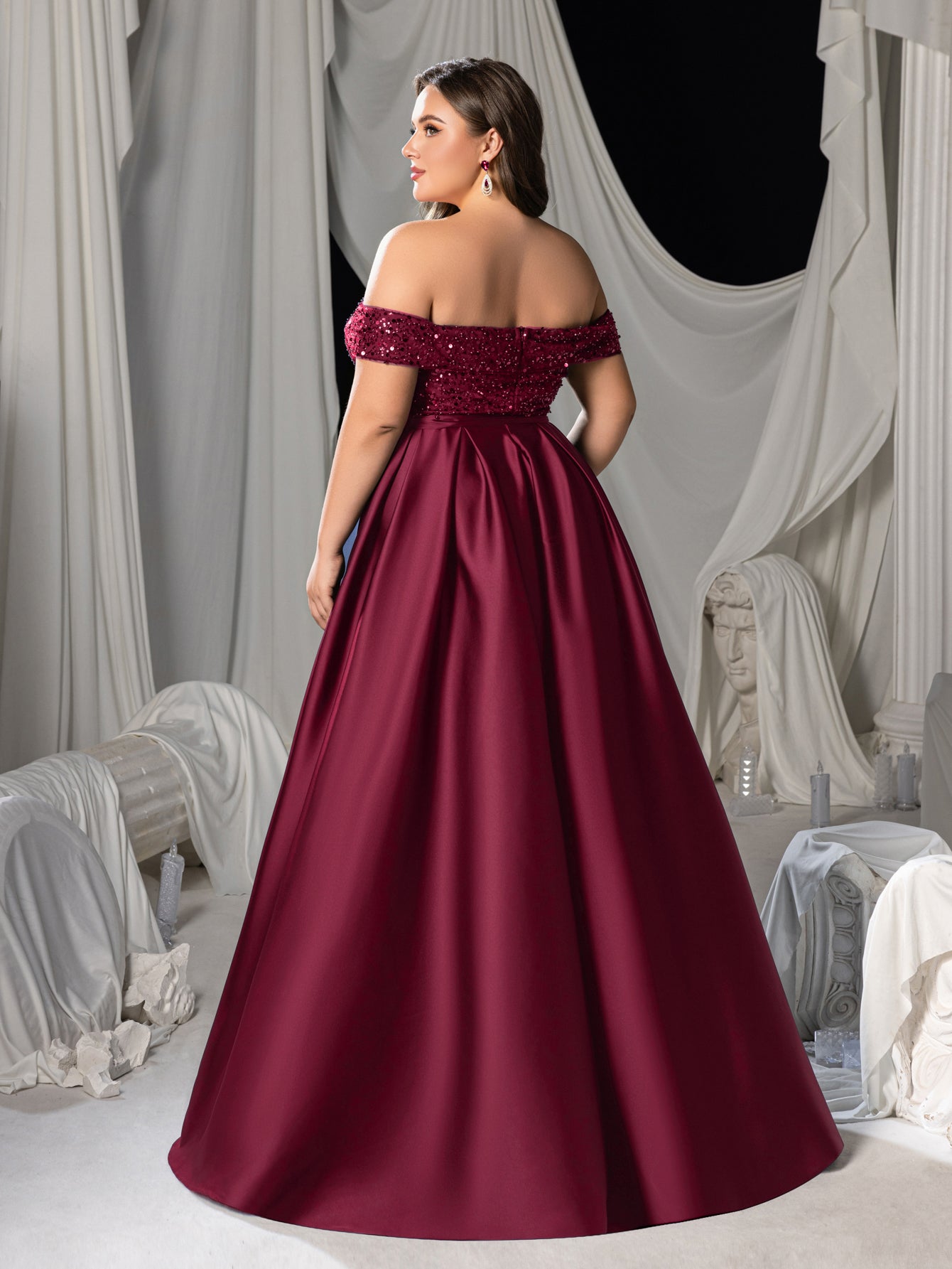 Plus Elegant Off-Shoulder Evening Gown with Sequin Embellishments – High Slit Satin Skirt & Back Zipper for Luxury Weddings or Evening Glam
