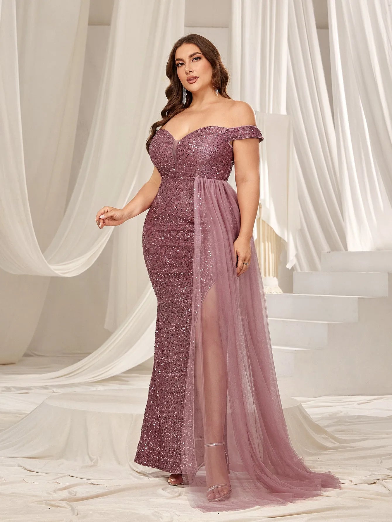 Plus Elegant Off Shoulder Split Thigh Sequin Formal Dress
