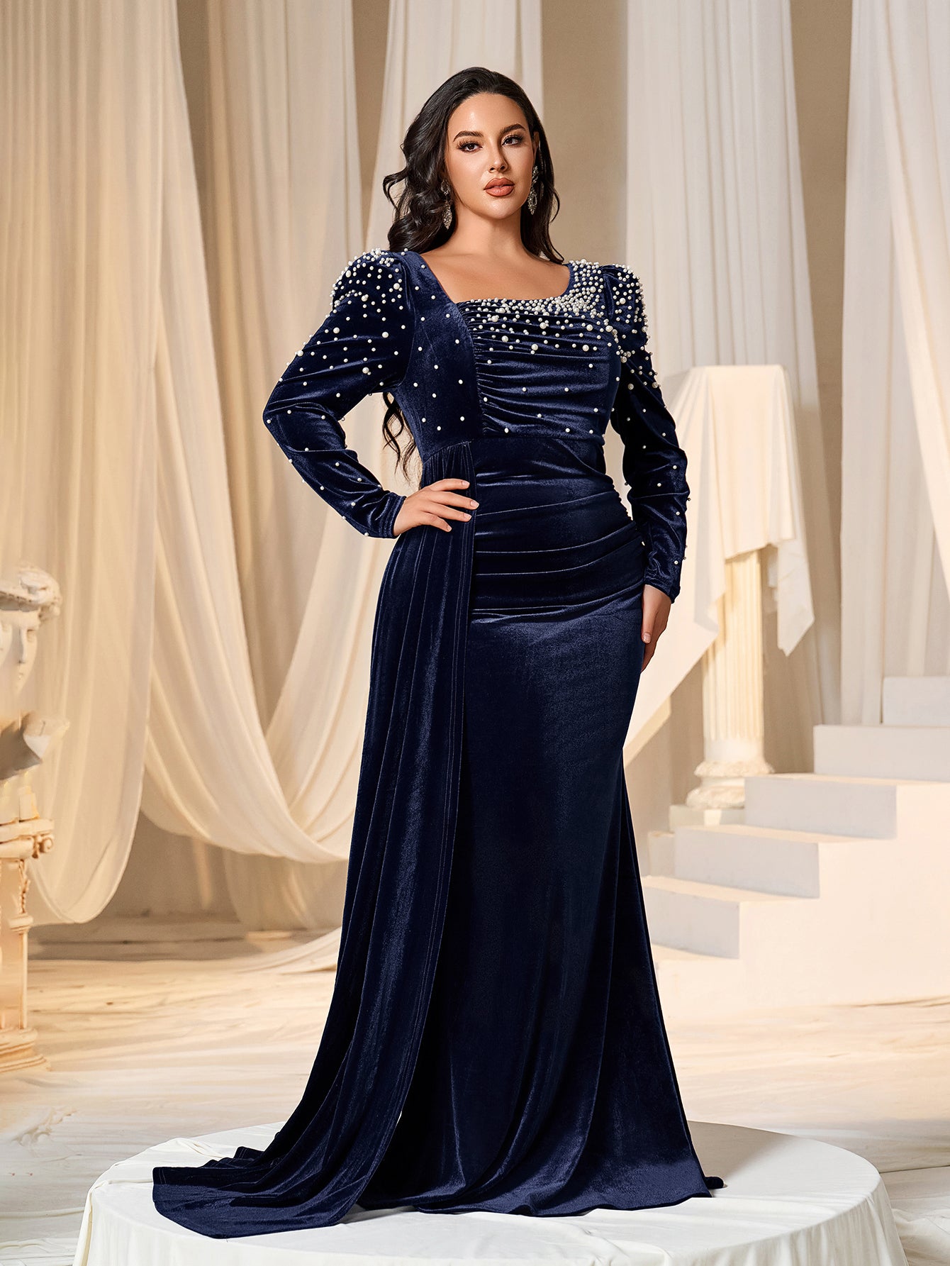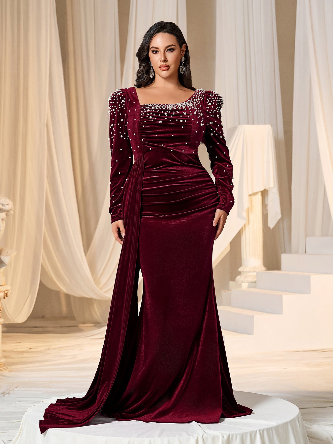 Exude opulence in our luxurious velvet gown, adorned with exquisite pearl embellishments. This elegant dress features a fitted silhouette that enhances your curves, while the draped design adds a touch of sophistication. The gown has long sleeves embellished with pearls and a boat neckline, creating a regal and timeless look.