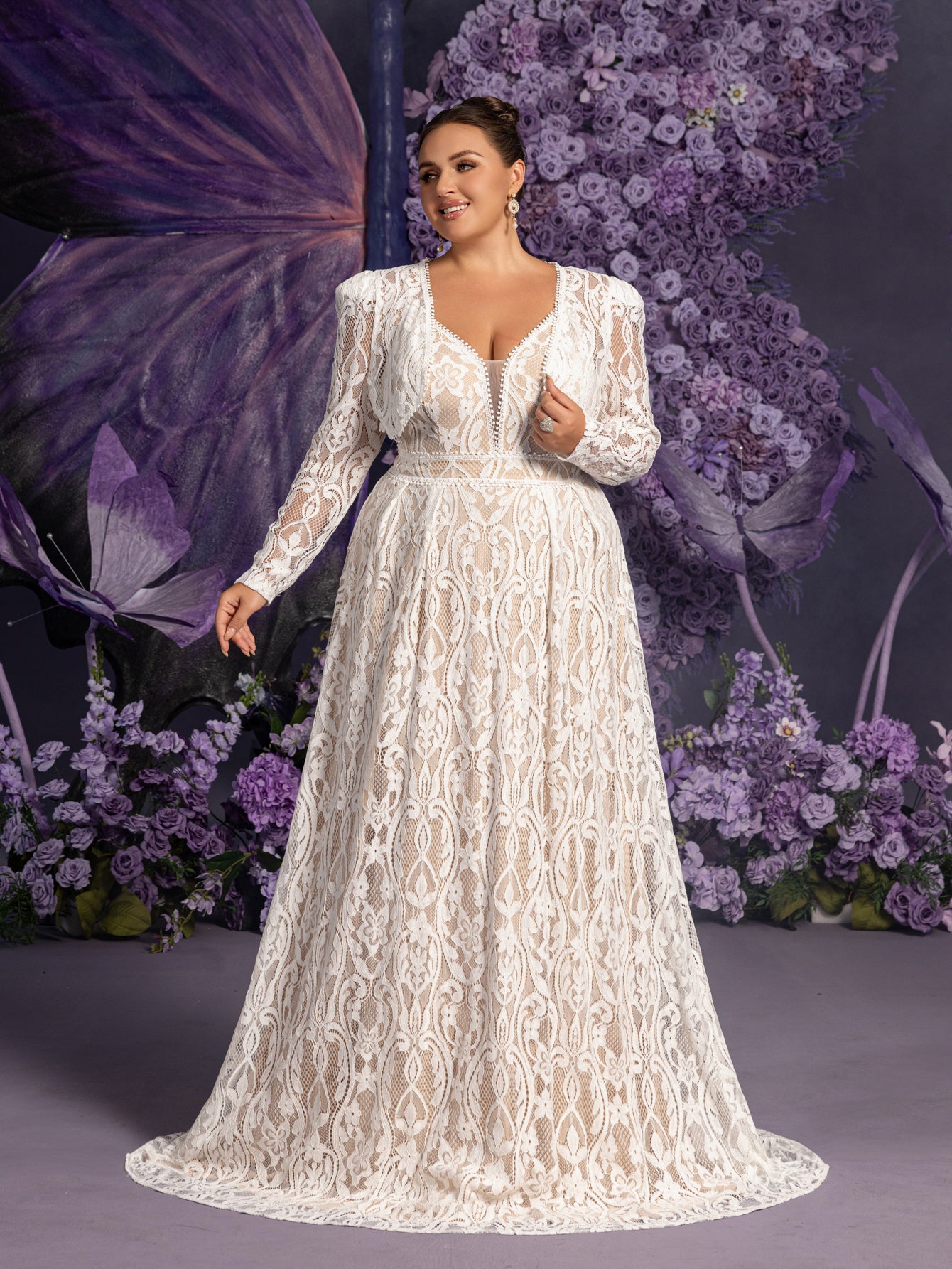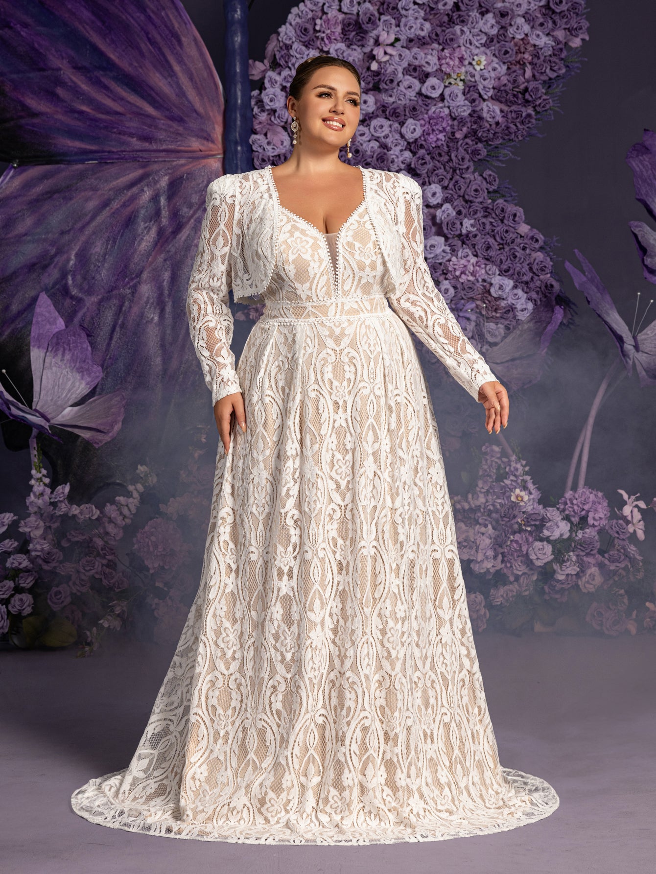 Step into timeless romance on your special day with our exquisitely crafted lace wedding dress. This gown features a deep V-neckline that perfectly balances elegance and allure, complemented by long, sheer lace sleeves for a vintage-inspired touch. The fitted bodice flows gracefully into a floor-length A-line skirt, adorned with delicate lace patterns that capture a classic, ethereal look. The open back adds a hint of modern sophistication, creating a memorable silhouette for the bride.