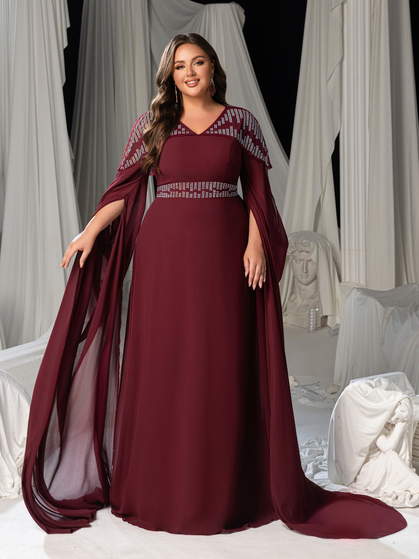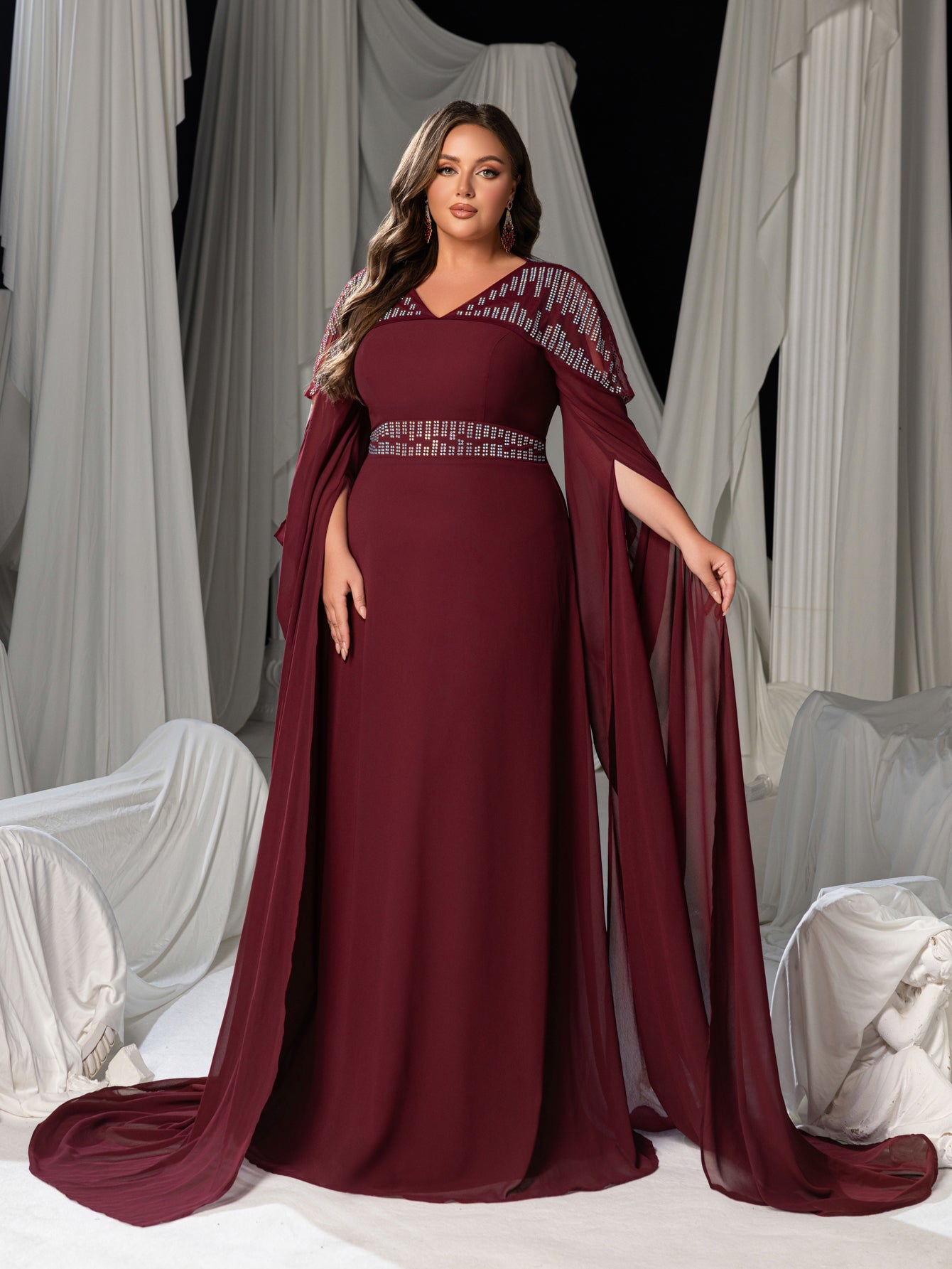Plus Ethereal Floor-Length Chiffon Evening Gown with V-Neckline, Wide Split & Voluminous Draped Sleeves, Rhinestone Bodice Unique Pattern
