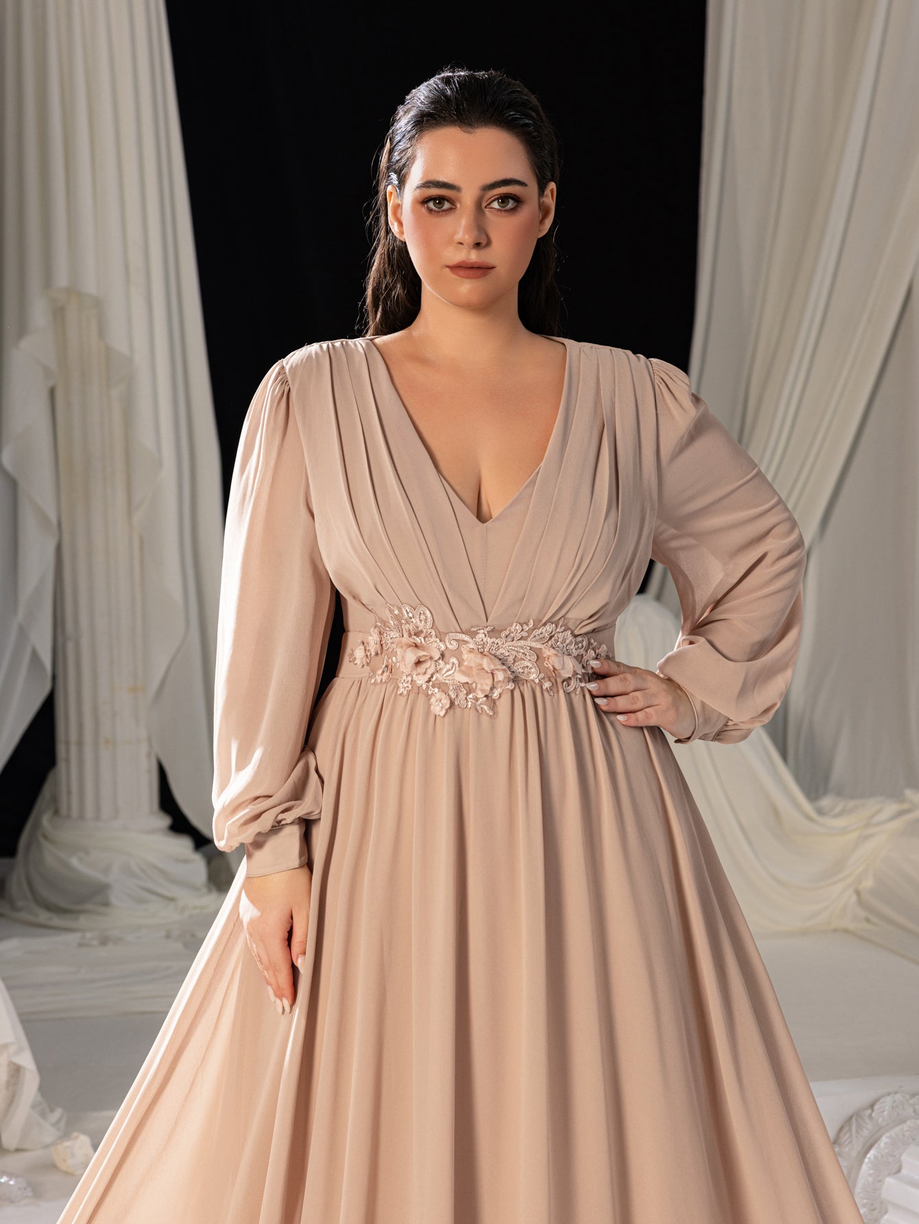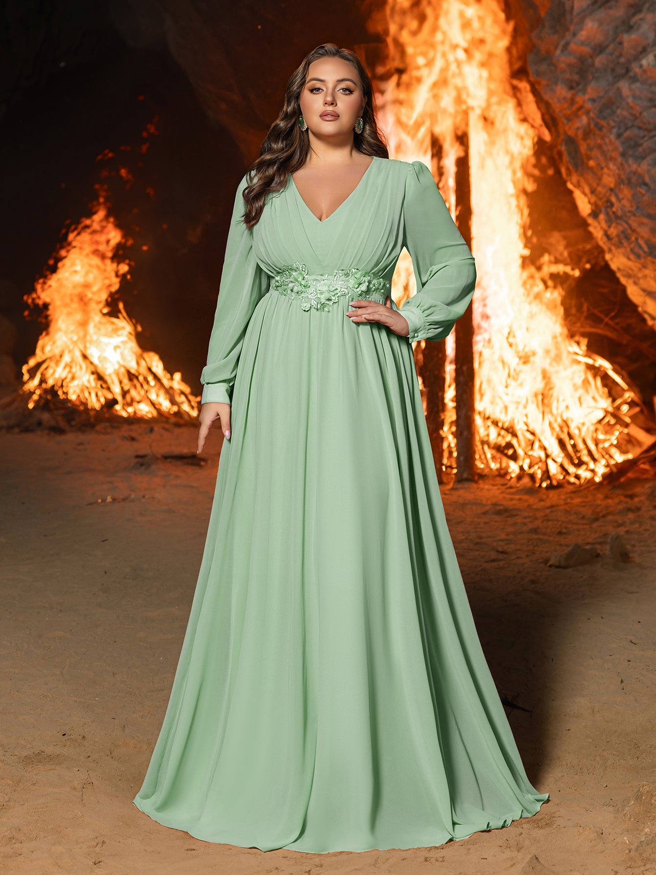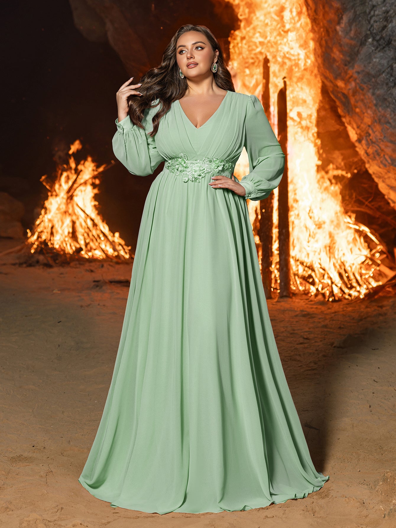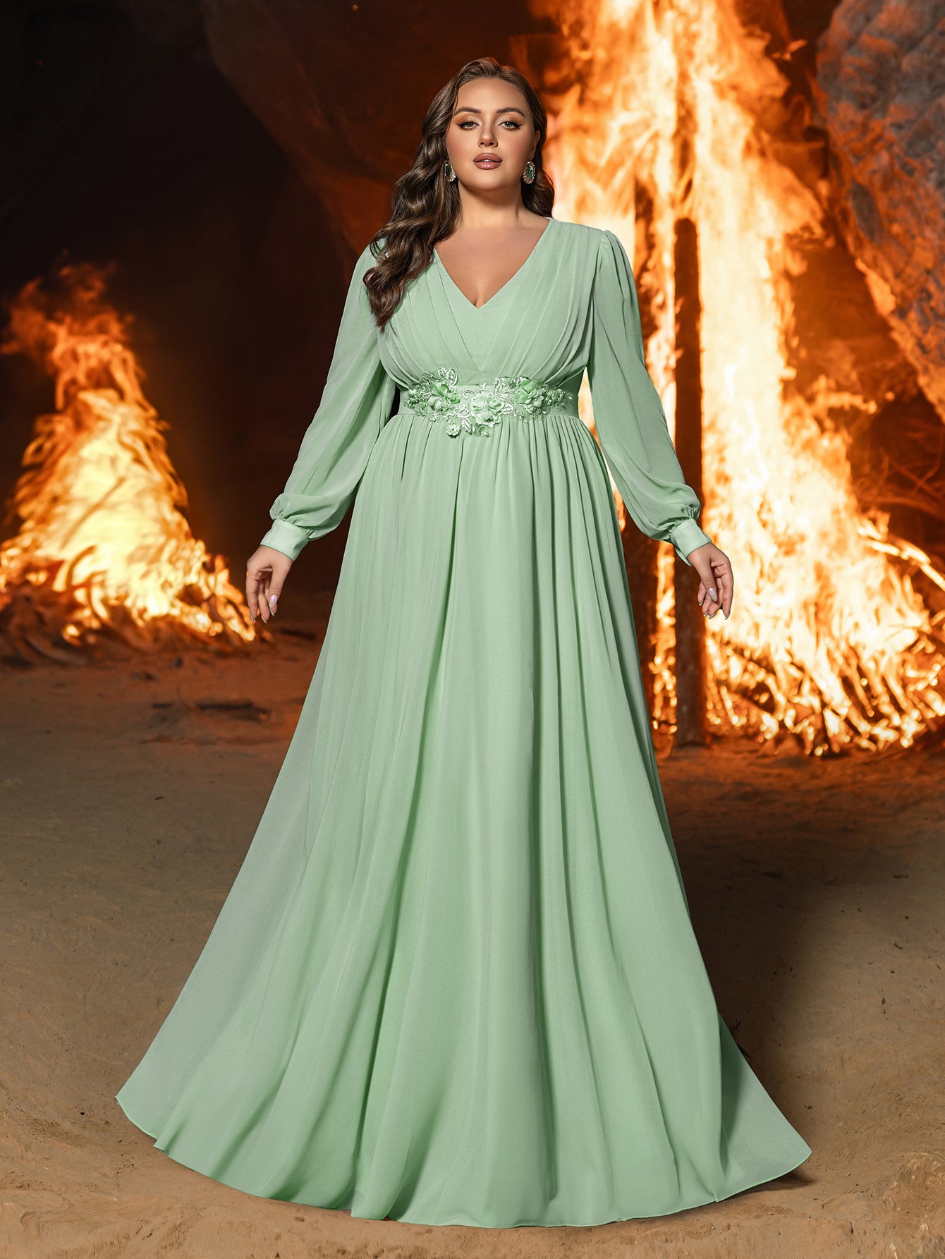 Turn heads at your next event with this luxurious chiffon evening gown. Designed for those who love to make a statement, this dress features an elegant V-neckline and a fitted bodice that beautifully accentuates your curves. The floor-length silhouette is complemented by long, sheer sleeves, adding a touch of modern sophistication. A delicate floral applique at the waist enhances the romantic and ethereal feel of this gown. Perfect for galas, weddings, or any special occasion, this gown combines classic glamour with contemporary style.