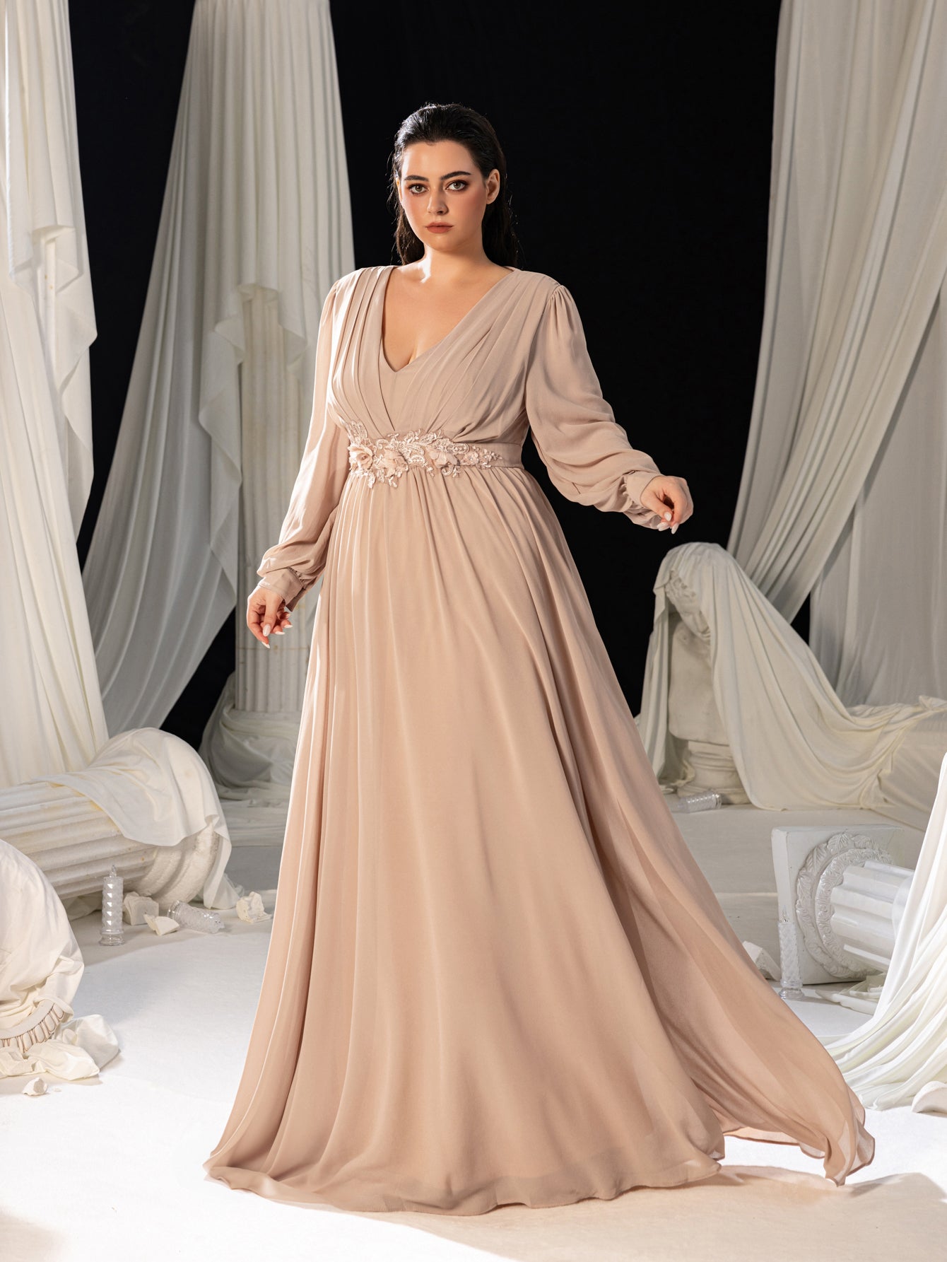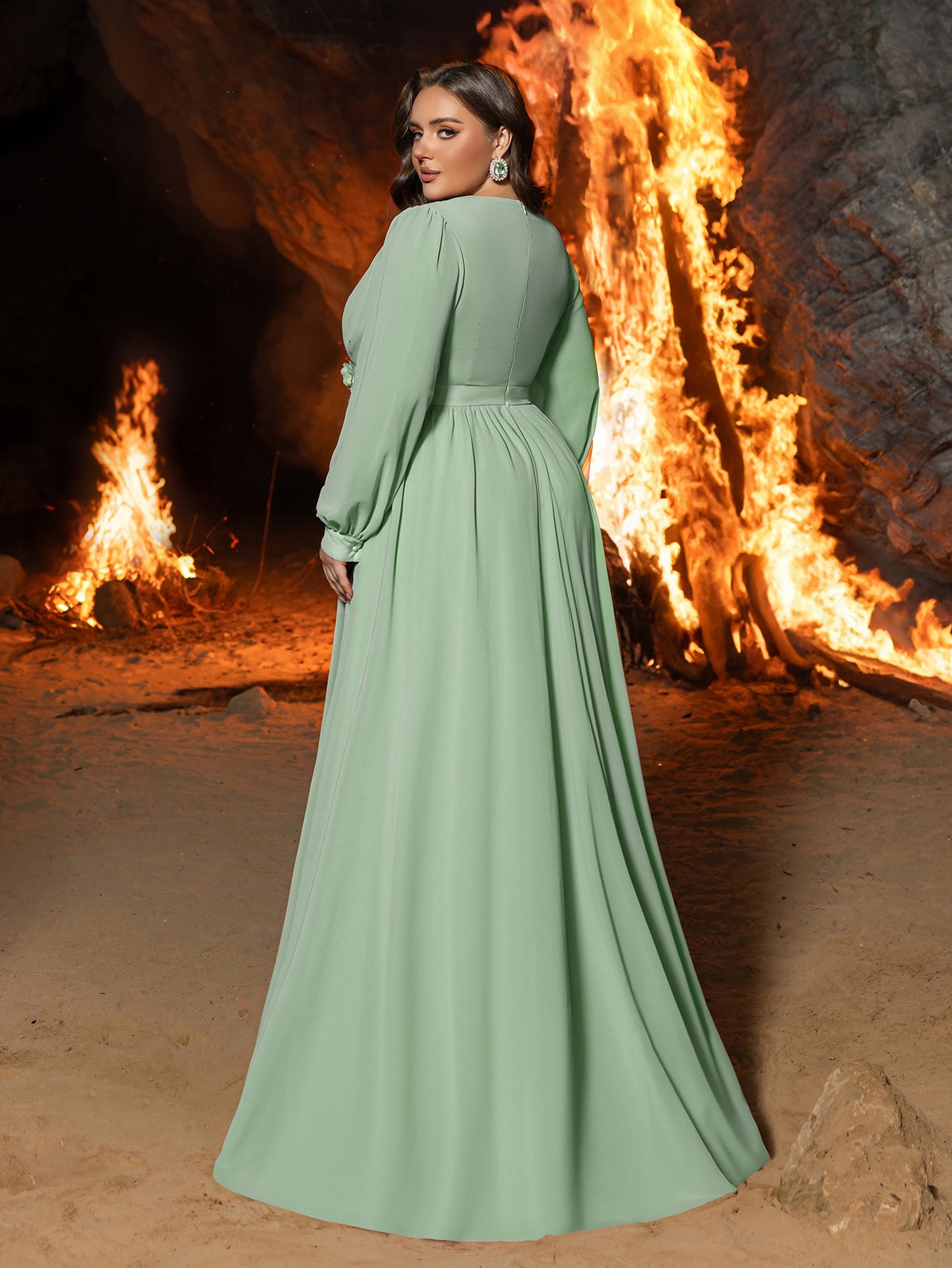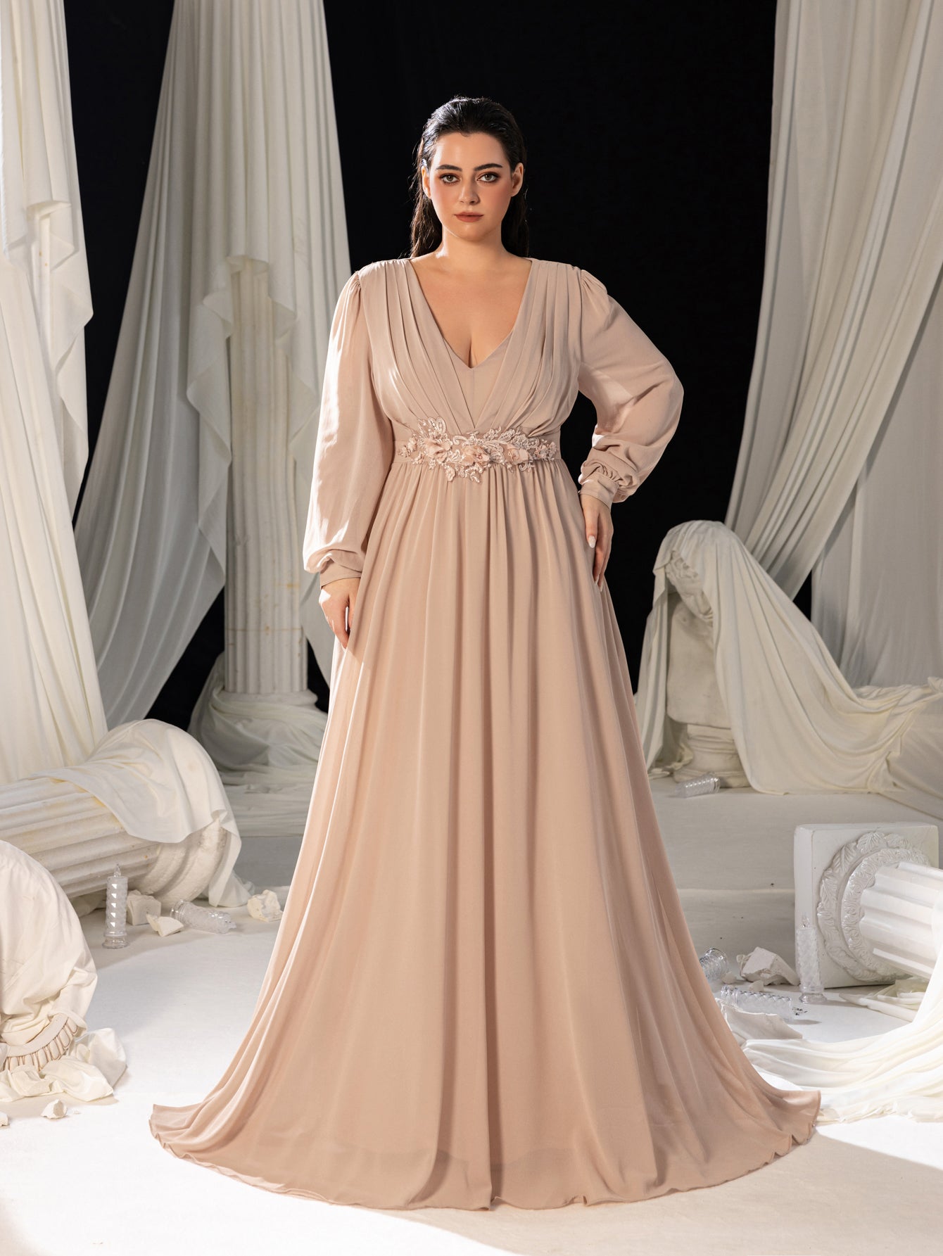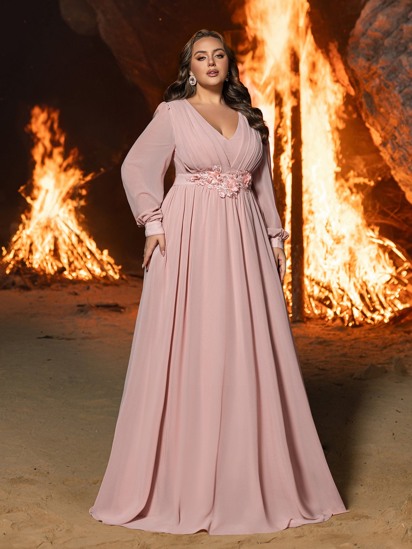 Turn heads at your next event with this luxurious chiffon evening gown. Designed for those who love to make a statement, this dress features an elegant V-neckline and a fitted bodice that beautifully accentuates your curves. The floor-length silhouette is complemented by long, sheer sleeves, adding a touch of modern sophistication. A delicate floral applique at the waist enhances the romantic and ethereal feel of this gown. Perfect for galas, weddings, or any special occasion, this gown combines classic glamour with contemporary style.