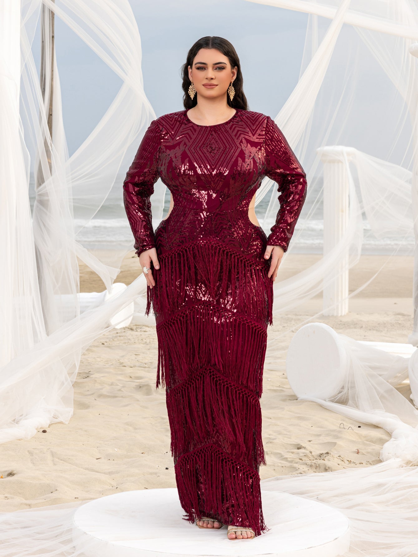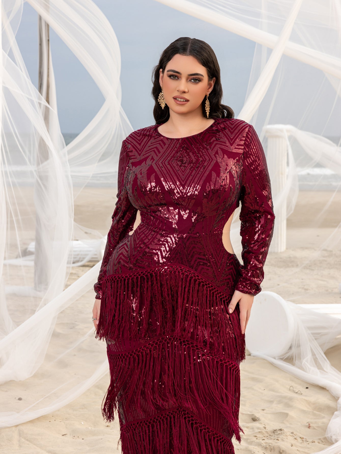 Turn heads in this stunning full-length gown, featuring intricate geometric sequin patterns that glisten with every movement. The dress boasts long sleeves and daring side cut-outs, accentuating your figure while adding a touch of modern sophistication. The luxurious fringe detailing cascades down the skirt, creating a mesmerizing effect as you walk. Perfect for glamorous events or upscale parties, this gown ensures you make a statement of elegance and style.