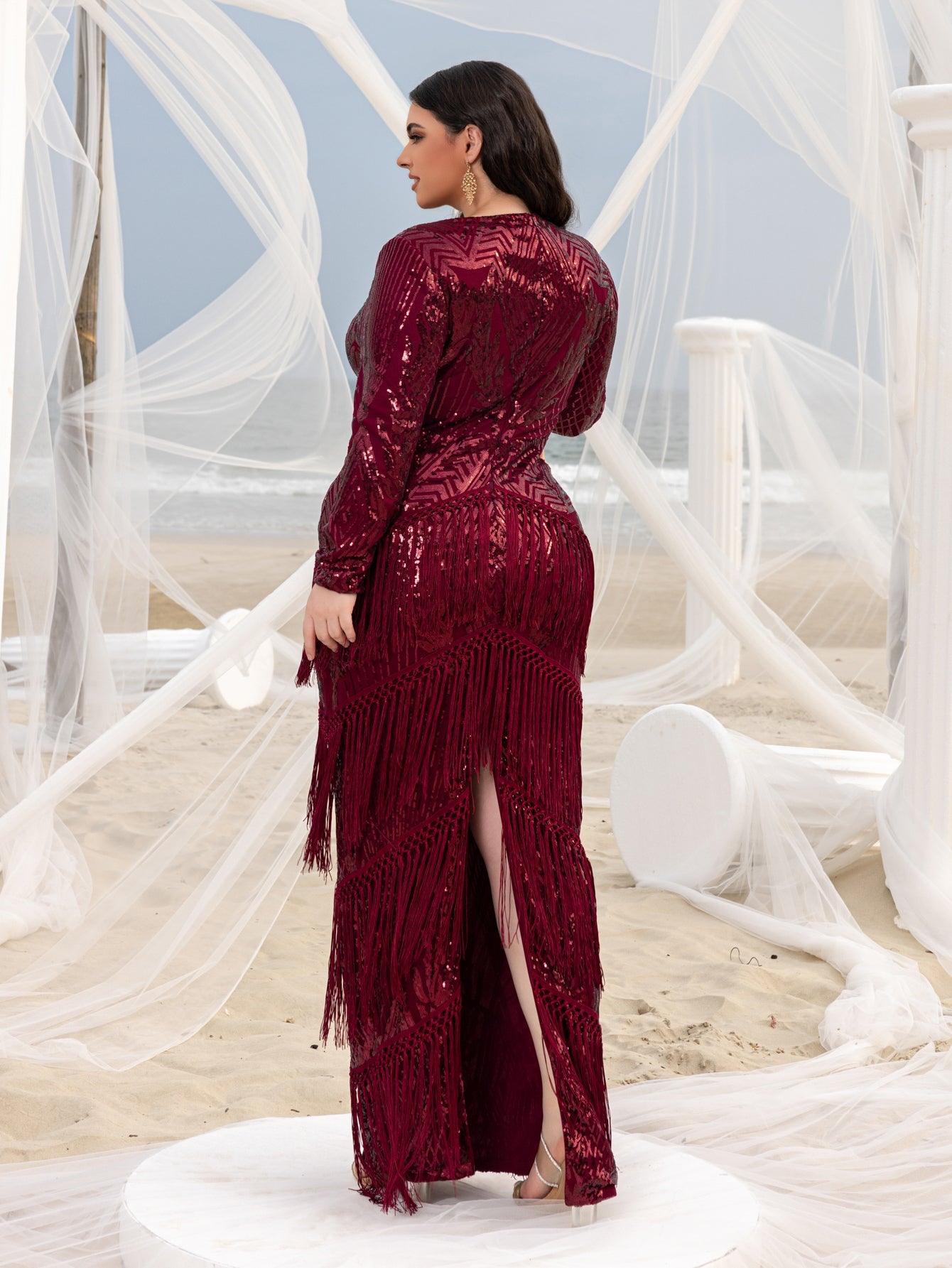 Step into the spotlight with confidence and grace in this breathtaking fringe sequin gown.