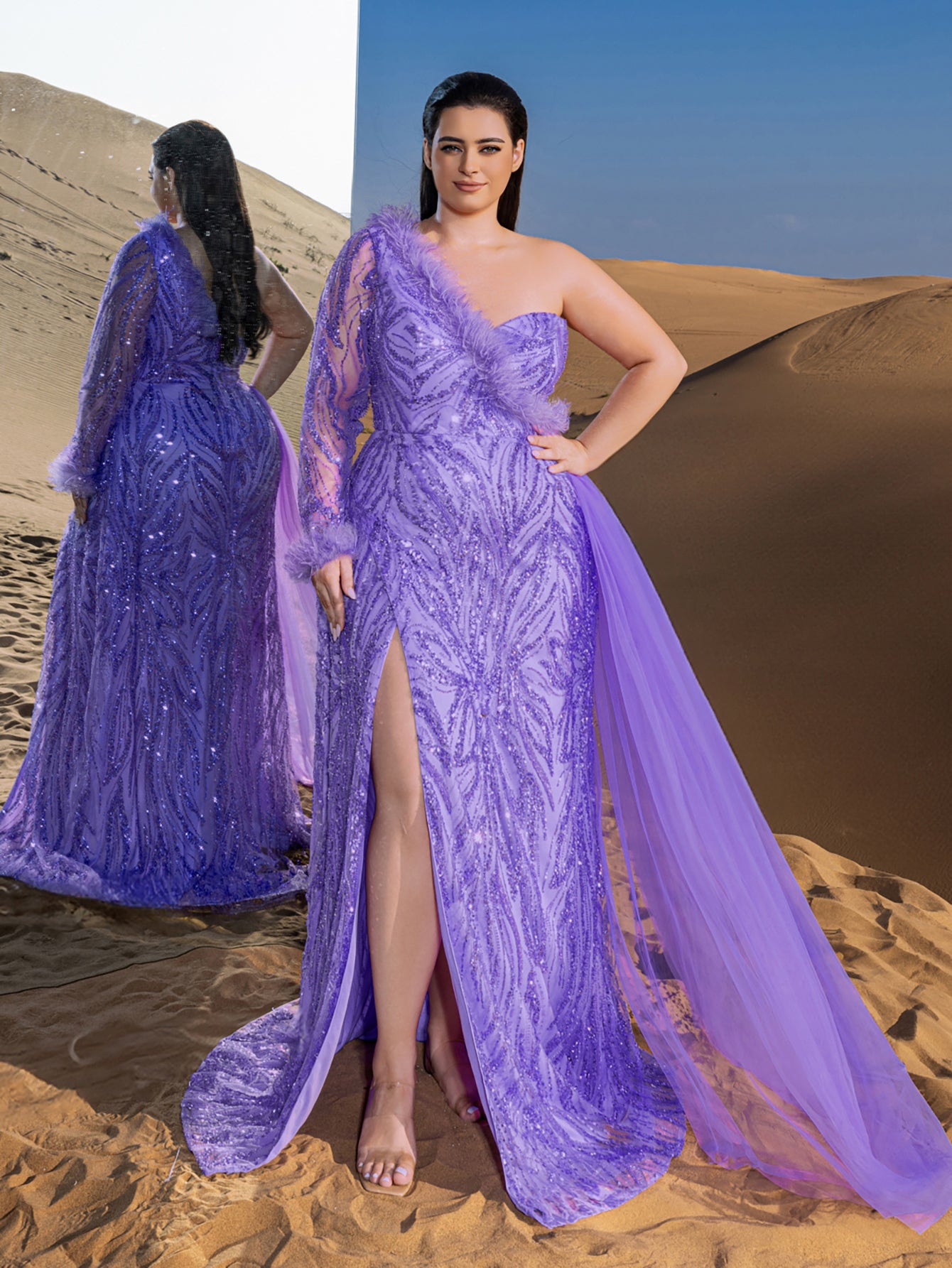 Plus Gorgeous Feather Trim One Shoulder Split Mermaid Hem Beaded Formal Dress Evening Dress