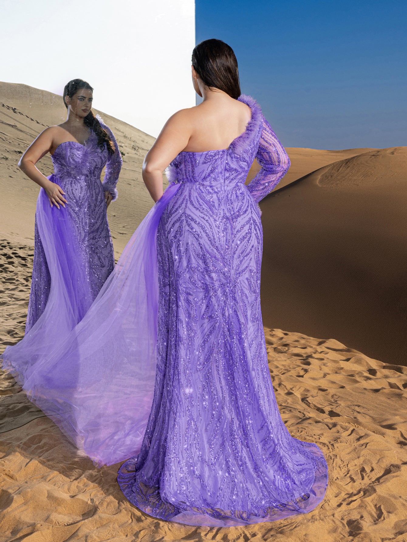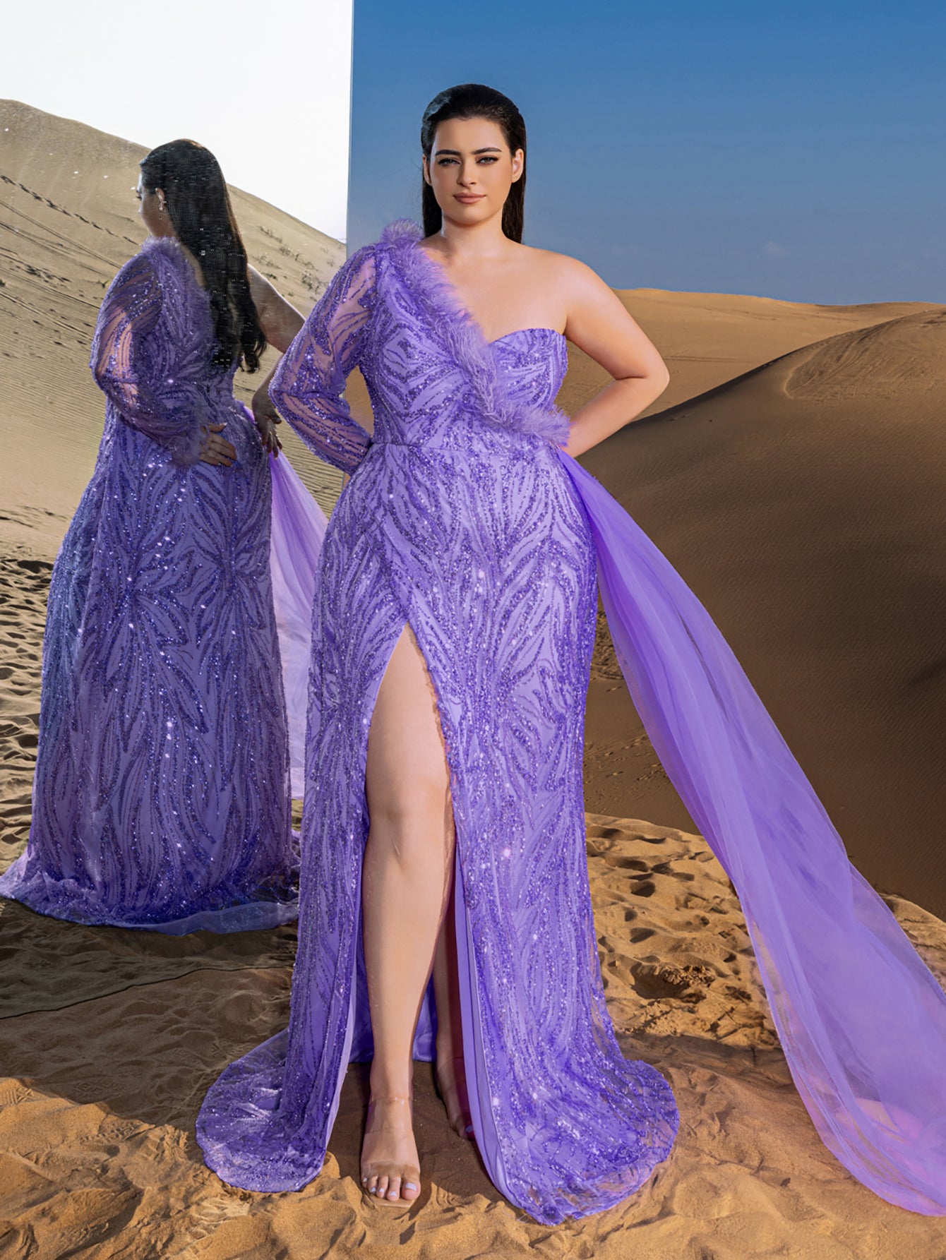 Elevate your style with our stunning beaded sequin evening gown, perfect for making a statement at any formal event. The gown features a one-shoulder neckline and a fitted bodice that accentuates your curves, leading to a dramatic high slit that adds a touch of allure. The intricate sequined fabric creates a luxurious and glamorous look, while the feathered details on the sleeves add a whimsical touch.