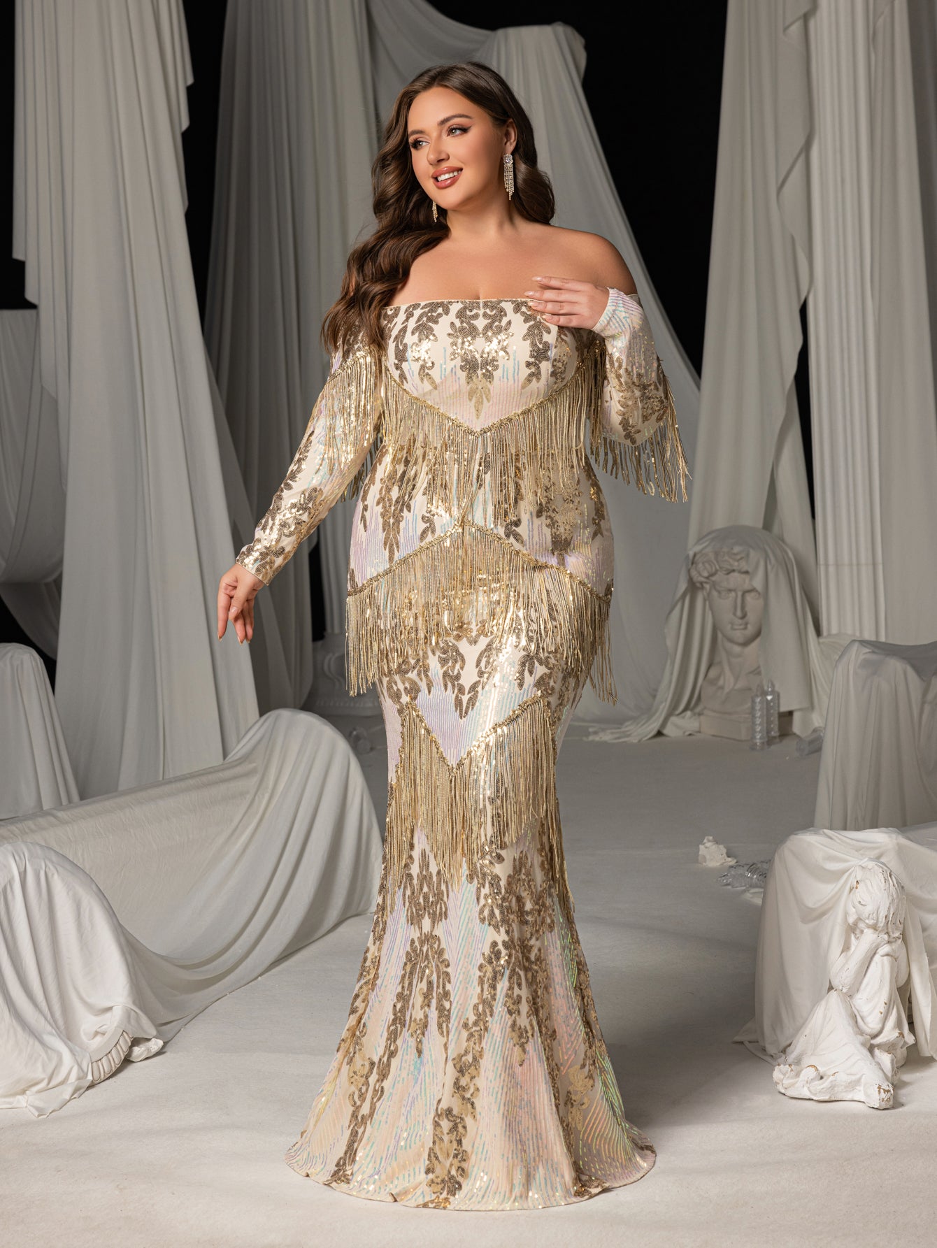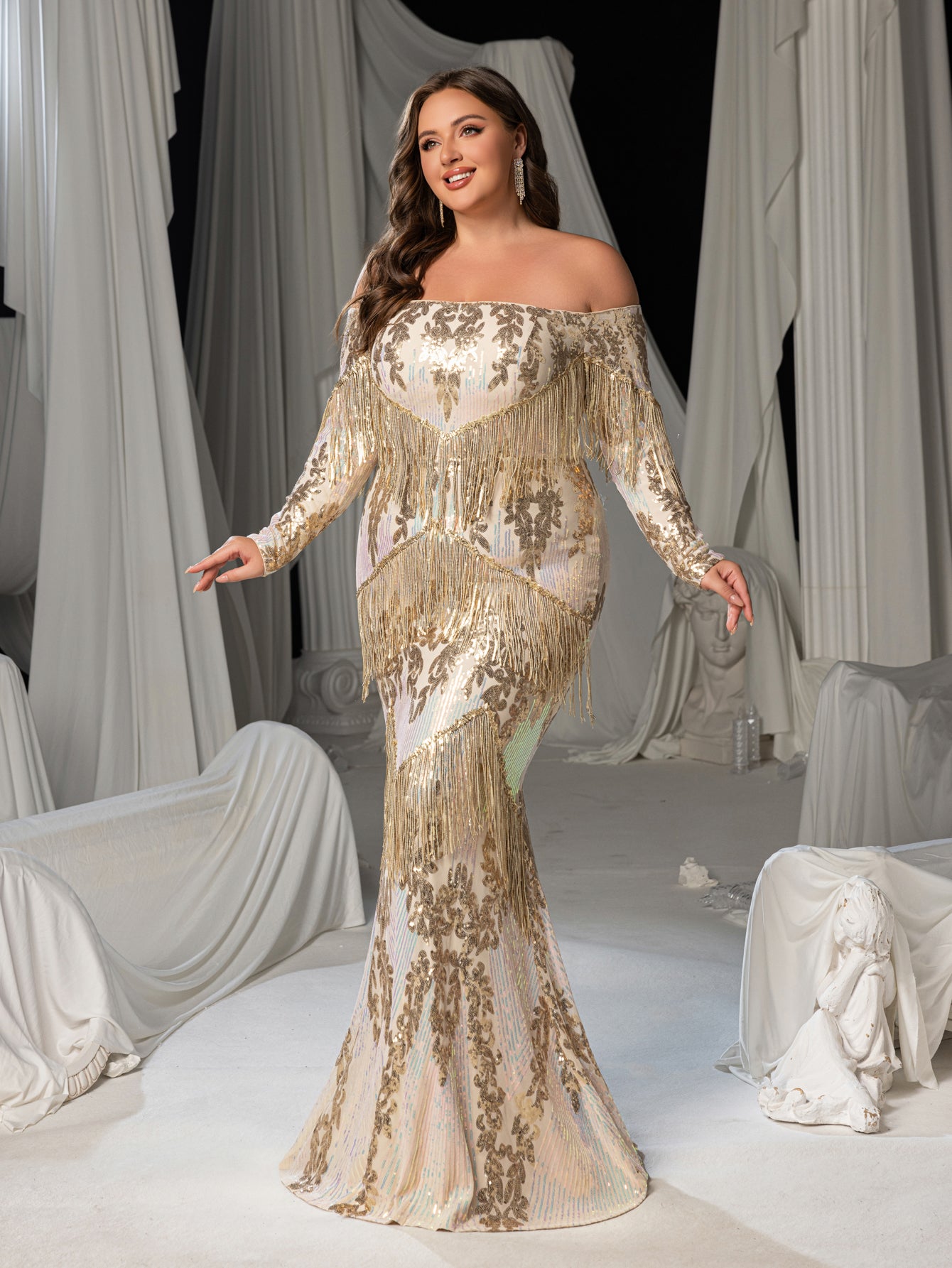 Elevate your elegance with our stunning floor-length gown, perfect for any glamorous occasion. The gown boasts an off-shoulder neckline that accentuates your shoulders and neckline, while the long sleeves add a touch of sophistication. The intricate gold sequin embroidery and fringe details create a mesmerizing texture and visual interest, making you the center of attention.