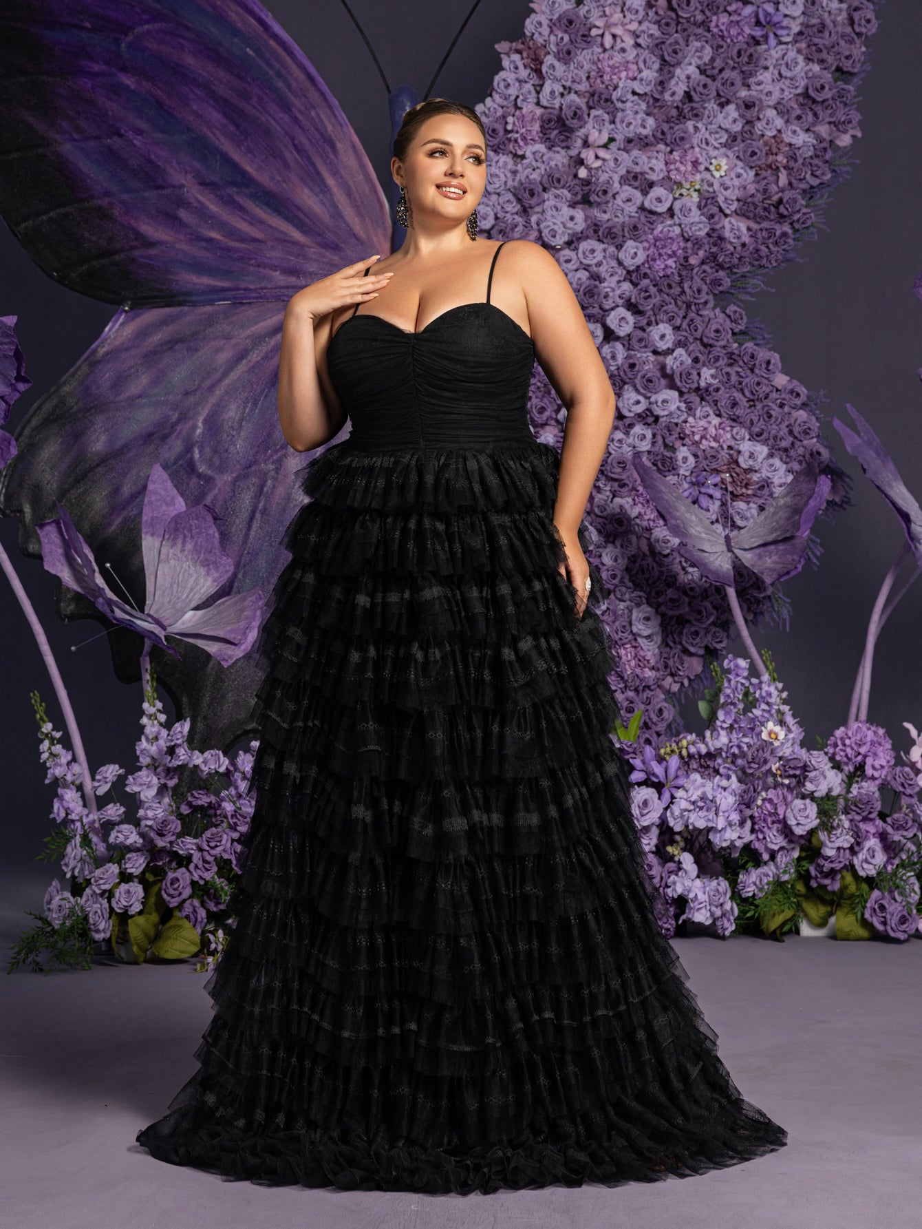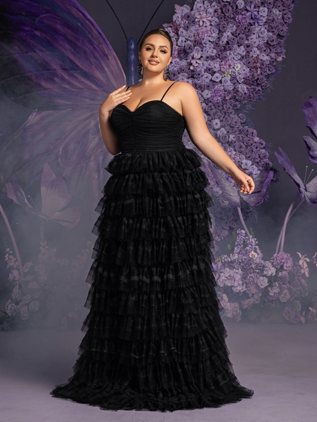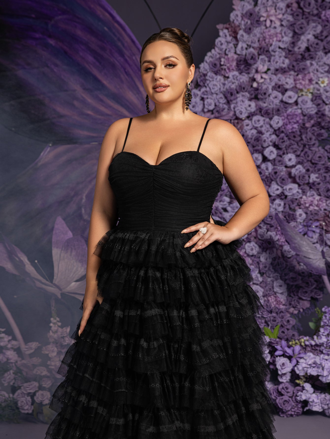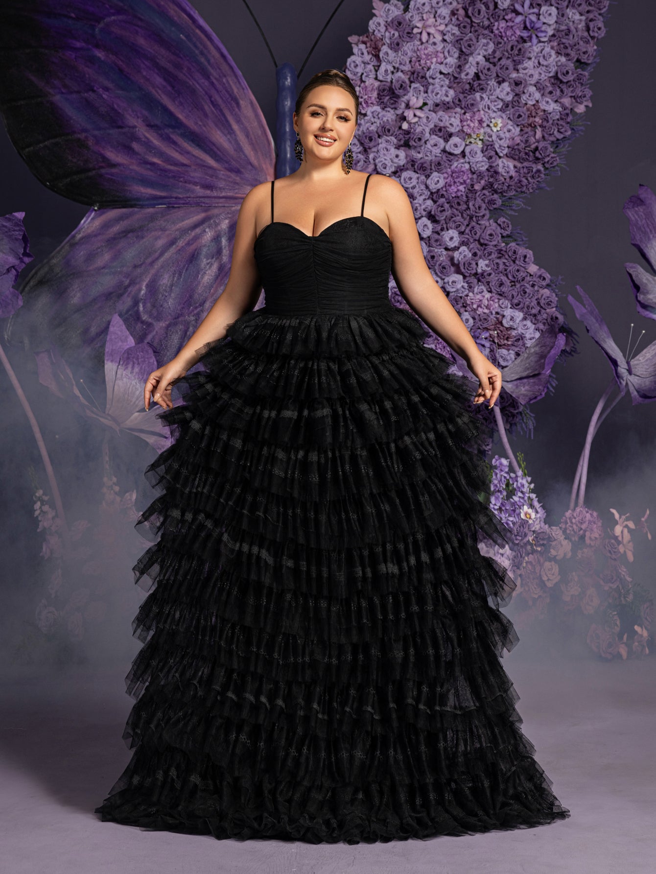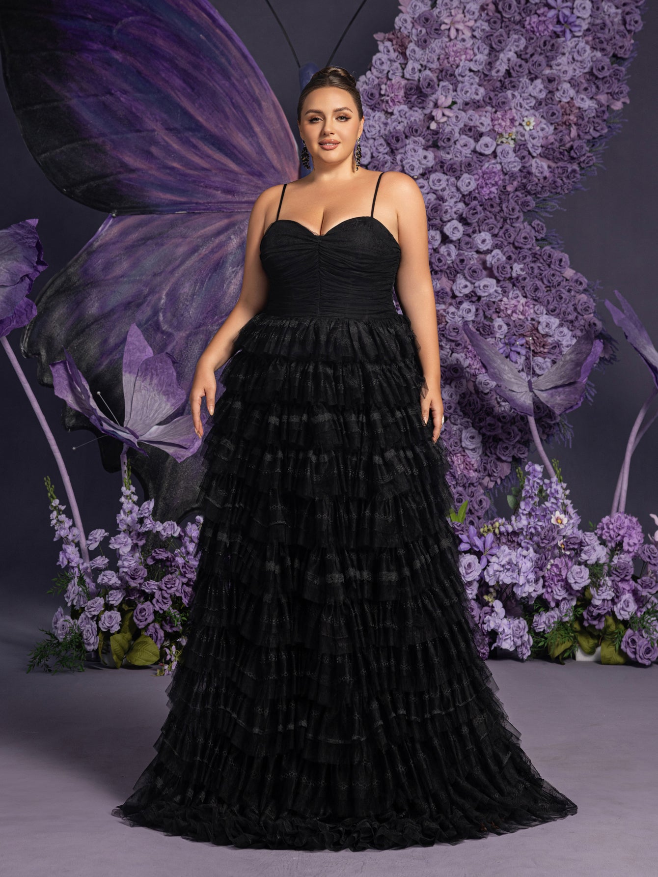 Capture the essence of elegance with this exquisite ruffled lace-up spaghetti strap gown. This glamorous dress features a delicate lace-up back and dainty spaghetti straps, ensuring a perfect fit and highlighting your silhouette. The fitted bodice is adorned with intricate detailing, while the skirt flows into multiple tiers of soft ruffles, creating a romantic and enchanting effect. The gown's A-line silhouette with a tulle skirt makes it perfect for making a grand entrance at weddings, evening galas, and other special occasions.