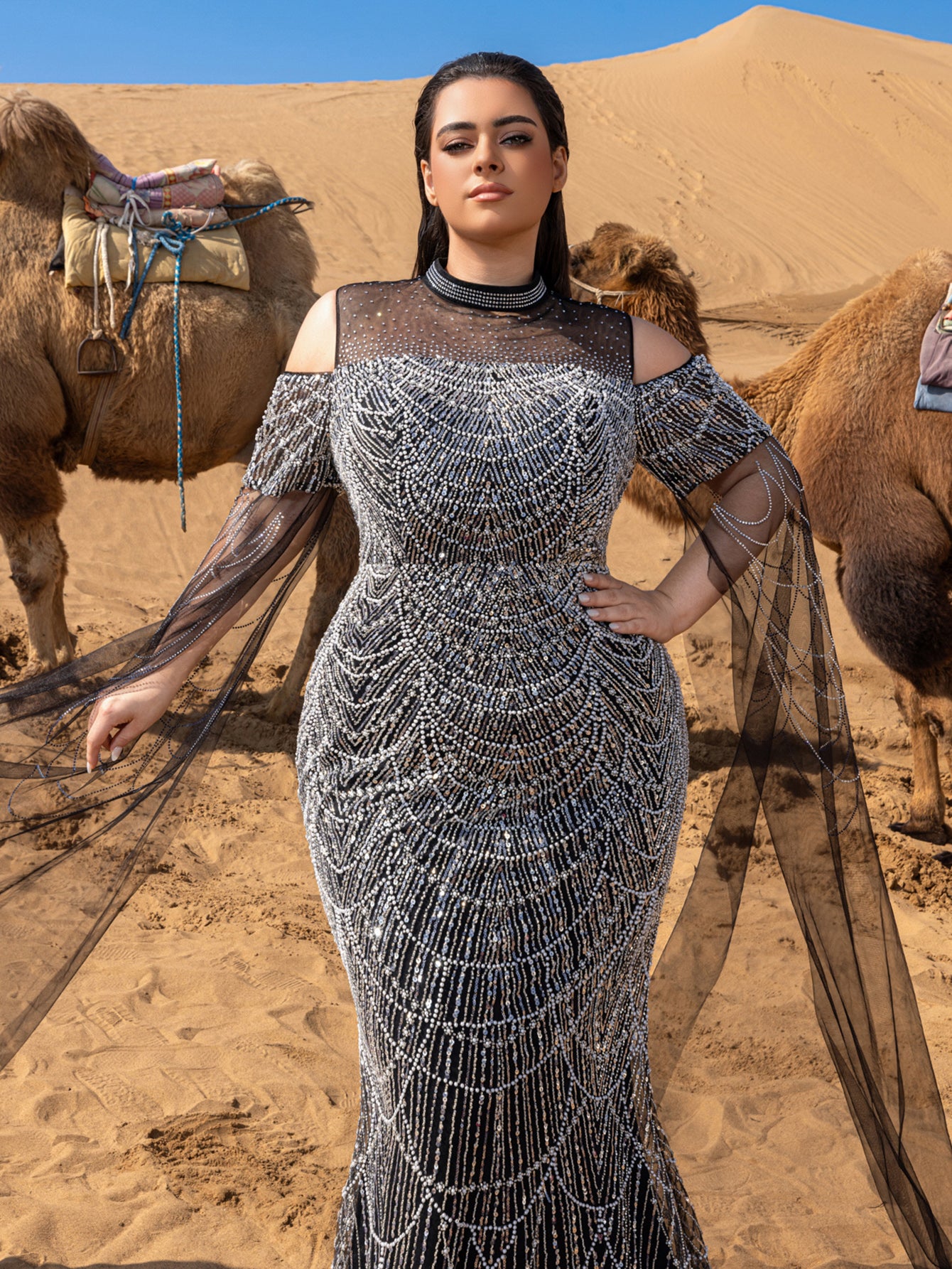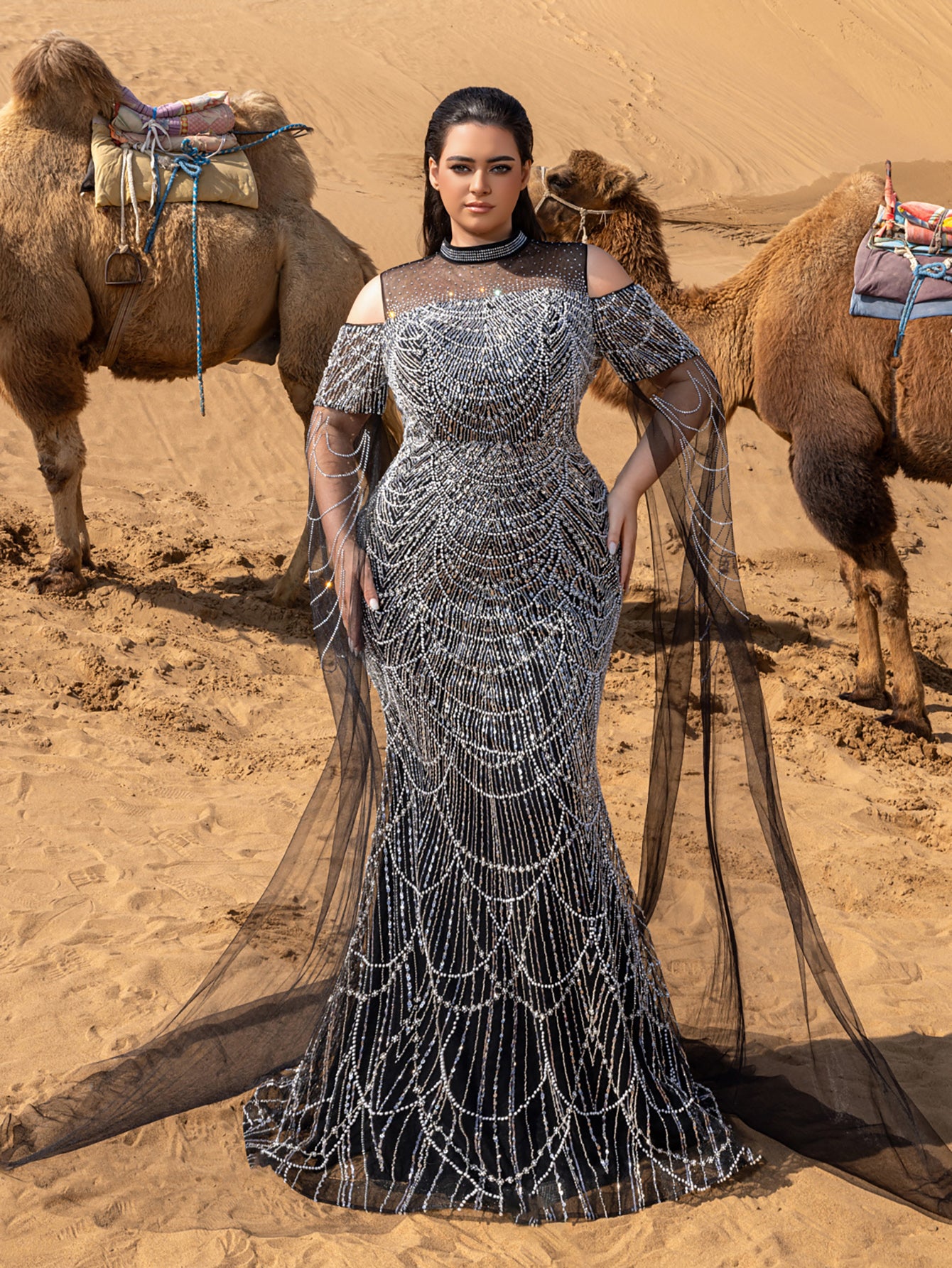 Step into elegance with this ethereal evening gown, designed to capture the essence of grace and sophistication. This gown is meticulously adorned with intricate beadwork and shimmering sequin patterns that cascade down the fitted silhouette, creating a delicate, draped effect reminiscent of falling stars. The high illusion neckline and cold-shoulder cut add a modern twist, while the sheer, flowing cape sleeves bring an enchanting touch, moving gracefully with each step.