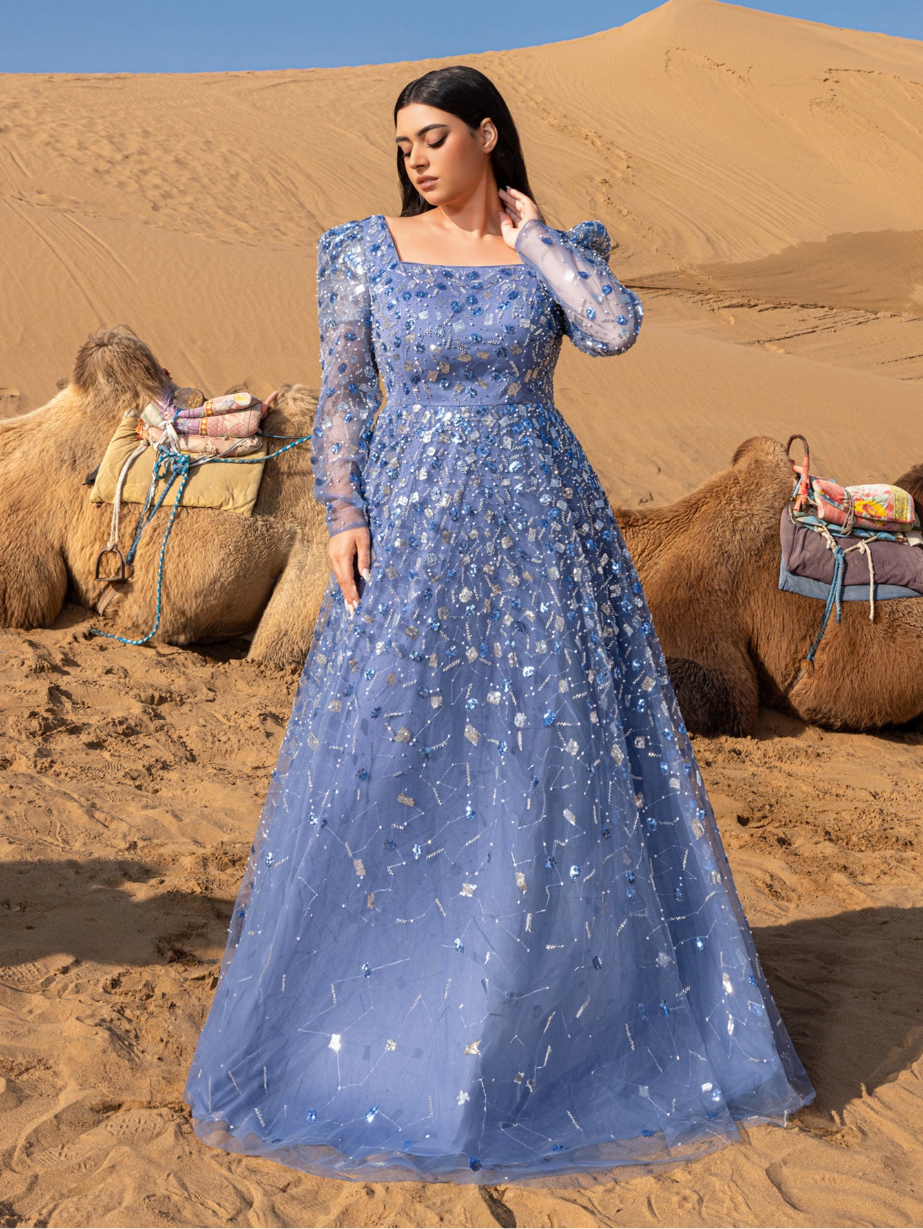 Channel the beauty of a clear night sky in this dazzling gown, perfect for those who seek a balance of elegance and enchanting style.