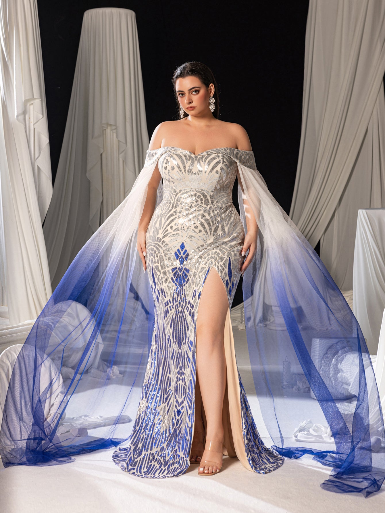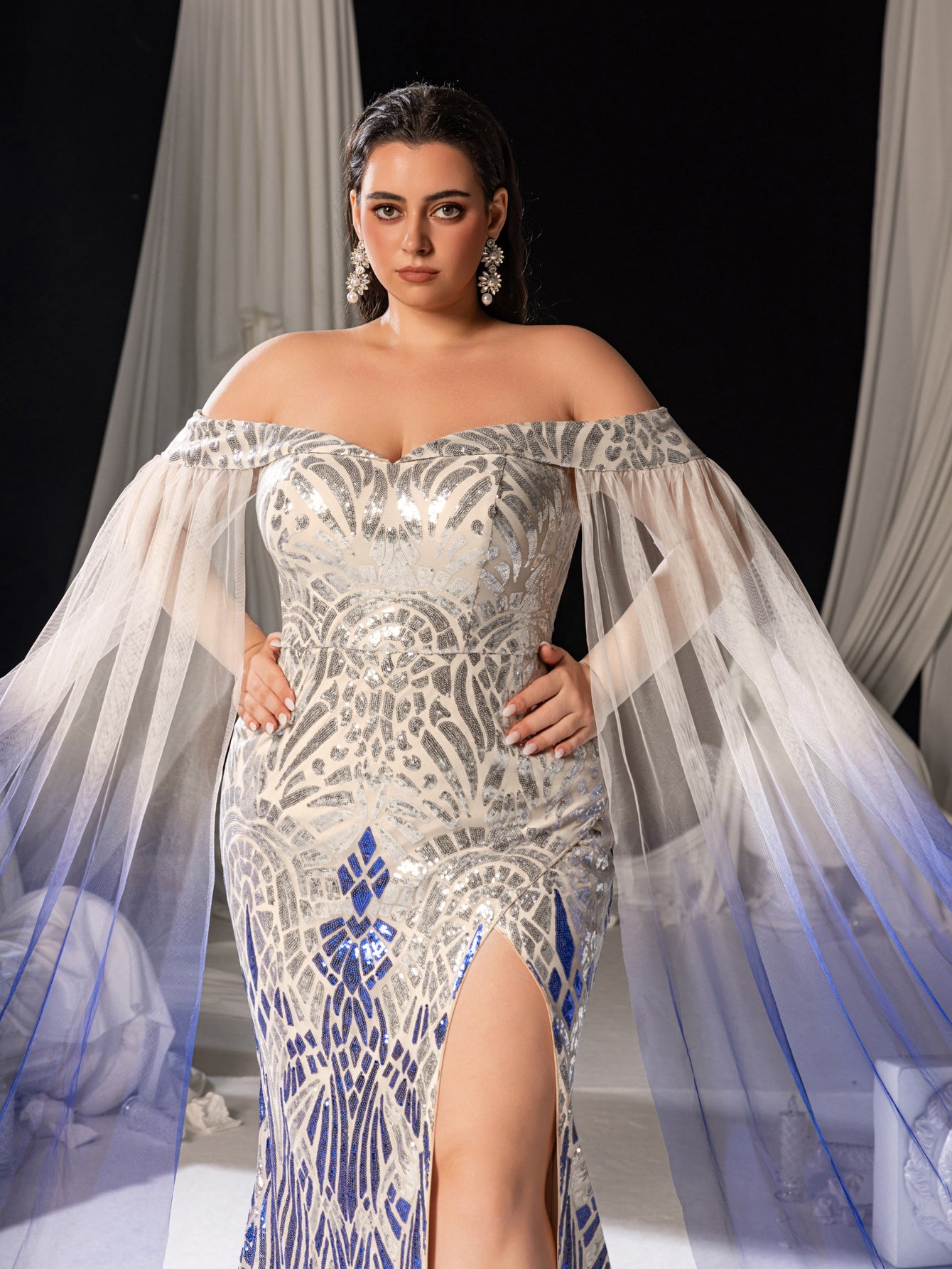 Crafted for timeless elegance, this sequined evening gown blends translucent tulle sleeves with intricate floral sequin along a dramatic high slit, creating a bold yet sophisticated statement. The mermaid silhouette accentuates curves gracefully, every shimmering detail evoking luxury and allure.